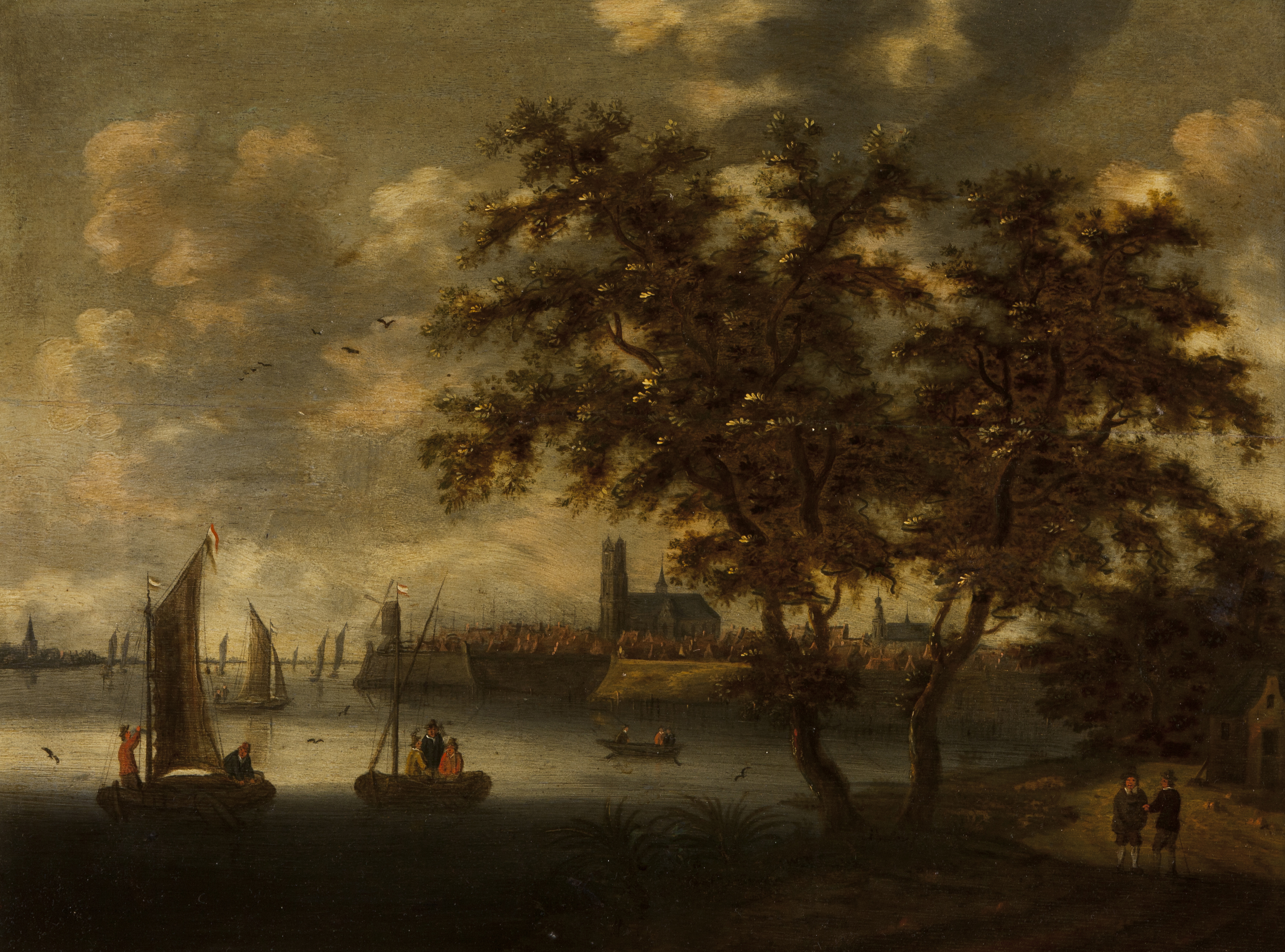 Vista de cidade com rio, barcos e figuras