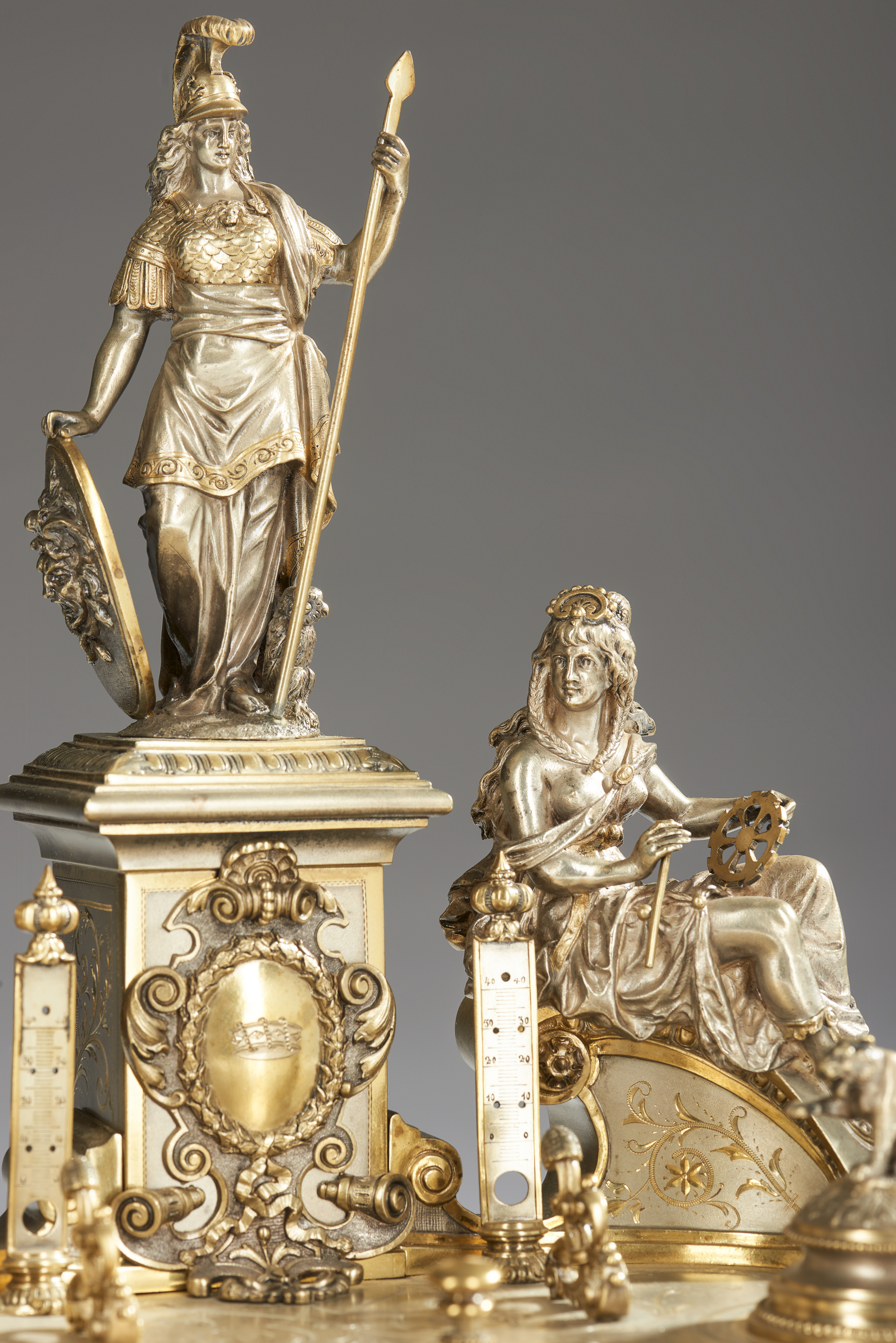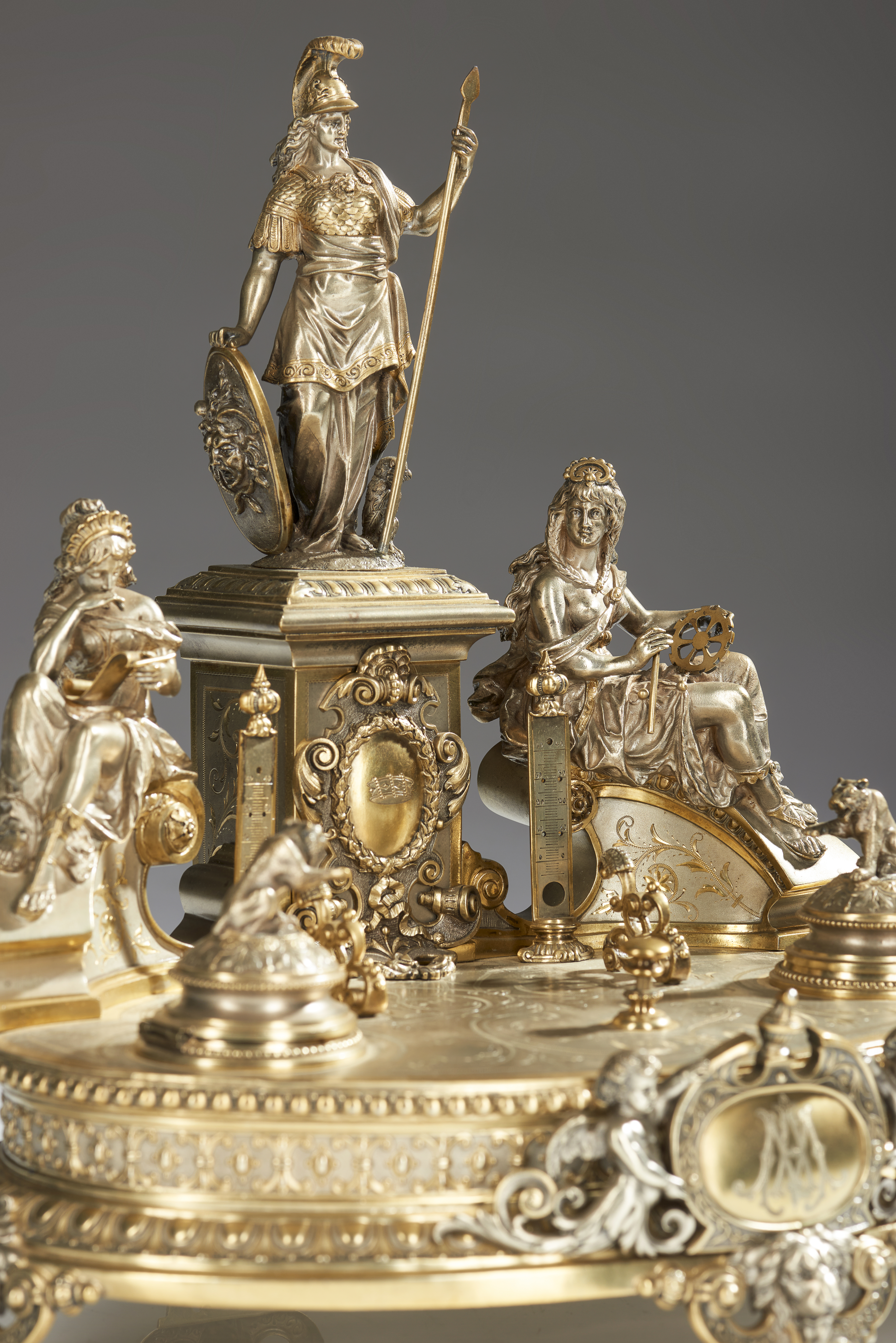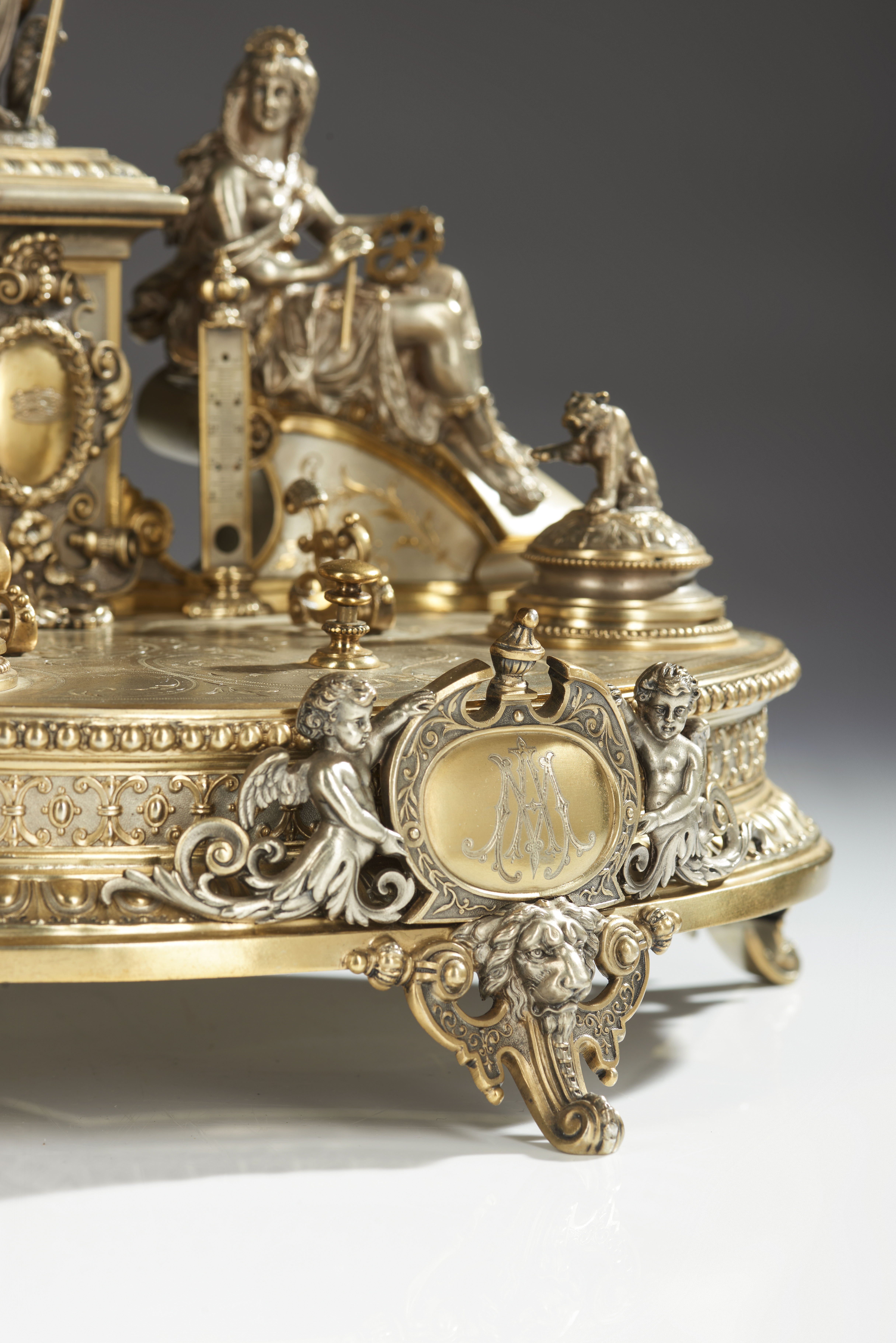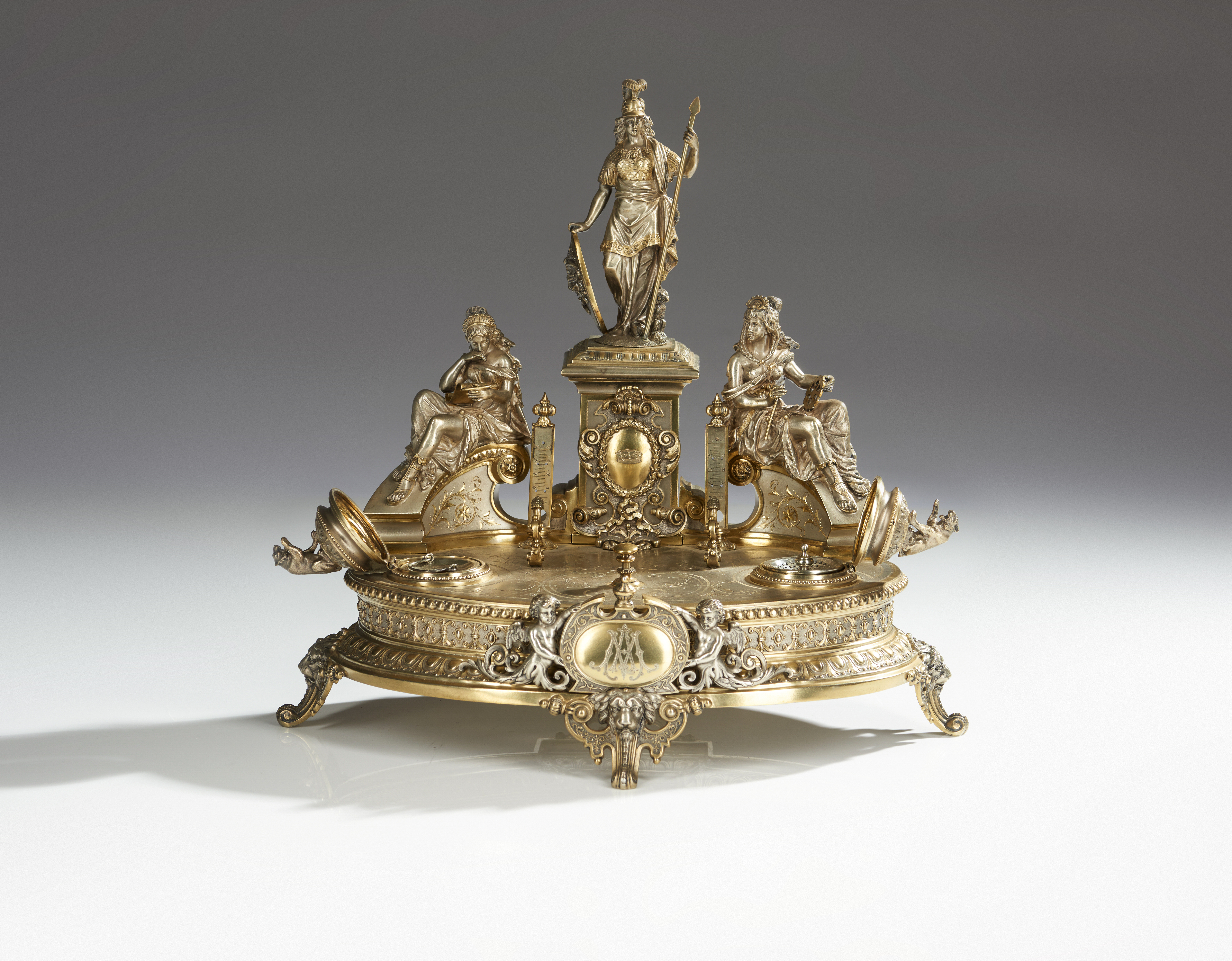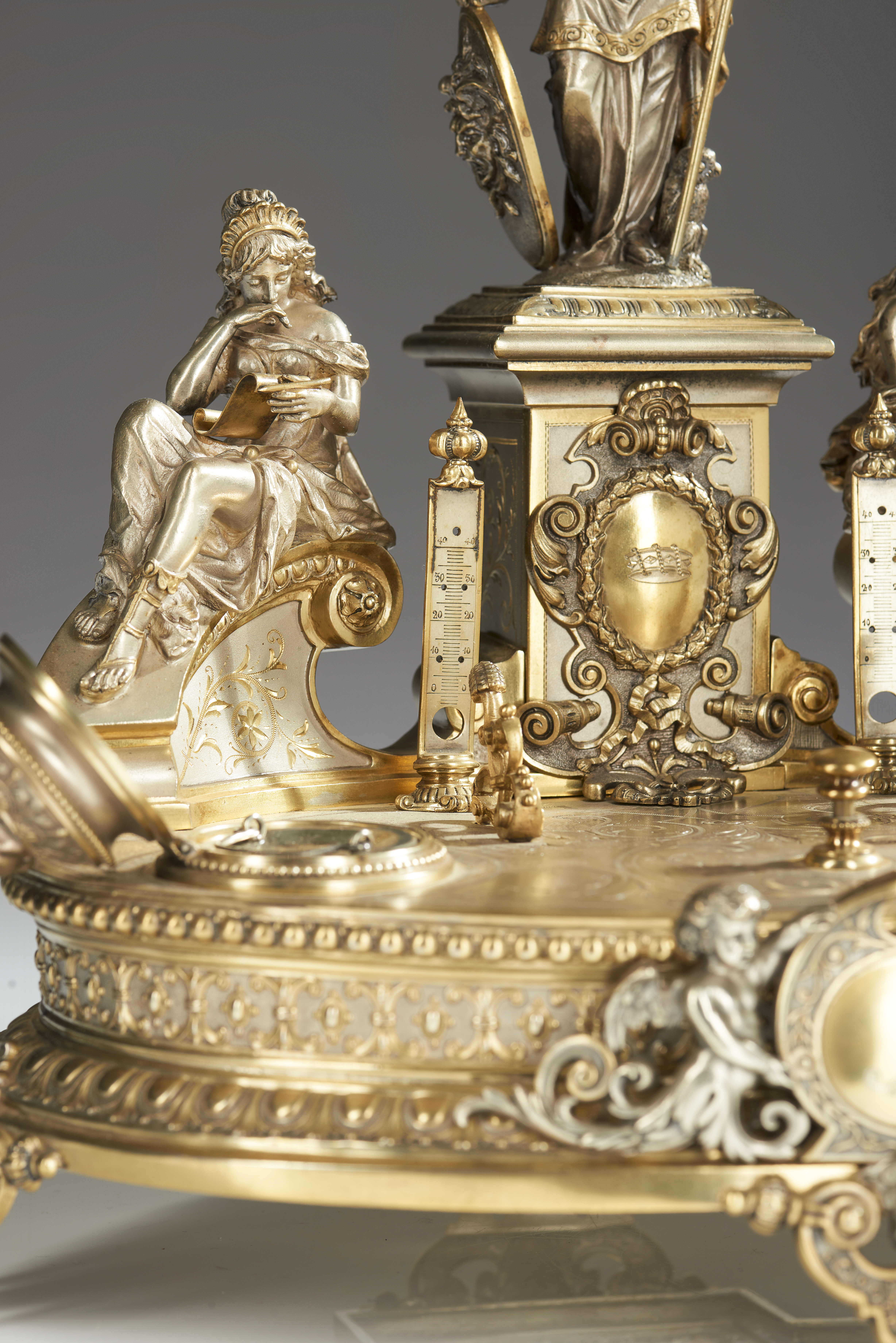 Composta por: tinteiro, areeiro com tampas rematadas por leoas, dois termómetros, descanso para penas e campainha