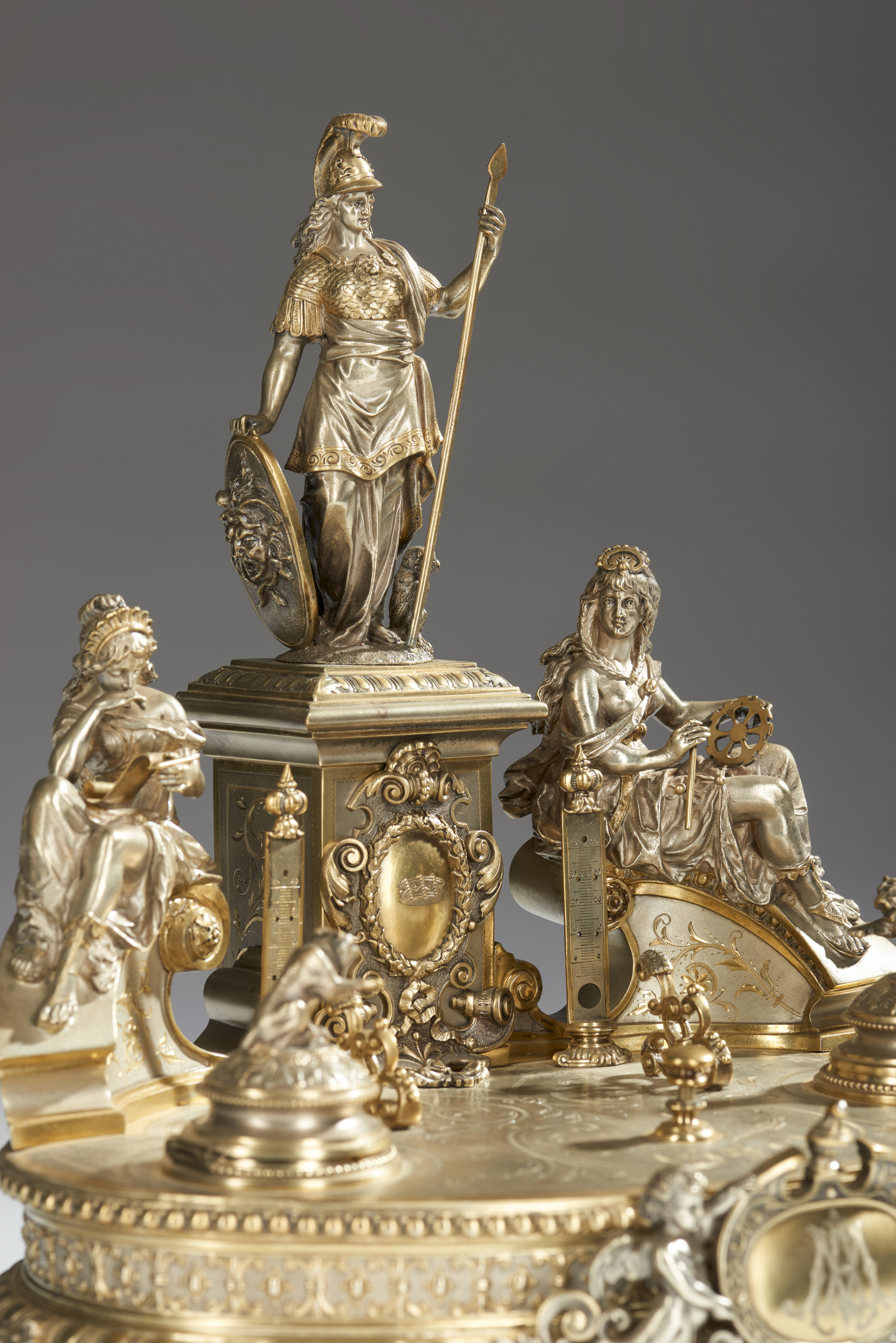 Plinto central encimado por Minerva ladeada pelas deusas dos ofícios e das letras.