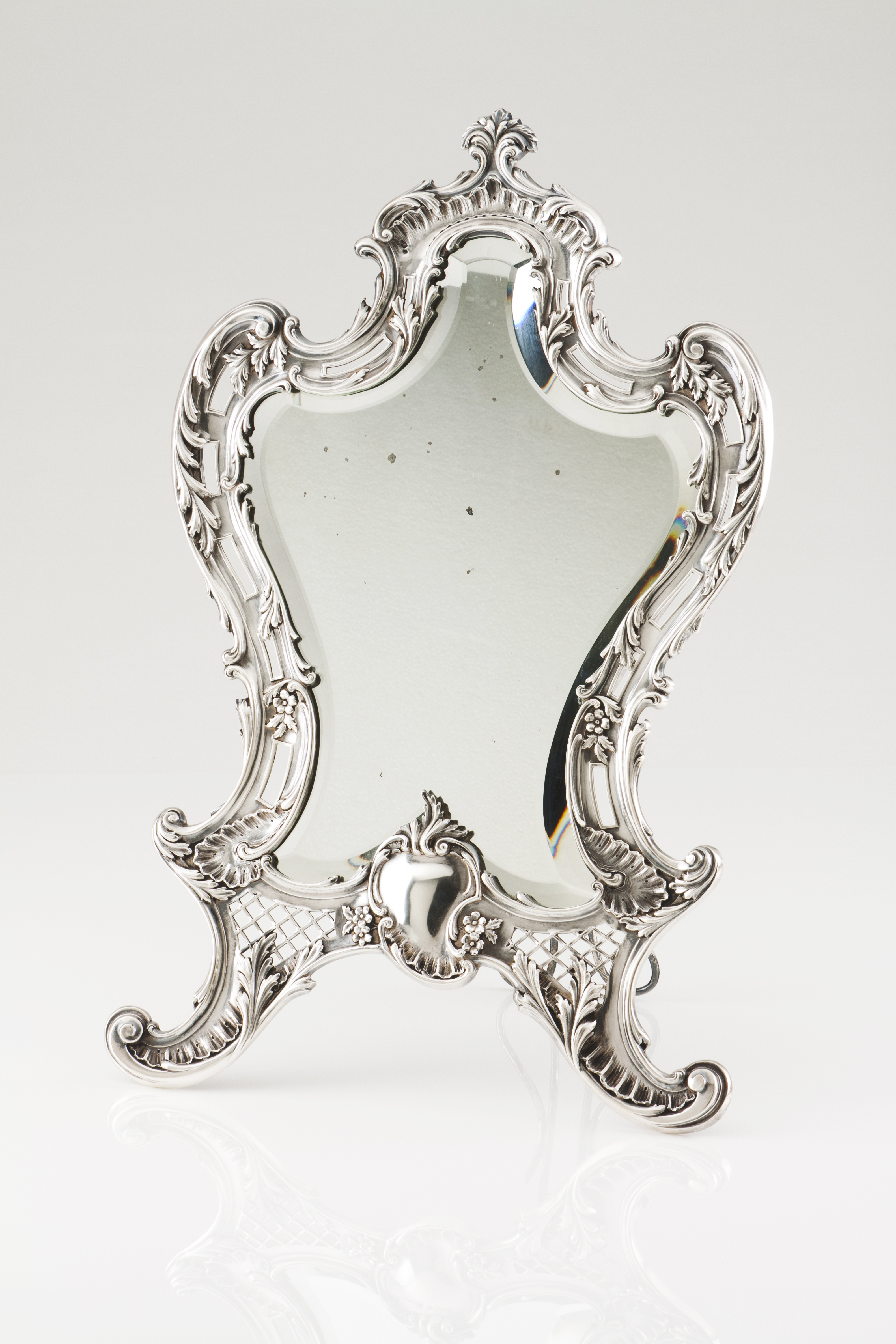 Decoração romântica, vazada e relevada com motivos vegetalistas e reserva lisa na base, assente em pés com enrolamentos e acantos