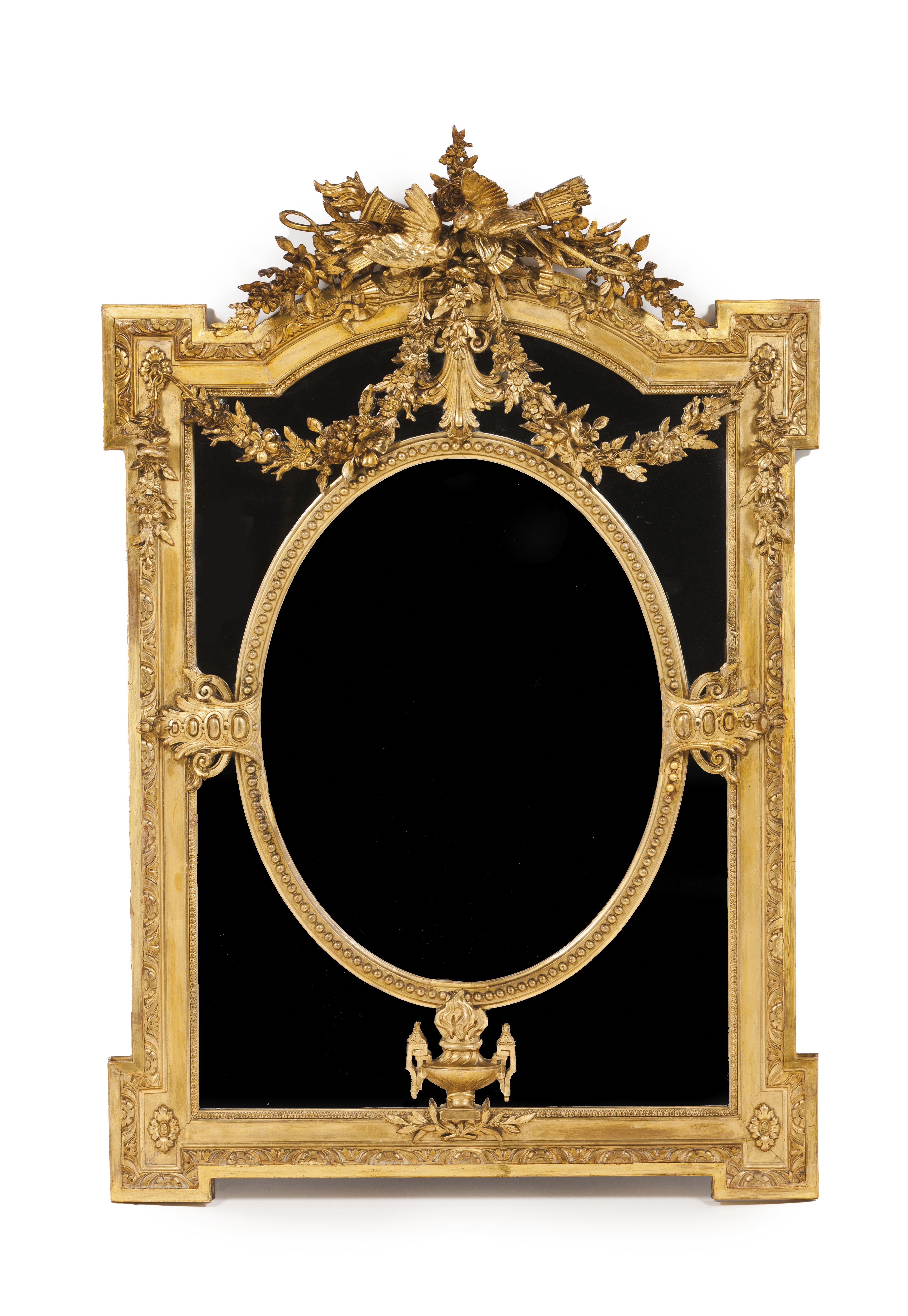 Decoração relevada com motivos florais e cimalha com troféu ao centro