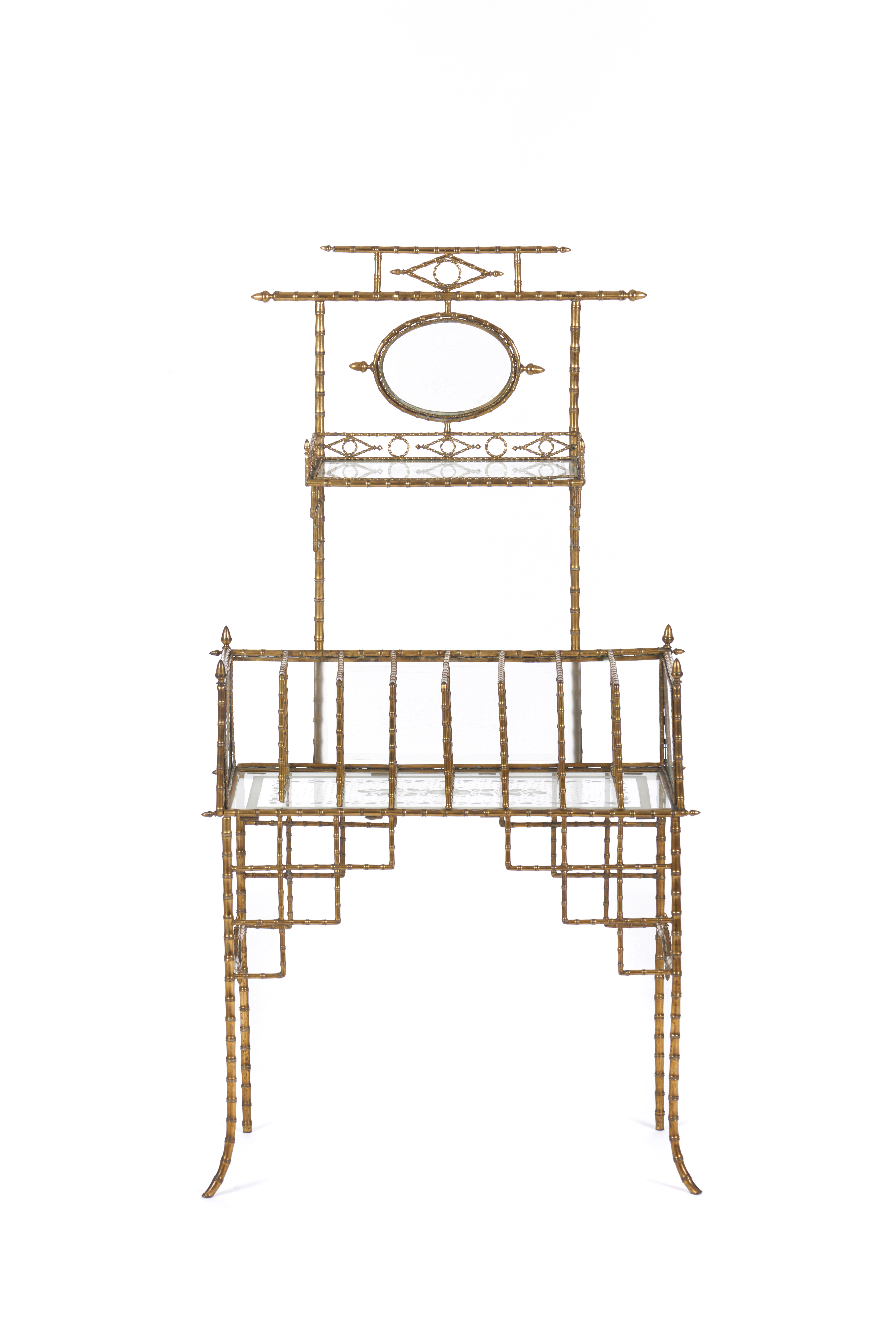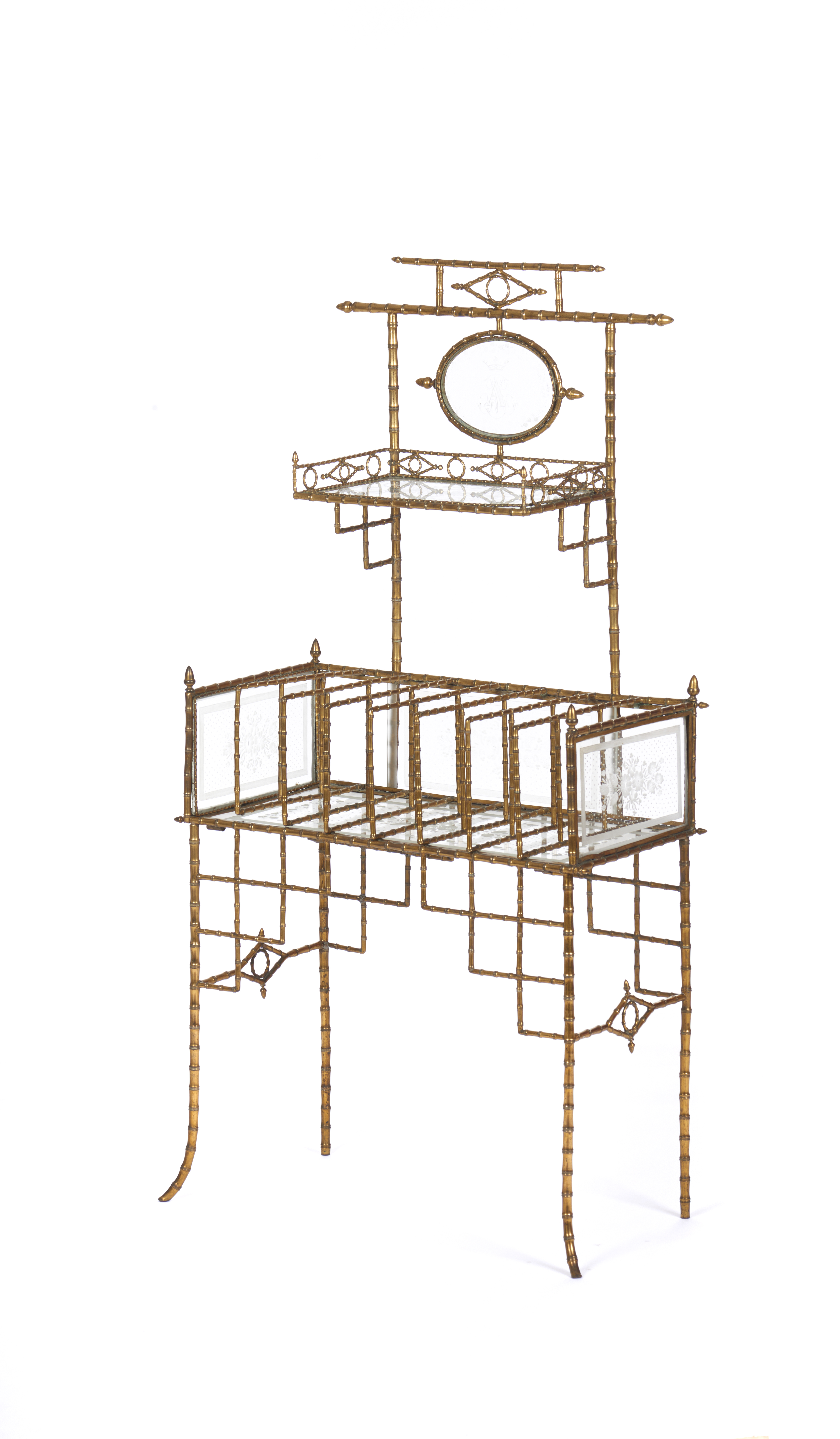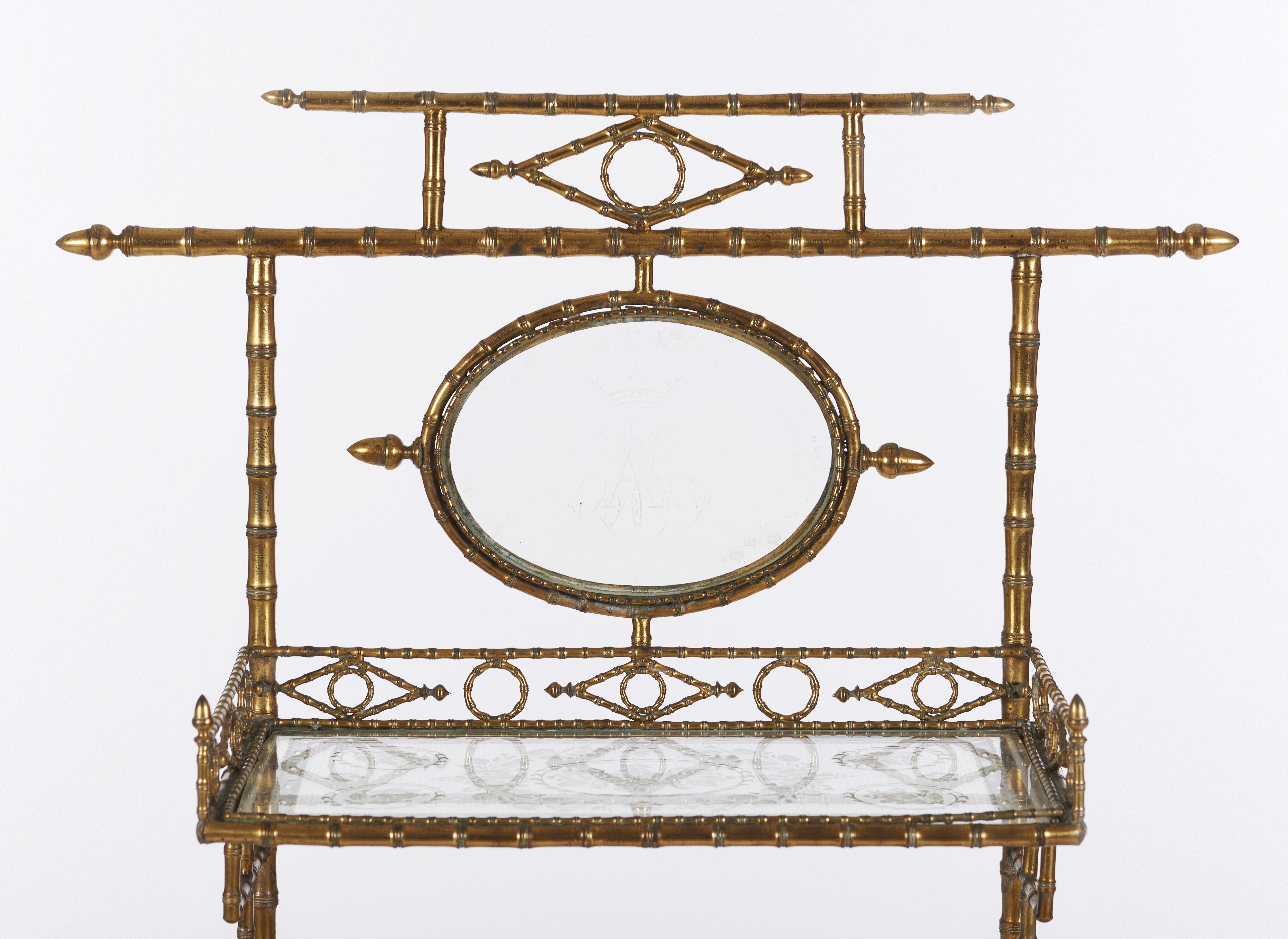 Tampos e laterais em vidro com decoração gravada a ácido representando motivos vegetalistas e um medalhão no topo representando monograma encimado por coroa de marquês