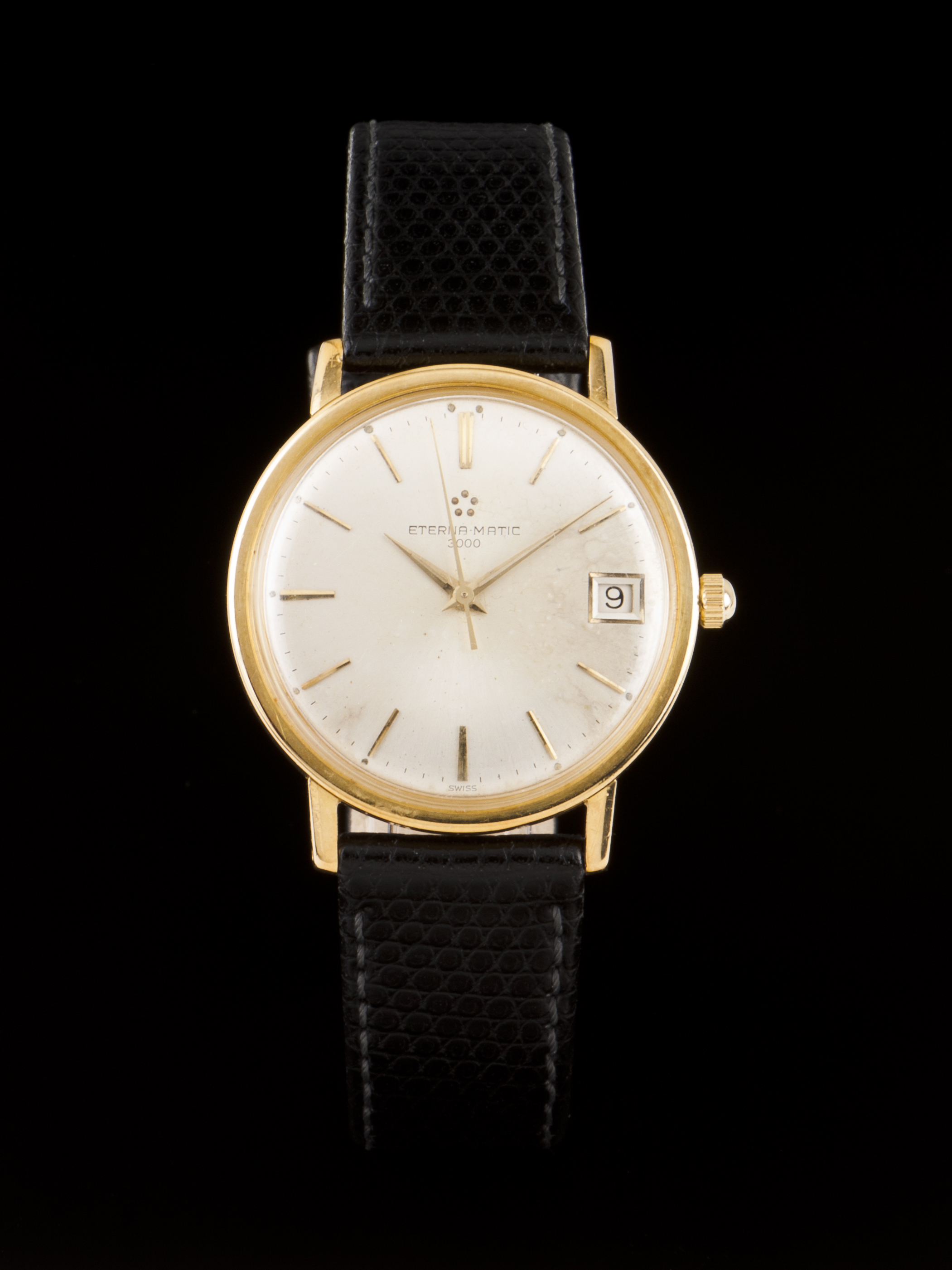 Relógio Eterna Matic, modelo 3000 de homem com caixa em ouro de (750/000) com 34mm de diâmetro sem contar a coroa. Movimento automático com data e segundos ao centro.
