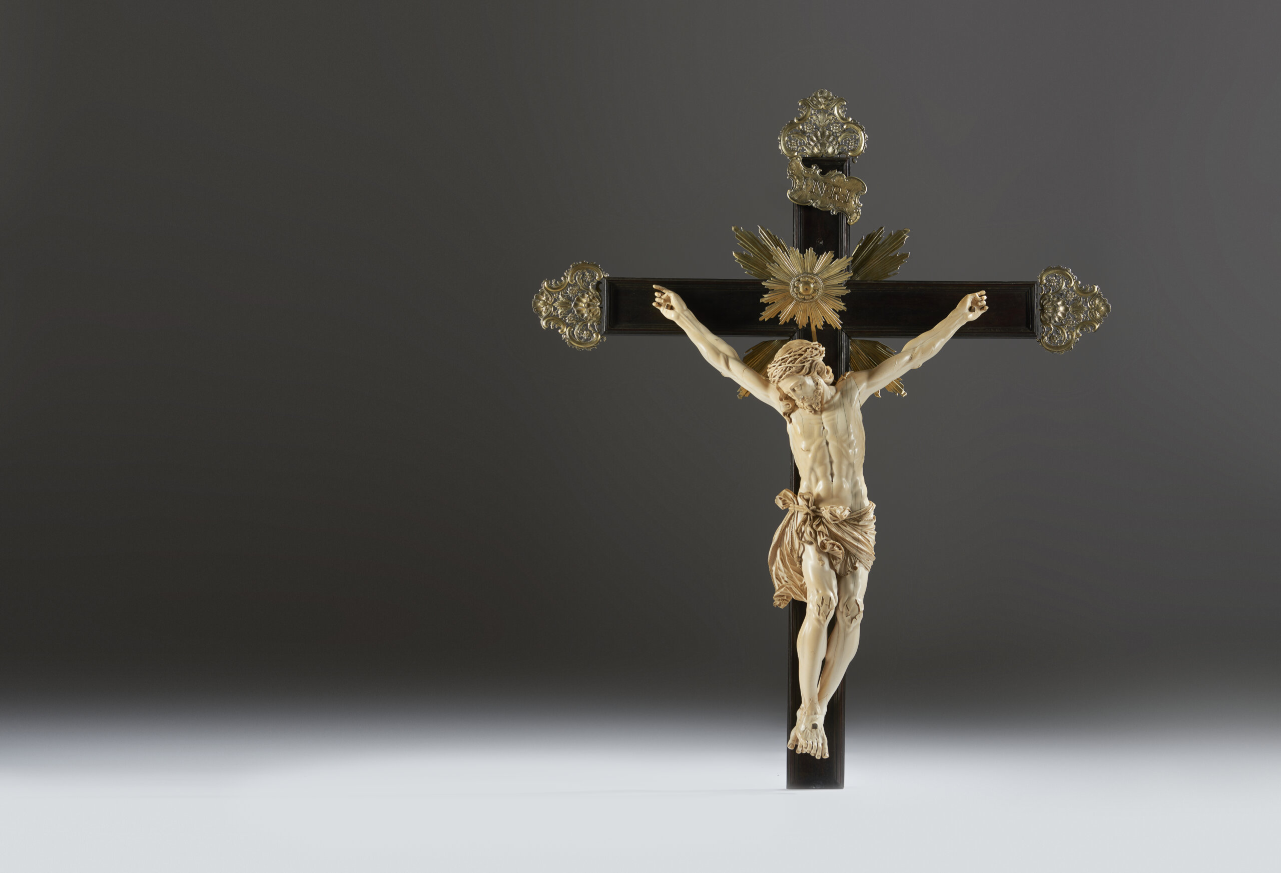 Uma maior estilização de certos elementos anatómicos, como as veias e as chagas em forma de estrela, bem como o decorativismo do cabelo ondulado, sugerem uma datação já setecentista. Uma análise atenta da gramatica ornamental usada na cruz reforça esta cronologia. Executada em ébano com simples modenaturas, apresenta elementos em prata dourada: terminais nas extremidades dos braços, um resplendor quadripartido na intersecção exterior de cada braço e um resplendor quadrado sobre a cabeça de Cristo. O resplendo é cinzelado com um friso de pétalas, enquanto os terminais vazados e recortados são polilobados e ricamente decorados com palmetas em forma de concha e enrolamentos de túlipas e outras flores estilizadas, e estreitas folhas de acanto. Os elementos em “C”, usados a par da gramática floral típica da Europa dos inícios de Setecentos - sobretudo em França durante a Régence (1715-1723) -, contrastam com o incipiente ornamento rocaille (c. 1710-1760) do titulum crucis. A tipologia e execução dos elementos em prata apontam também para uma origem napolitana, reforçando a atribuição quer da cruz quer da escultura em marfim ao mesmo centro de produção (veja-se Catello, Catello 1973). Um exemplar comparável, embora muito mais pequeno (26,5 cm de altura), no Victoria and Albert Museum, Londres (inv. A.20-1949), conserva grande parte da policromia e do douramento originais, tendo sido nos últimos anos erradamente identificado como indo-português (veja-se Trusted 2013, p. 379, cat. 375). Tal como o nosso Crucifixo, a cabeça de Cristo pende para o ombro direito, e está de olhos fechados, e com o pé direito pregado sobre o esquerdo. Não só a posição é idêntica, como o tratamento da corda, do cendal ondulante e das veias salientes revela afinidades notáveis. As grandes esculturas devocionais em marfim produzidas no virar do século XVIII têm despertado recentemente grande entusiasmo no mercado de arte. Em 2024, o Louvre adquiriu em leilão uma importante escultura em marfim (54,5 cm de altura) de Nossa Senhora da Conceição (inv. RFML.OA.2024.9.1), executada em Nápoles por Claude Beissonat. É previsível que o nosso monumental Crucifixo venha a suscitar idêntico interesse. Infelizmente, como tantas vezes sucede com obras-primas em marfim deixadas sem assinar, o nome do entalhador responsável por este extraordinário Crucifixo permanece desconhecido; a própria obra, porém, proclama a sua extraordinária maestria.