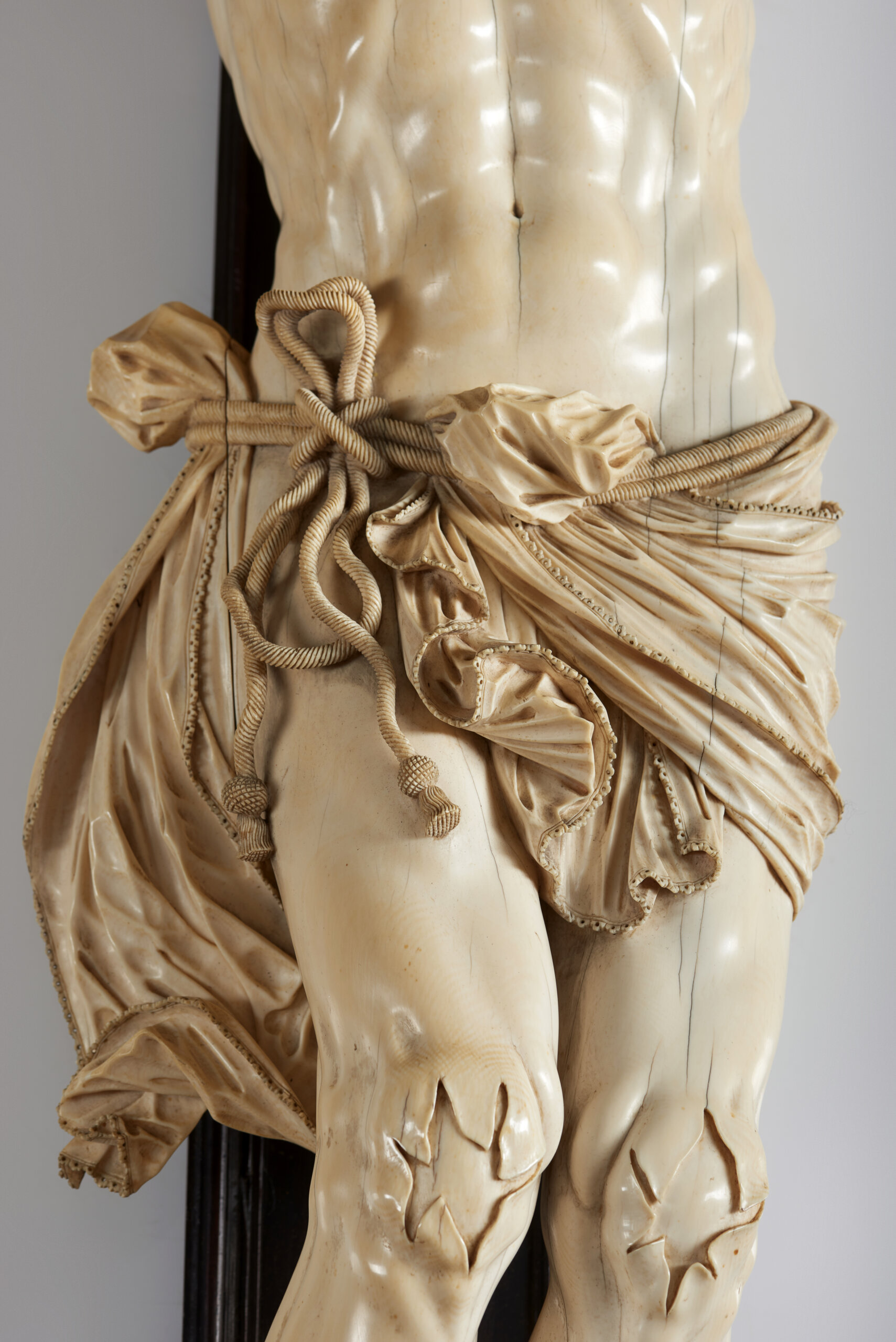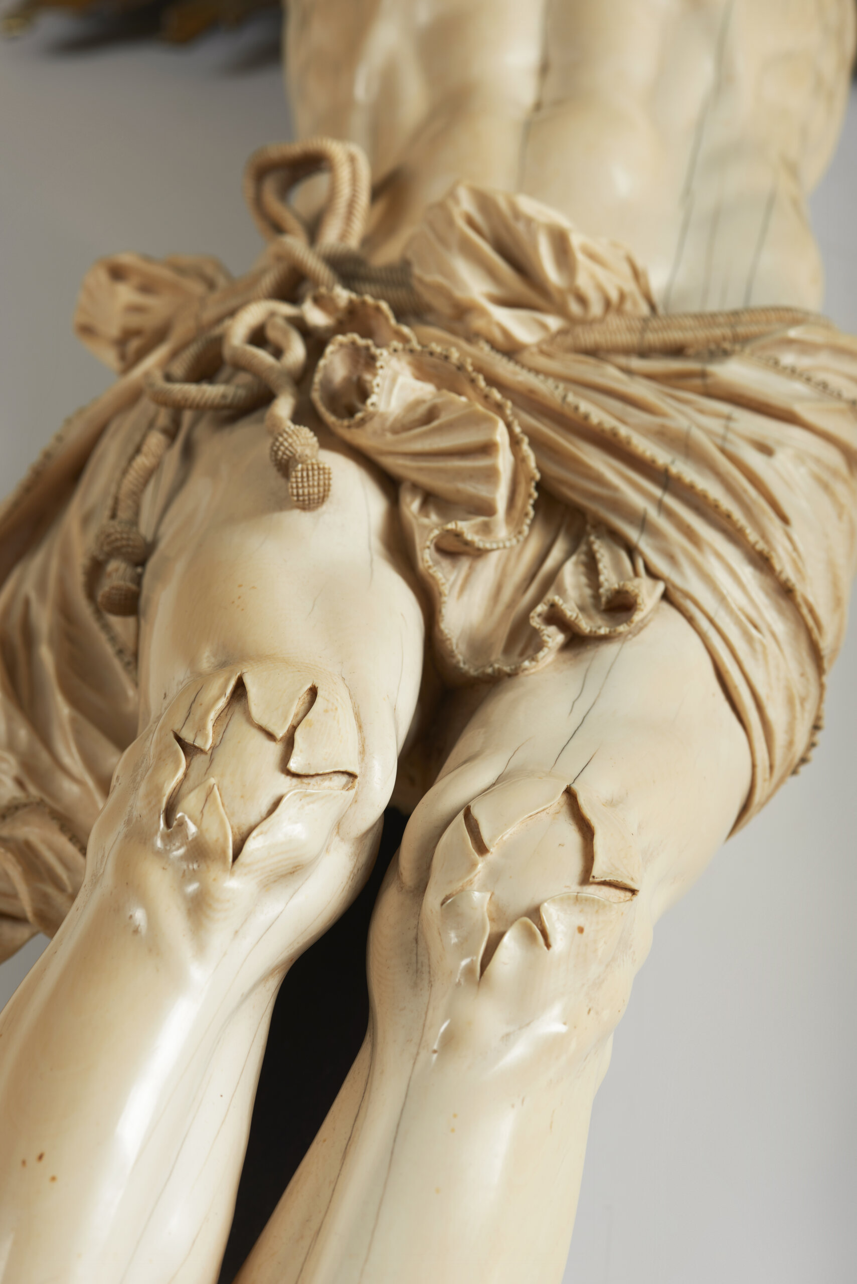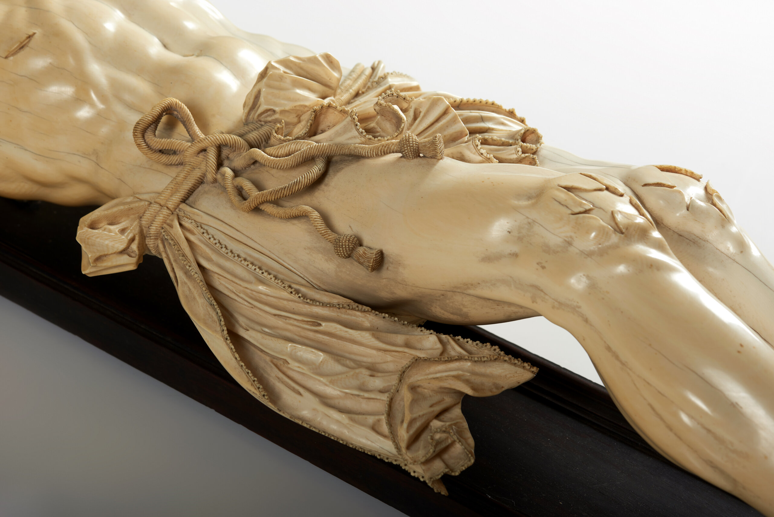 Considerado um material precioso desde a Antiguidade, o entalhe de marfim, após um declínio nos séculos XV e XVI, conheceu na Europa renovado brilhantismo nos séculos XVII e XVIII, impulsionado pelo recrudescimento do comércio e pela crescente disponibilidade de marfim africano de alta qualidade e de grandes dimensões (veja-se Schmidt, Sframeli 2013). Esculpida em marfim de elefante, esta monumental imagem de Cristo Crucificado foi executada em diferentes secções. A peça maior, aproveitando a curvatura natural da presa, compreende o corpo de Cristo - a cabeça com sua coroa de espinhos integral, as pernas e os pés. Os braços estendidos e em ângulo foram entalhados separadamente e fixados ao corpo através de modos tradicionais de assemblagem de madeira, em concreto a união de furo e respiga, sendo a parte saliente do cendal do lado esquerdo unida do mesmo modo. Representando com minúcia a ossatura, a musculatura e as veias de Cristo, o mestre entalhador recriou na perfeição o seu corpo no exacto momento da morte. A cabeça de Cristo inclina-se para a direita, tombando sobre o peito e repousando no ombro, com as pálpebras e a boca firmemente cerradas. Os dedos, ainda em parte contraídos, exprimem os últimos instantes de dor antes da libertação pela morte. O cendal ou perizonium, atado do lado direito de Cristo e adensado em profundas e abundantes pregas, enrola-se numa corda de largos e caprichosos laços e seus pingentes de borlas, sendo a fímbria rendilhada e vazada com extrema minúcia. Embora serena na expressão, a fisionomia de Cristo é bem vincada: as sobrancelhas ausentes, o nariz alongado, a barba entalhada em delicados caracóis e o cabelo representado quase que em mechas individuais. A coroa de espinhos estilizada e a corda enlaçada revelam um virtuosismo do entalhe em negativo que testemunha a superior mestria do entalhador. Também estilizadas são as grandes e invulgares chagas em forma de estrela nos joelhos e as veias salientes dos braços.