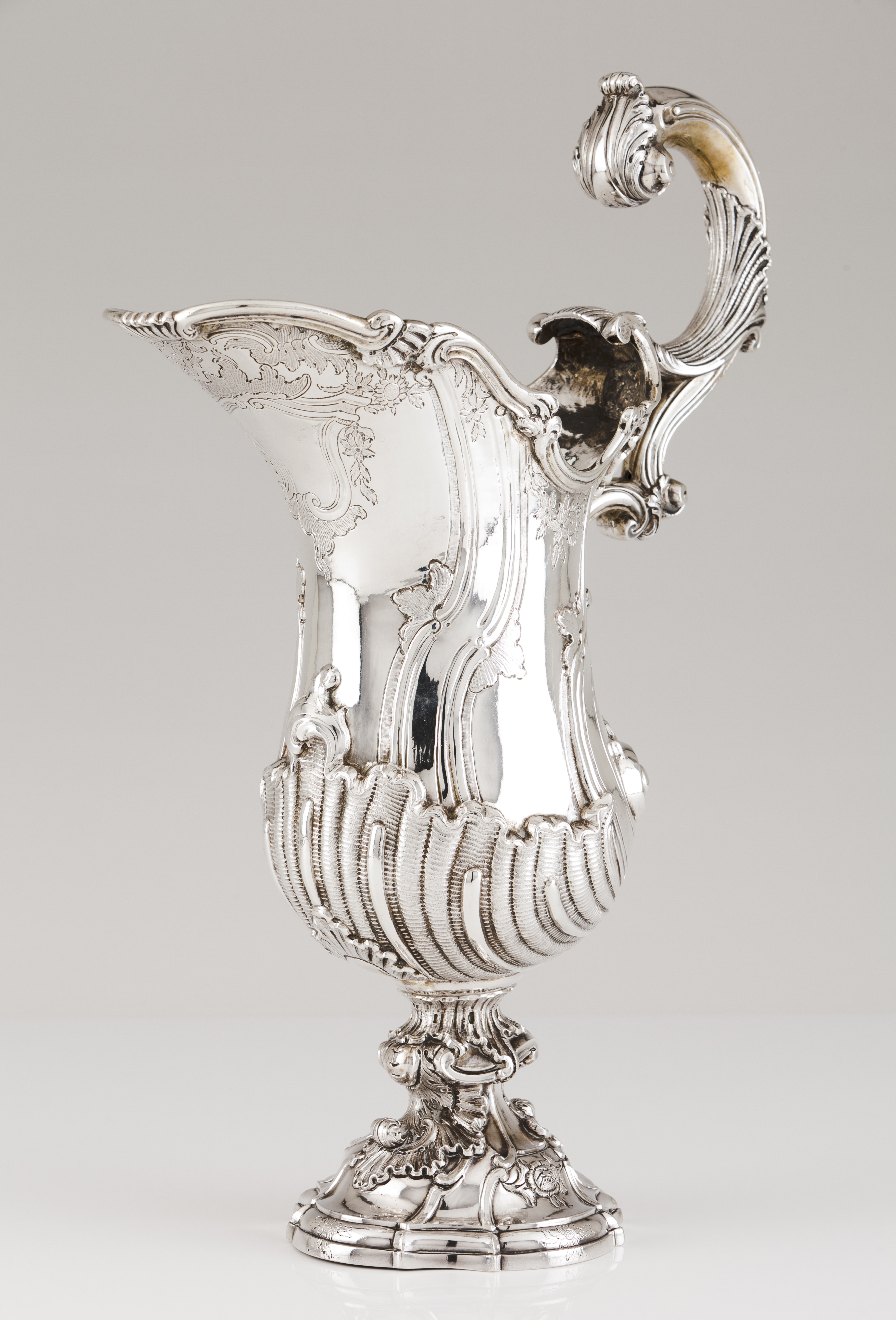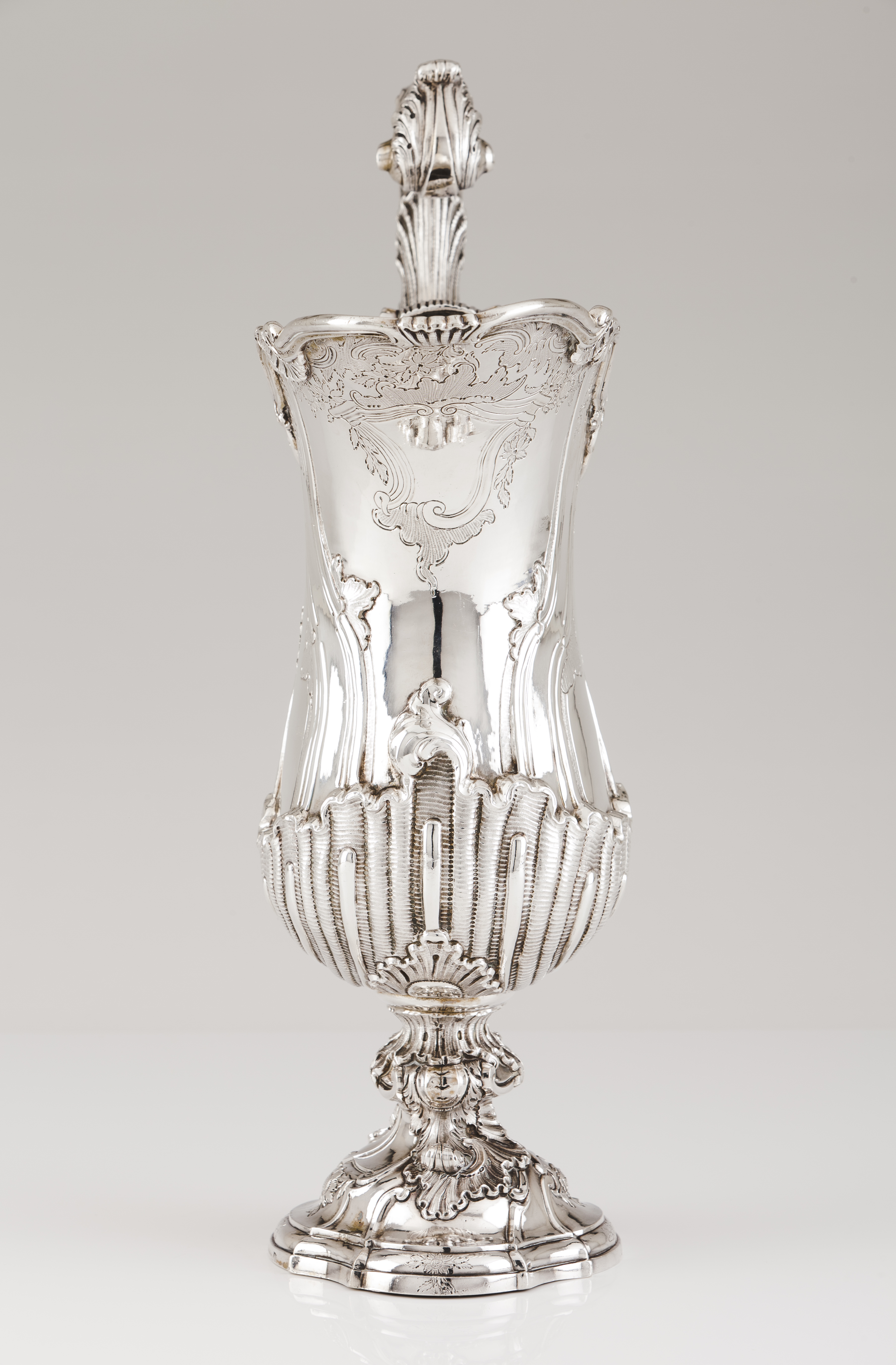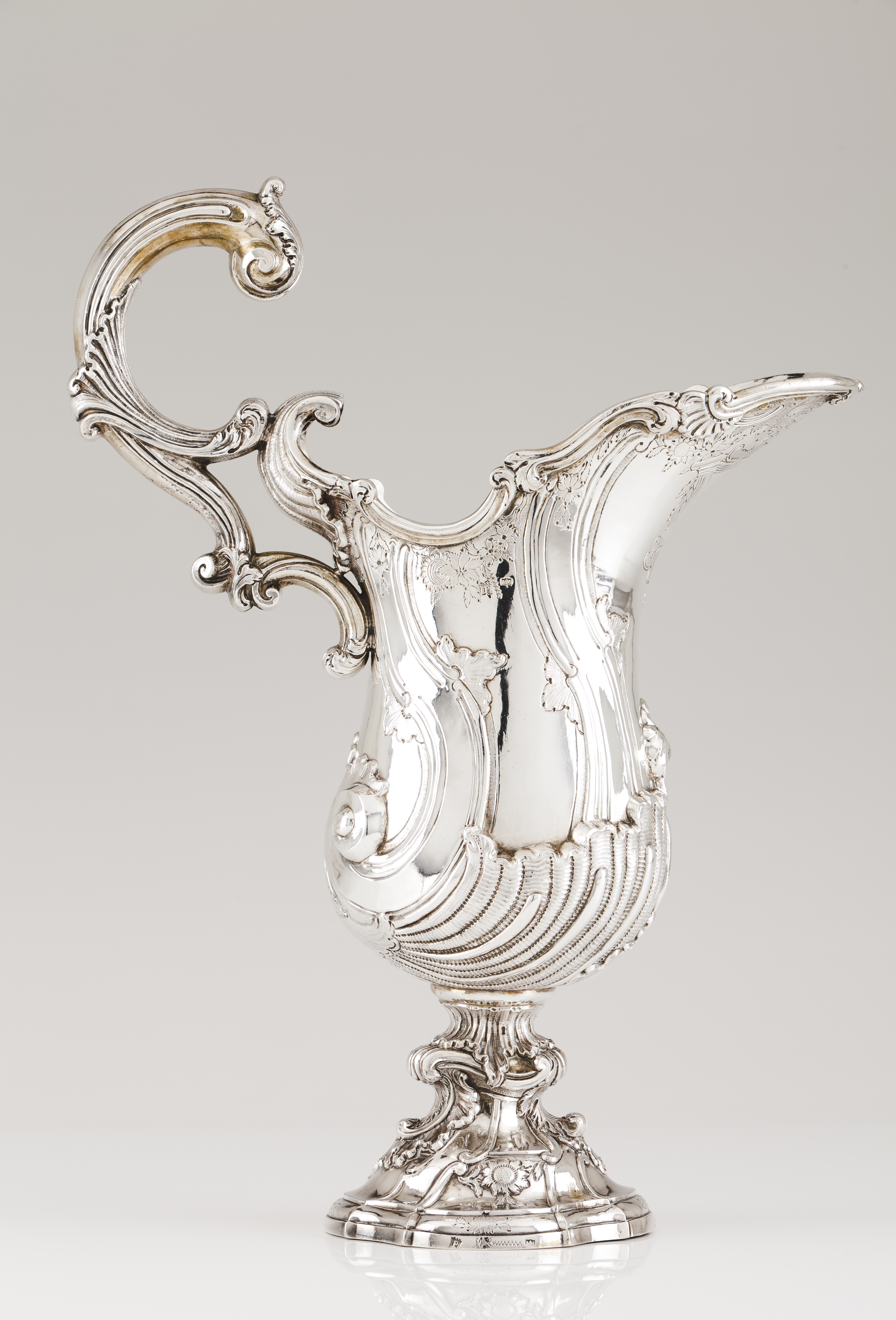 Corpo em forma de elmo invertido com profusa decoração repuxada e cinzelada, bico largo e recortado com moldura em aletas, parte inferior em concha, de onde partem estrias e nervuras assimétricas, interrompidas por voluta com concheados, decorado junto ao bordo por grinaldas gravadas e reserva assimétrica na parte inferior do bico