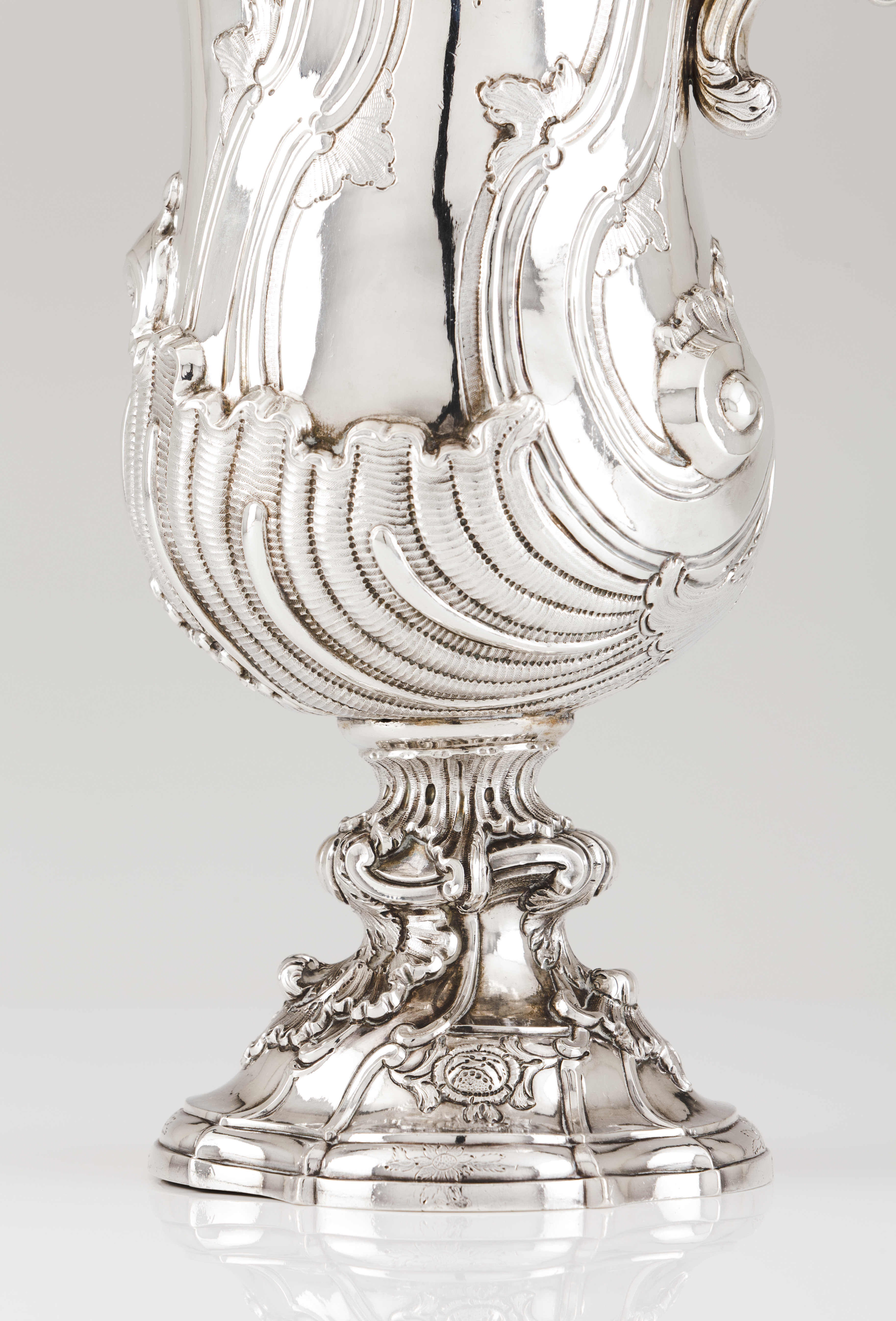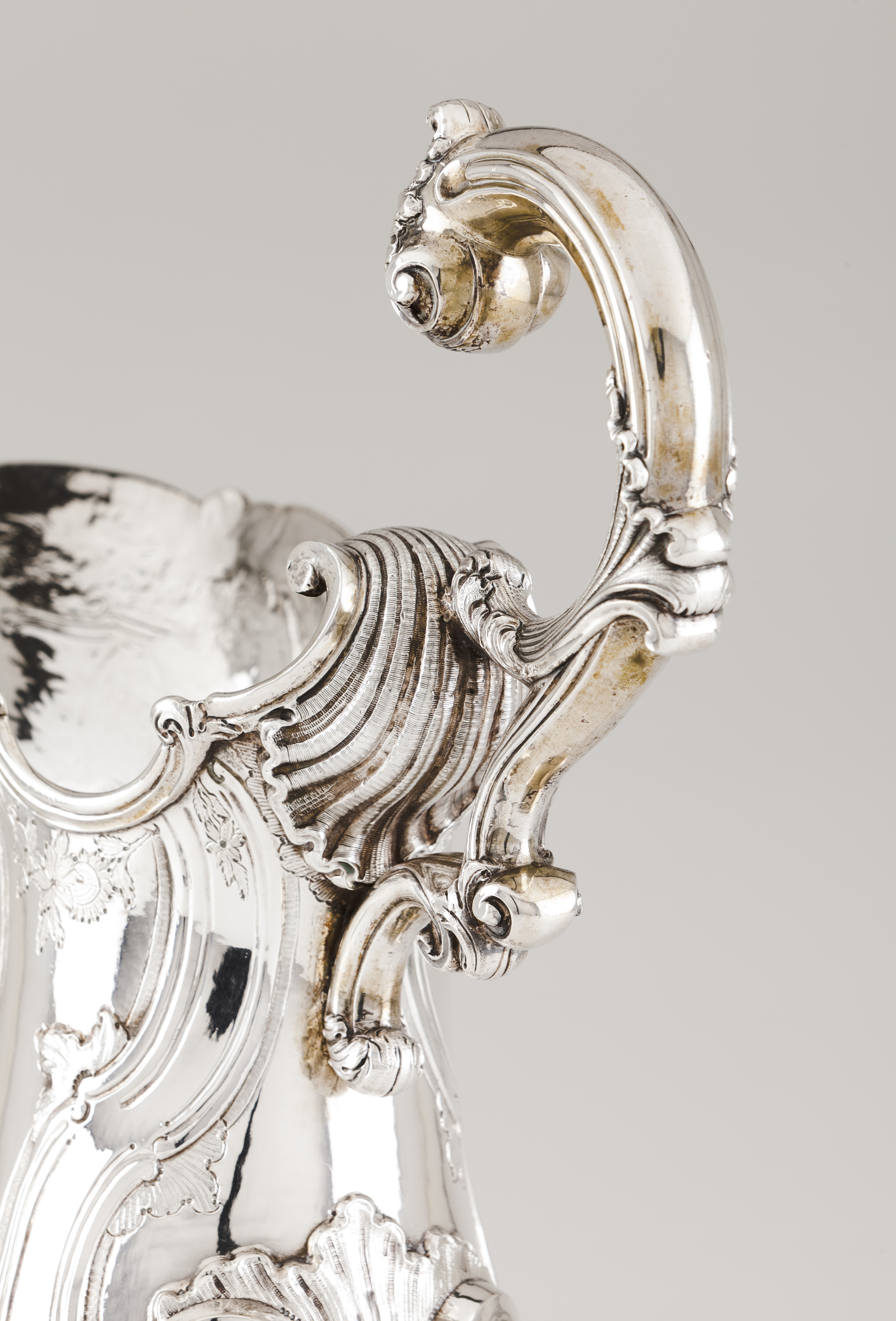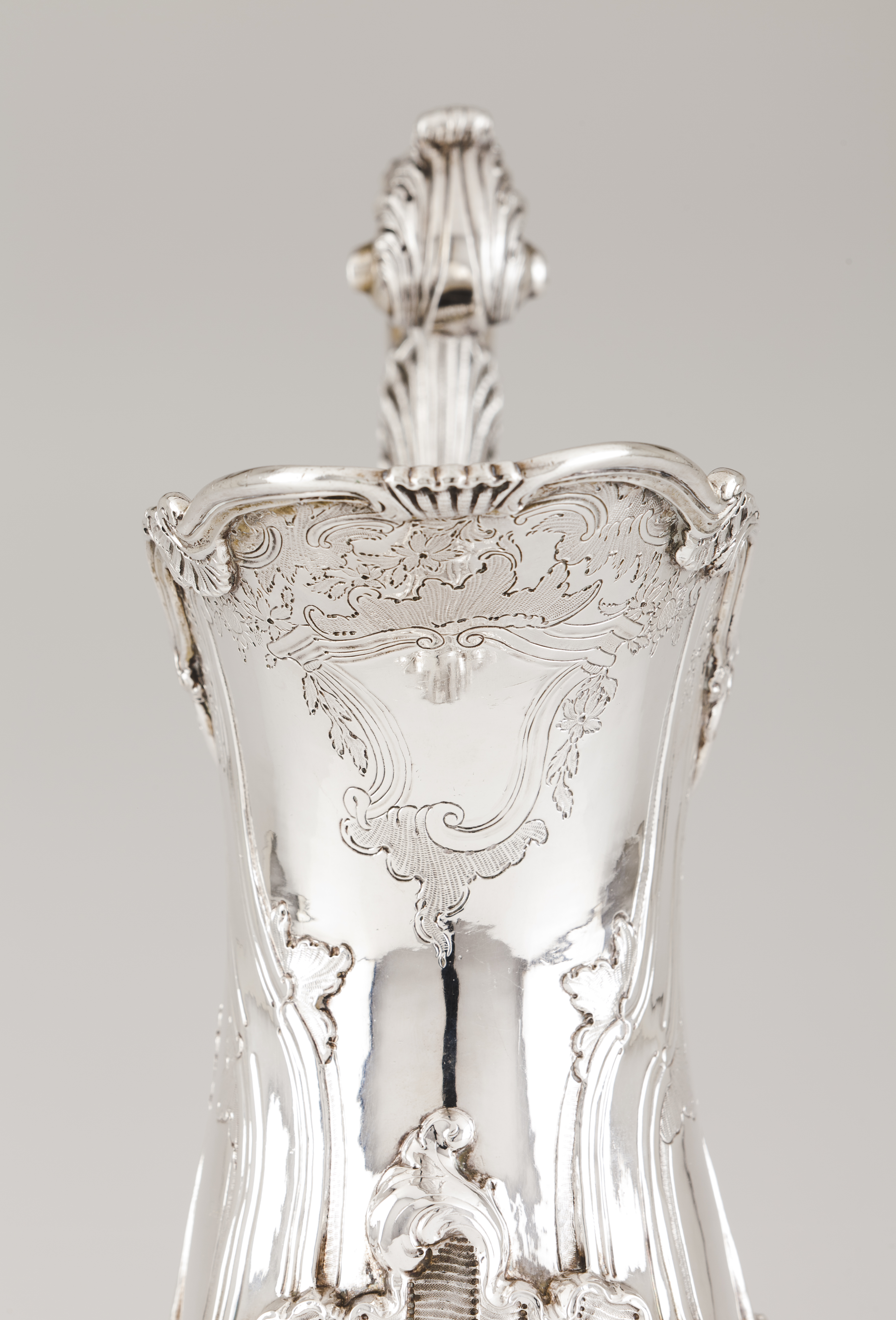 Corpo em forma de elmo invertido com profusa decoração repuxada e cinzelada, bico largo e recortado com moldura em aletas, parte inferior em concha, de onde partem estrias e nervuras assimétricas, interrompidas por voluta com concheados, decorado junto ao bordo por grinaldas gravadas e reserva assimétrica na parte inferior do bico