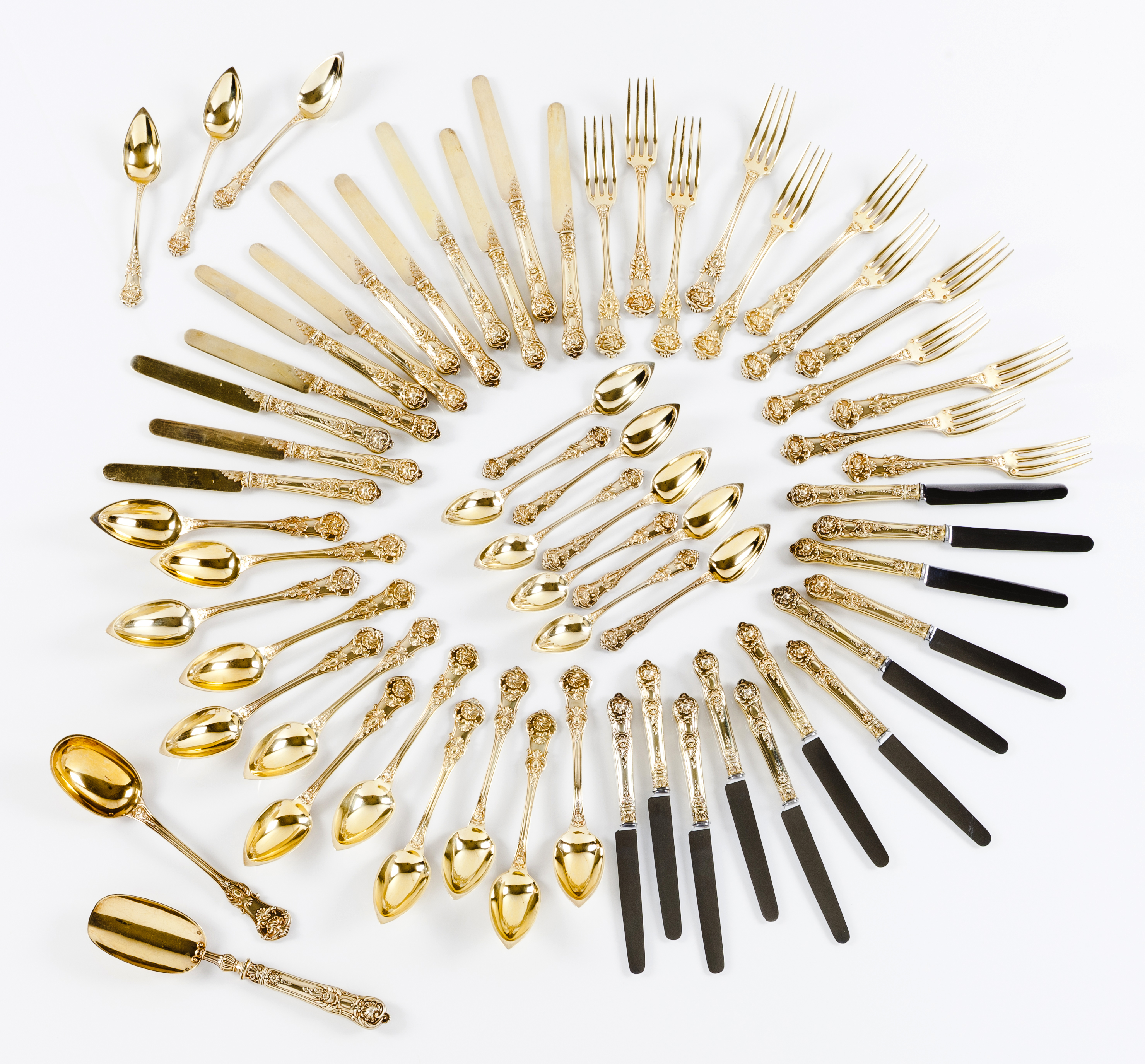 12 facas para queijo, a lâmina de aço marcada AUCOC BVTÉ DU ROI. marcado V.C, légion d’honneur cruz coroada, e Antoine-Vital CARDEILHAC ; marca lebre (Petite Garantie Paris 1819-1838)