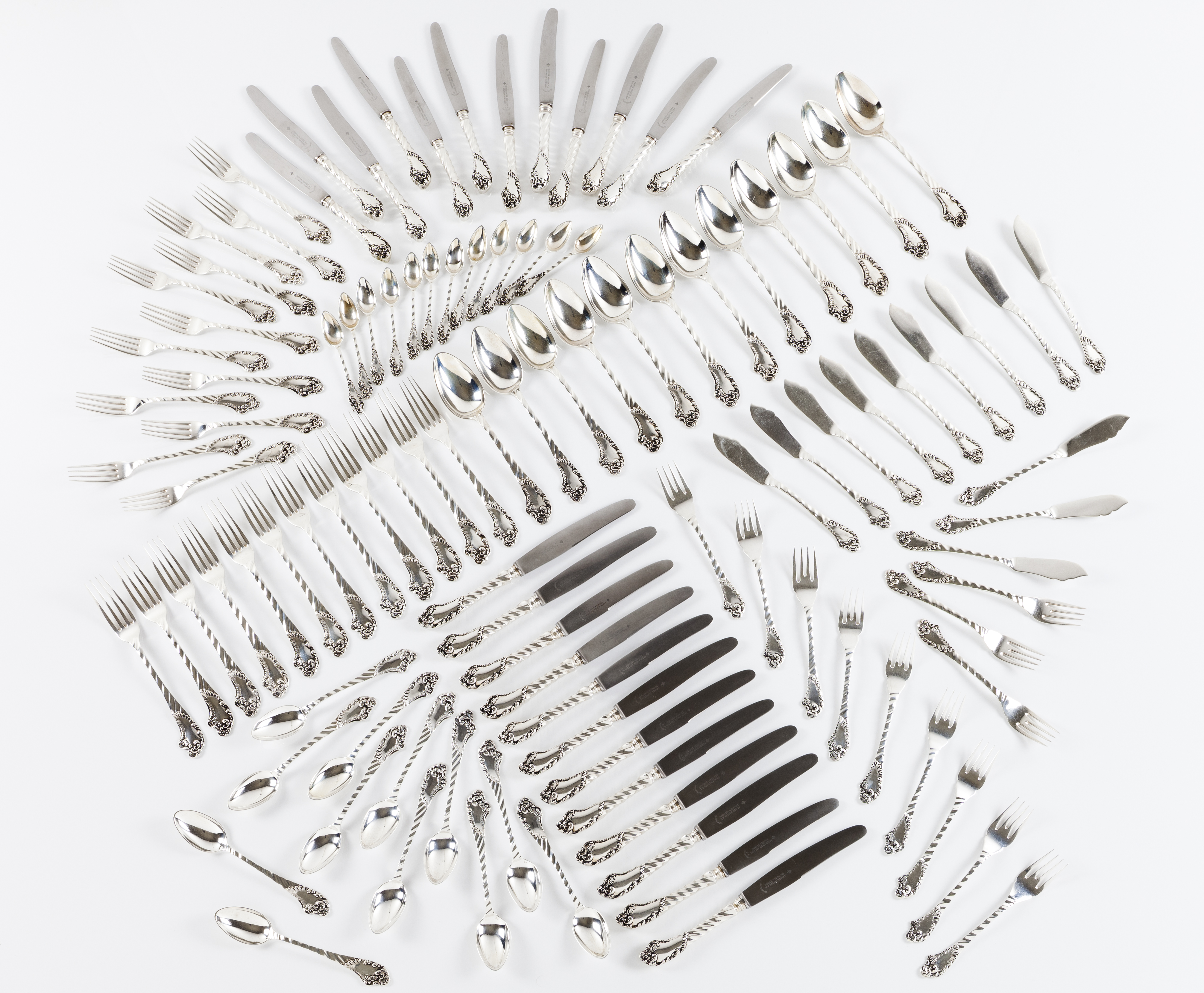 12 facas e 12 garfos de mesa, 12 colheres de sopa, 12 facas e 12 garfos de peixe, 12 colheres, 12 facas e 12 garfos de sobremesa e 12 colheres de chá