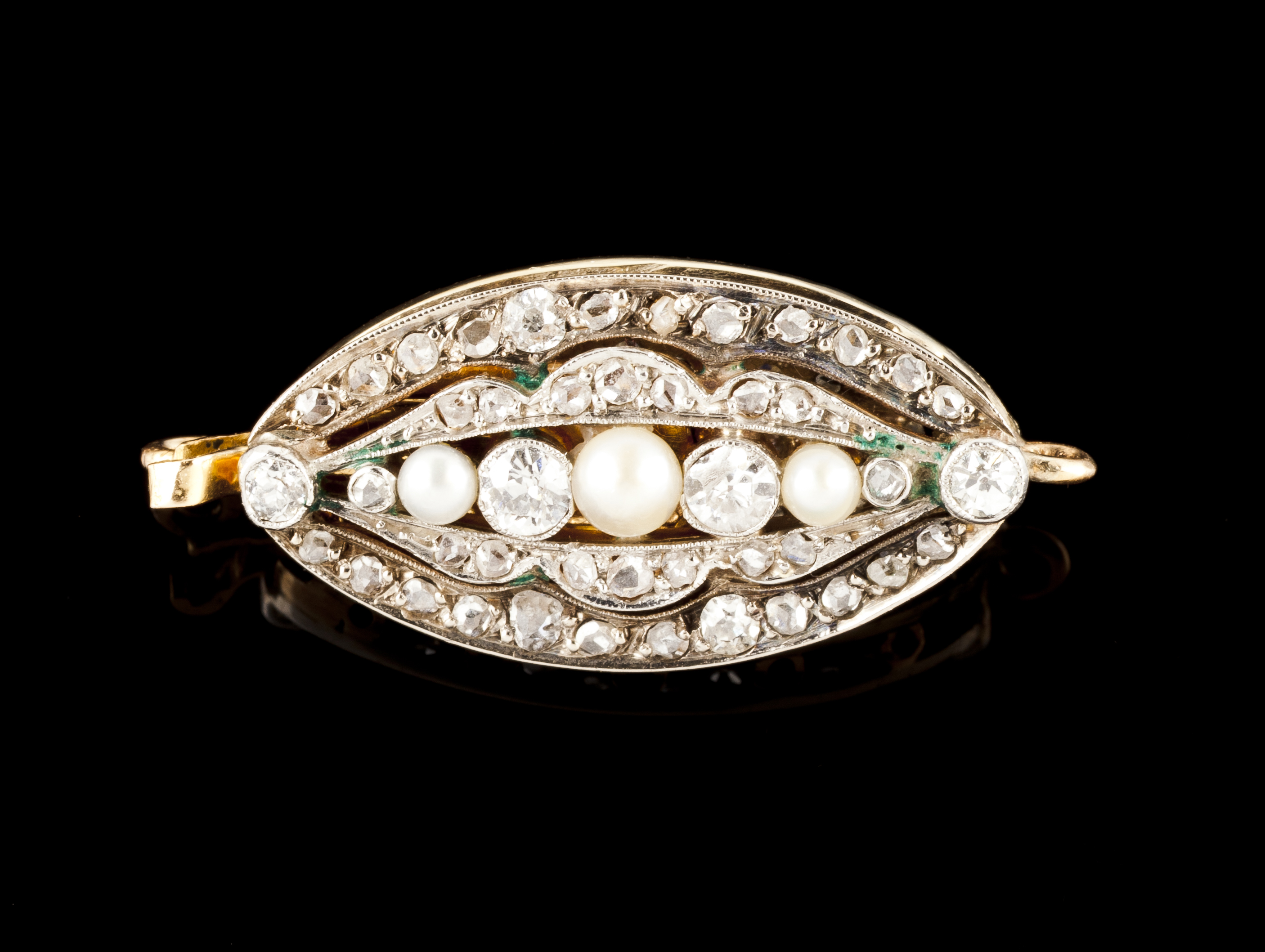 De formato oval com decoração vazada e craveajada de ambos os lados com seis pérolas naturais, diamantes talhe rosa e oito diamantes talhe antigo de brilhante (ca. 0,42ct)