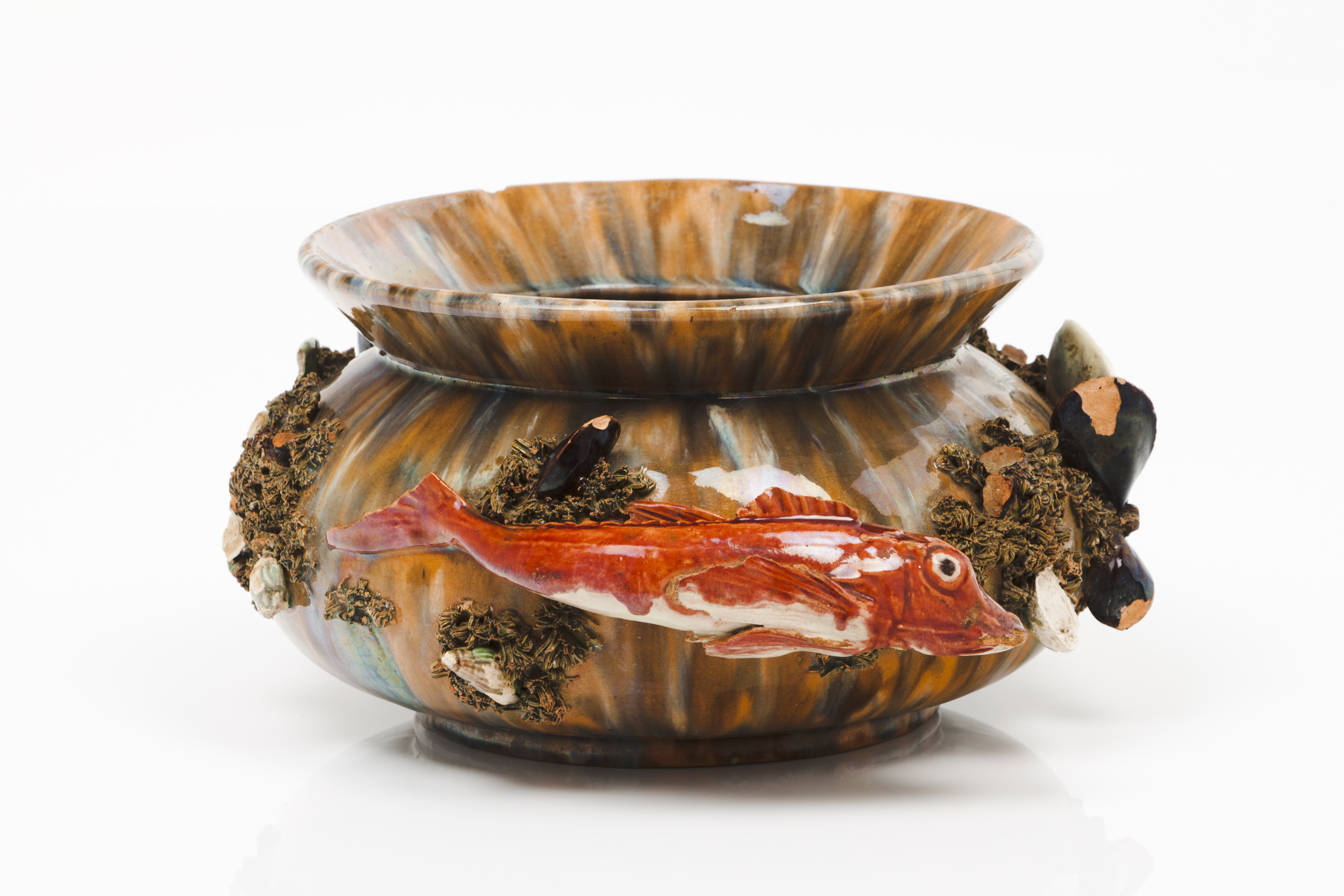 Em barro esmaltado, moldado e modelado representando limos, dois peixes e diversos mariscos sobre fundo escorrido.