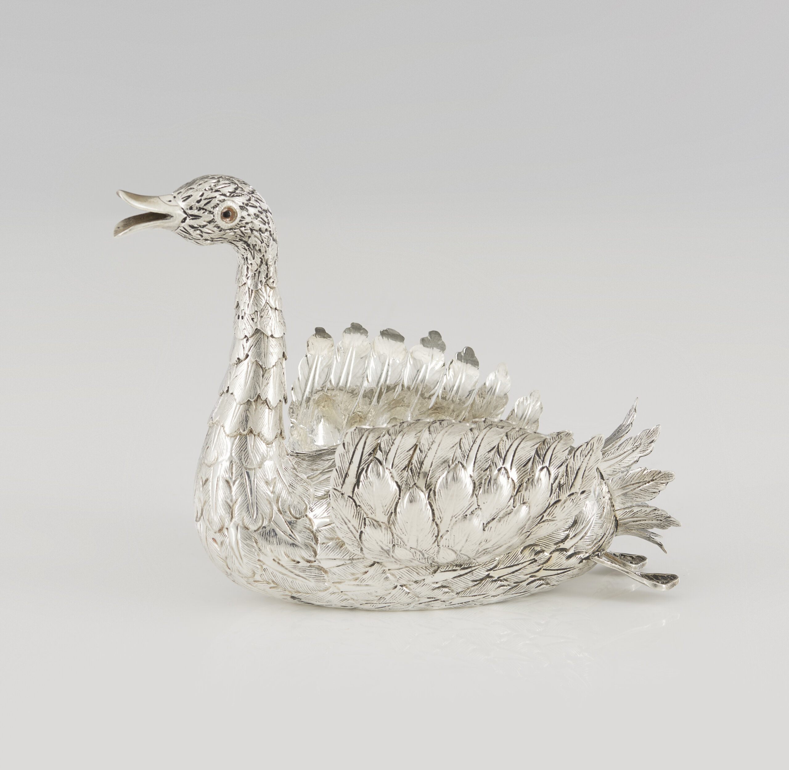 Decoração relevada e gravada em vulto perfeito representando cisne, pescoço e asas articulados