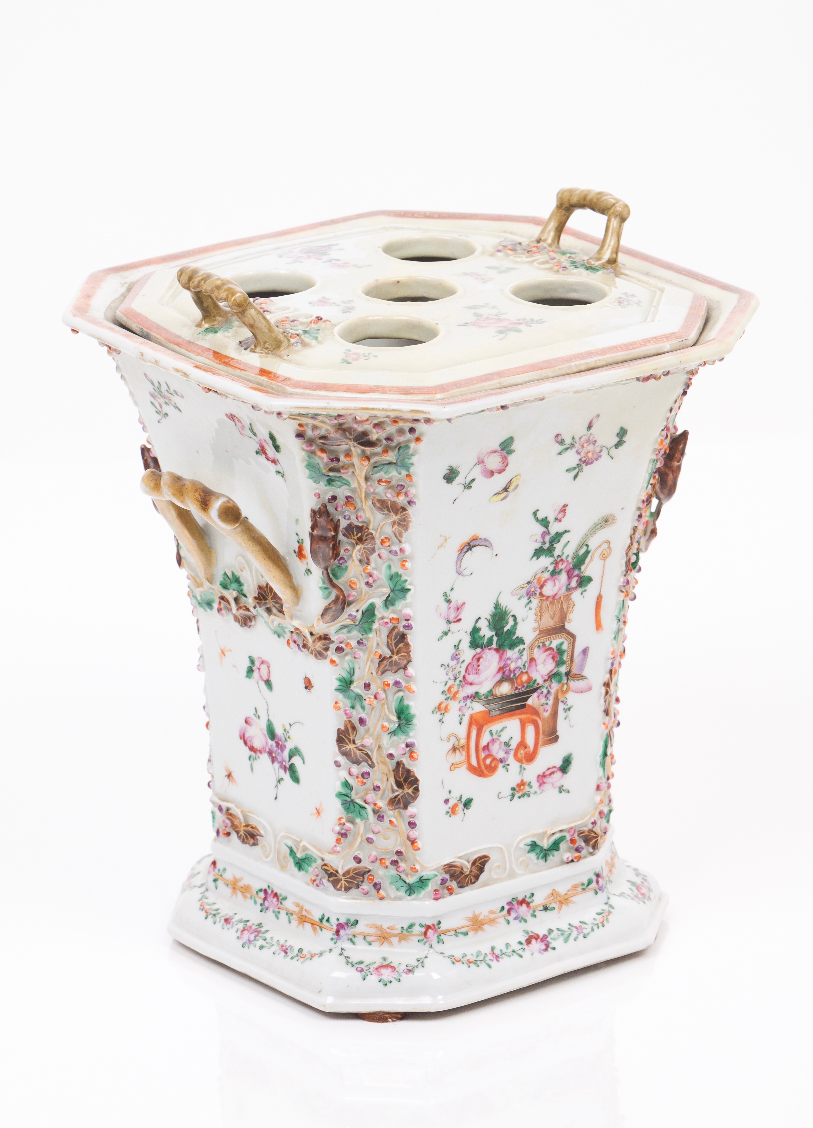Decoração relevada e policromada ao gosto Meissen representando motivos florais e animais