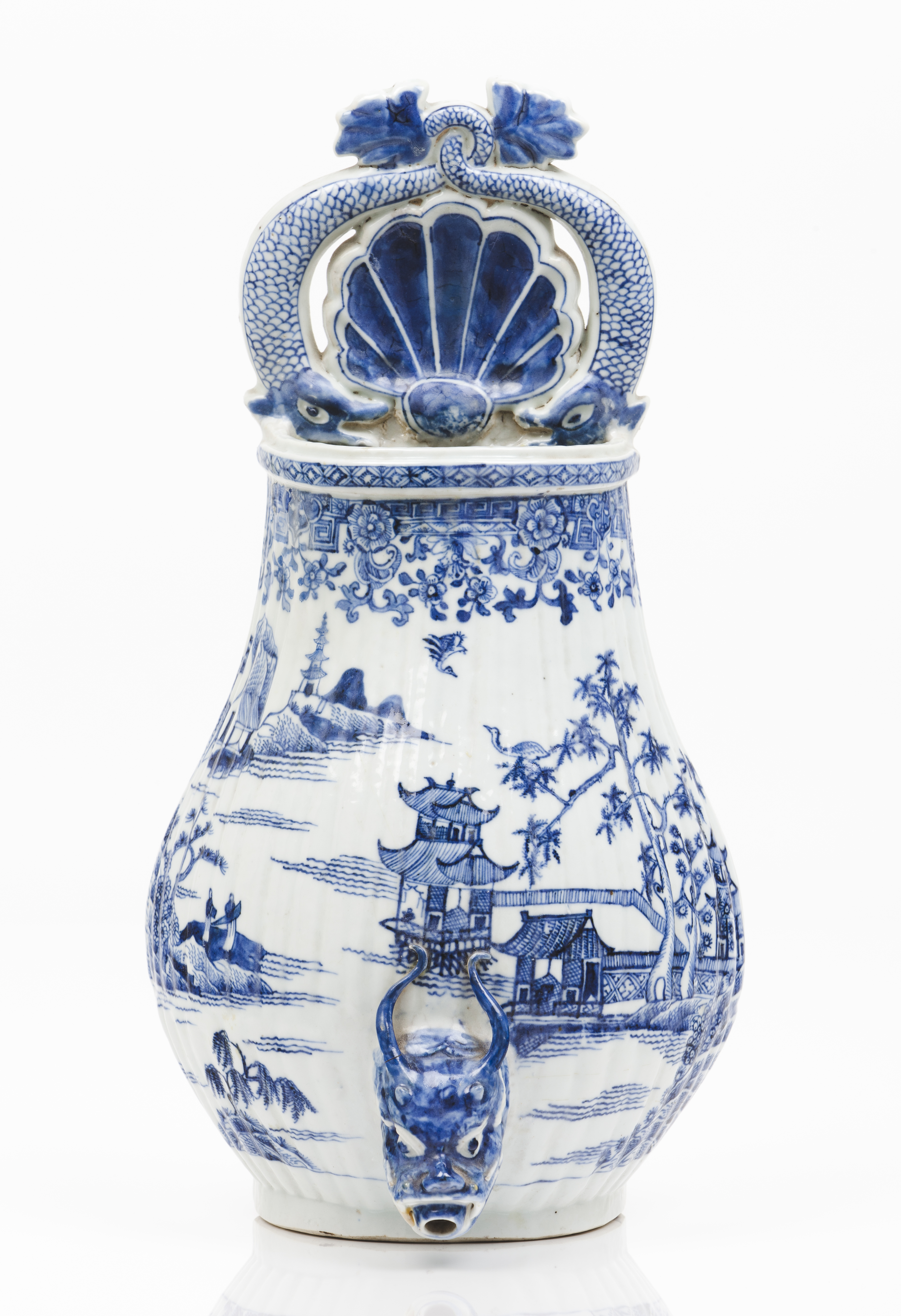 Bocal em forma de cabeça de dragão e cimalha recortada em forma de concha e golfinhos