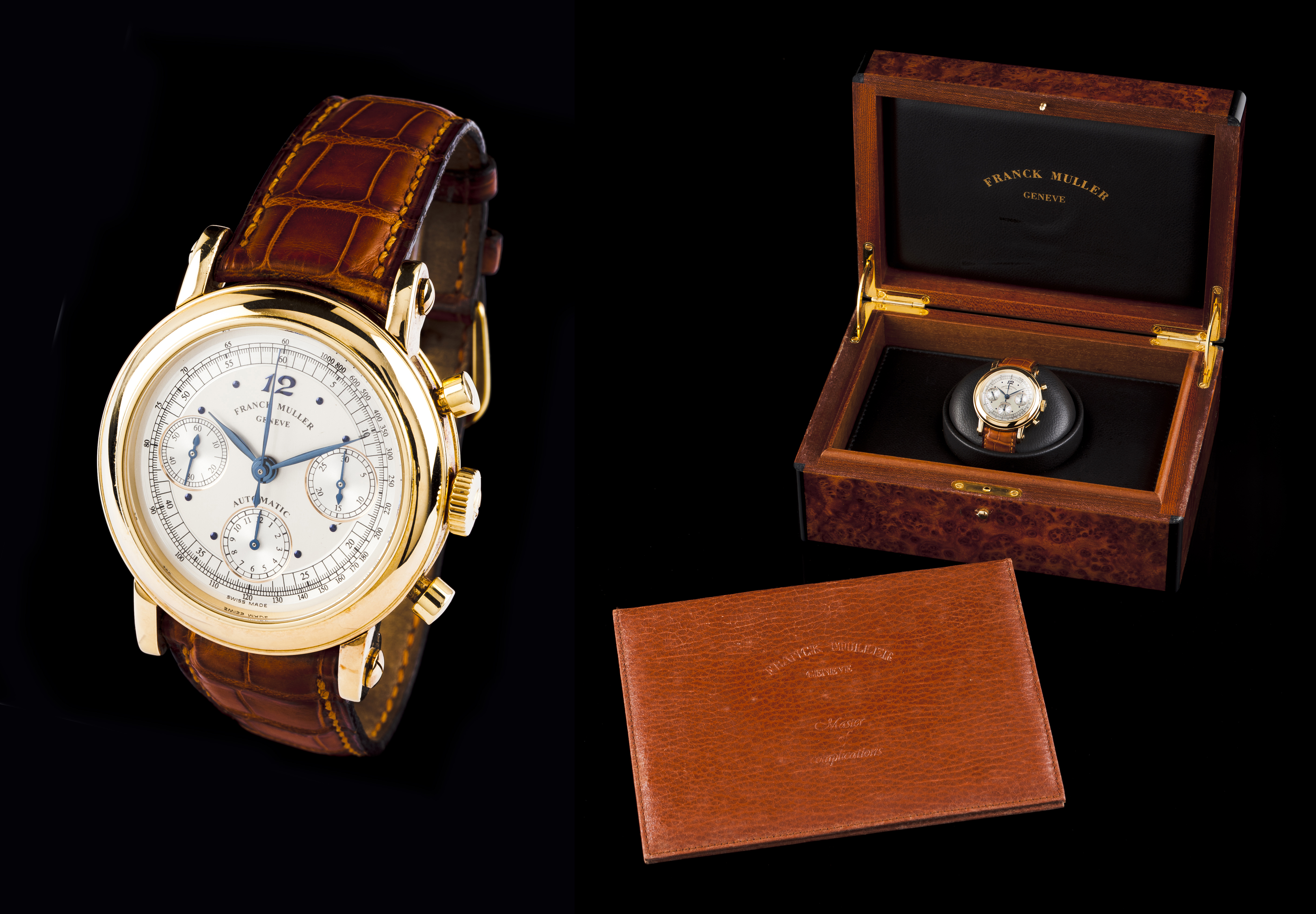 Modelo com duplo mostrador, ref. Nº 7000 DF. Movimento mecânico automático com função cronógrafo, escalas telemétrica, taquimétrica e de pulsações. Caixa em ouro (750/000). Em excelente estado de conservação. Com caixa e documentos.