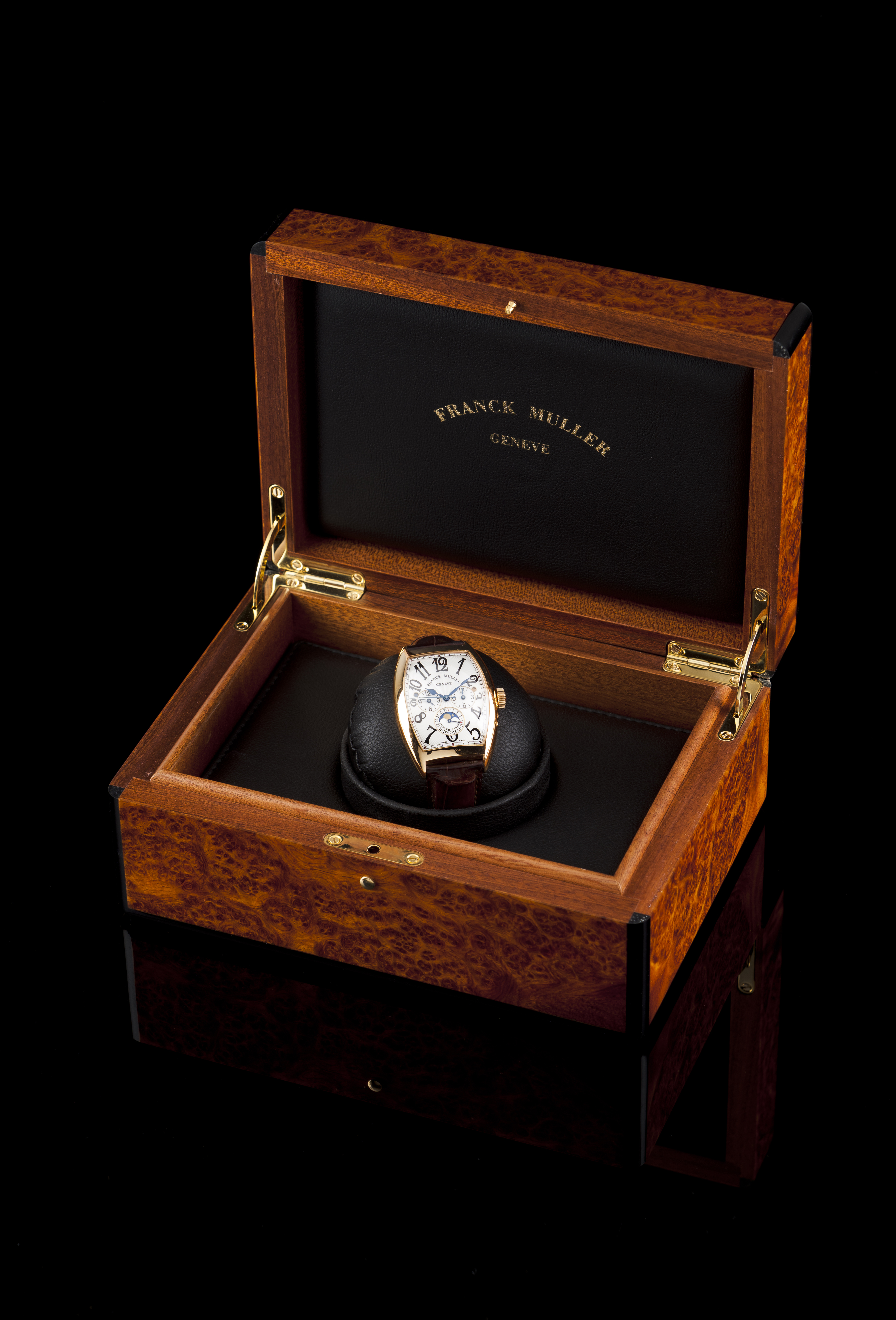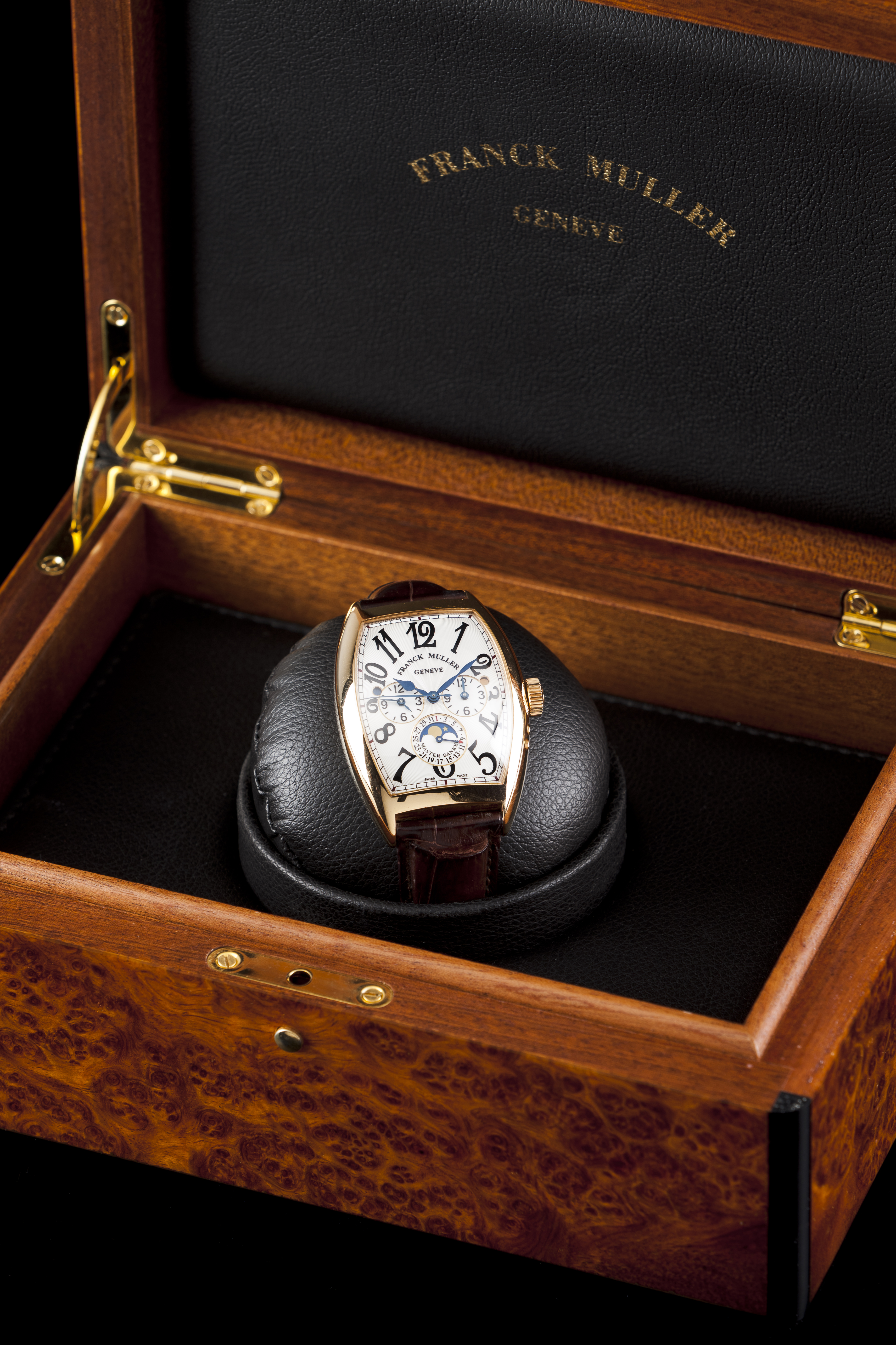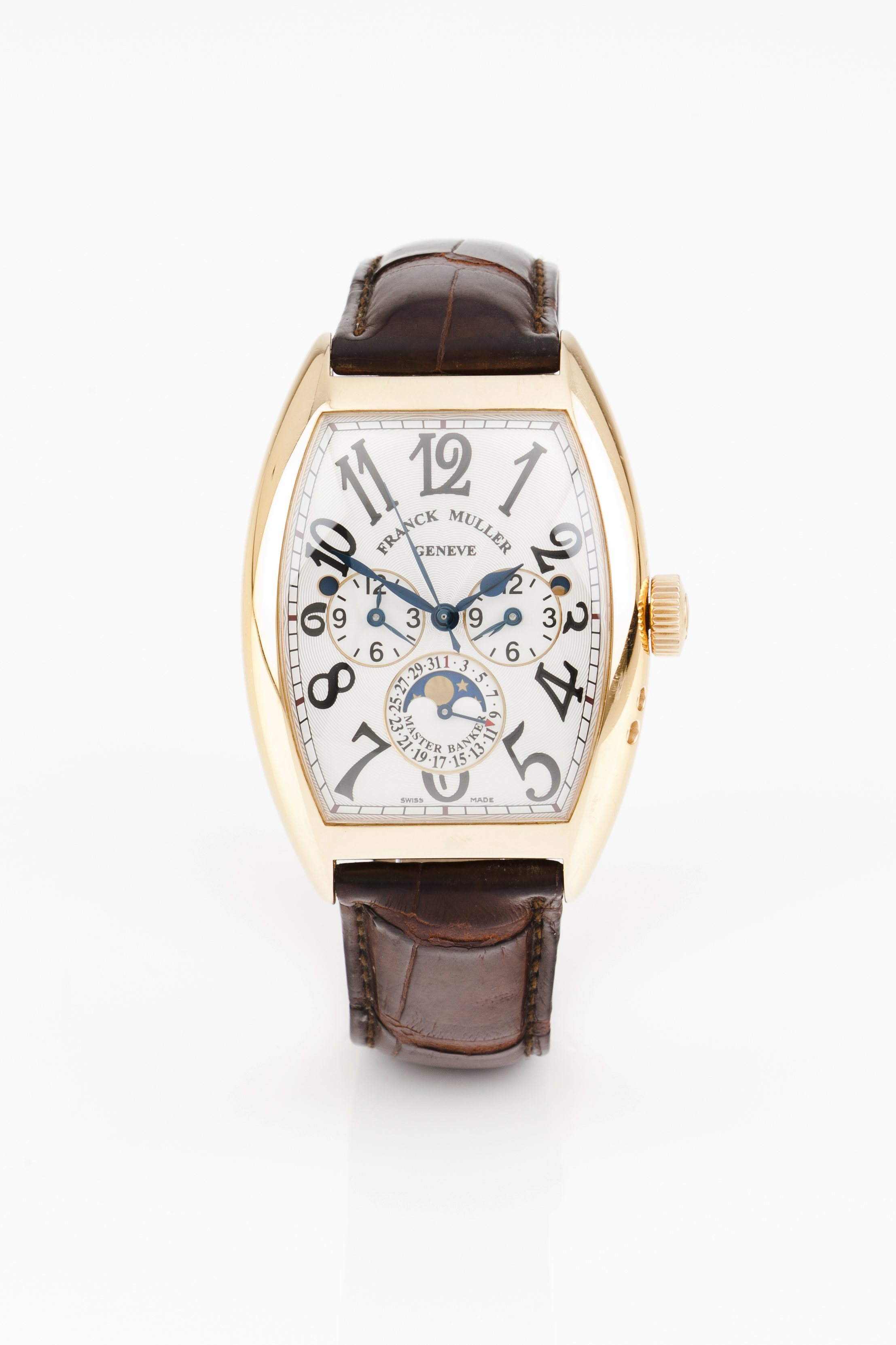 Relógio marca Franck Muller modelo Master Banker (Ref. 8880 MB L DT).Movimento mecânico automático com função GMT, calendário periférico e fases da lua. Caixa em ouro (750/000). Bom estado de conservação. Acompanha caixa original do relógio.