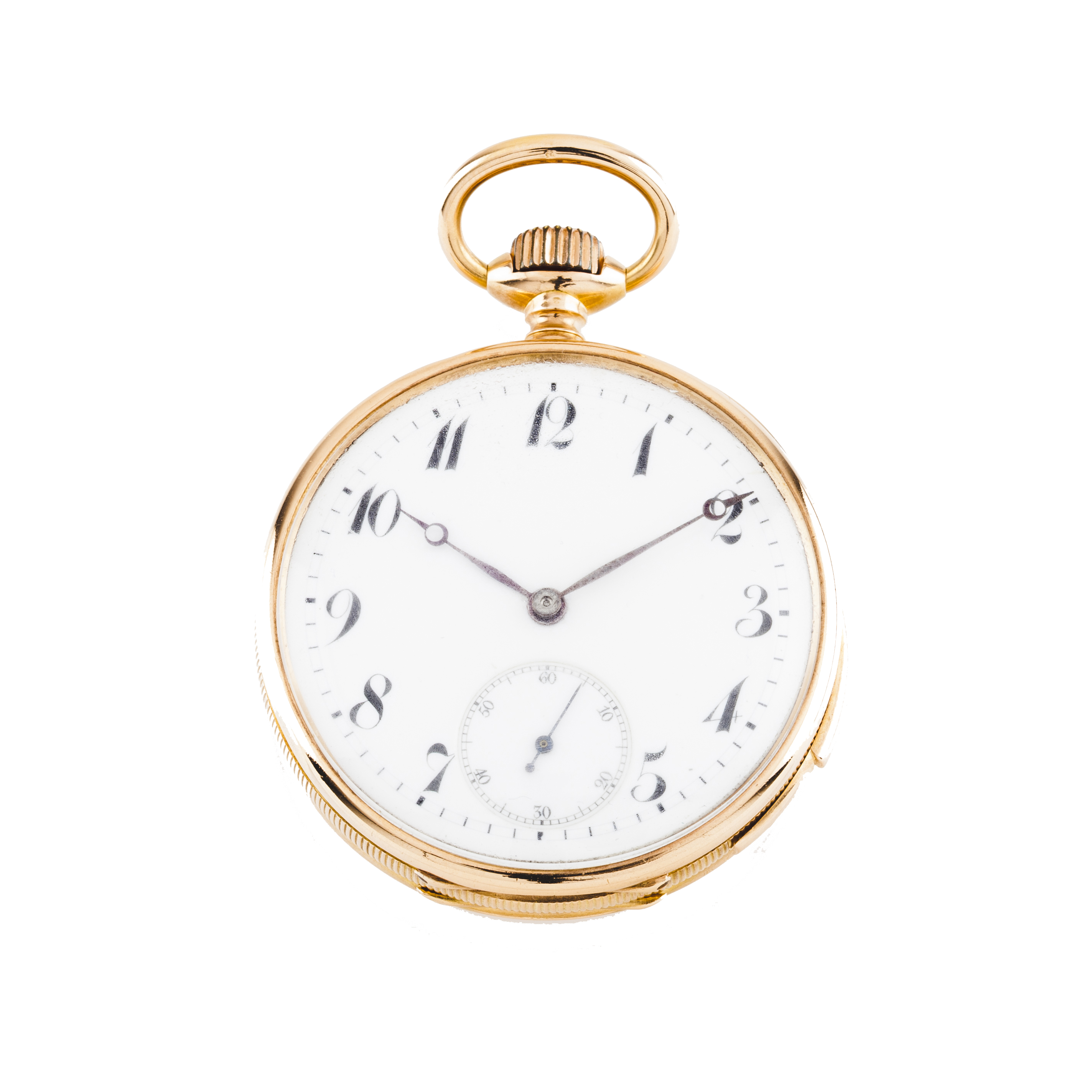 Relógio de Bolso Francês. Movimento mecânico de corda manual com micro-regulação e com função repetição de horas, quartos e minutos. Caixa em ouro (750/000) com duas tampas. Mostrador com numeração árabe. Em muito bom estado de conservação.