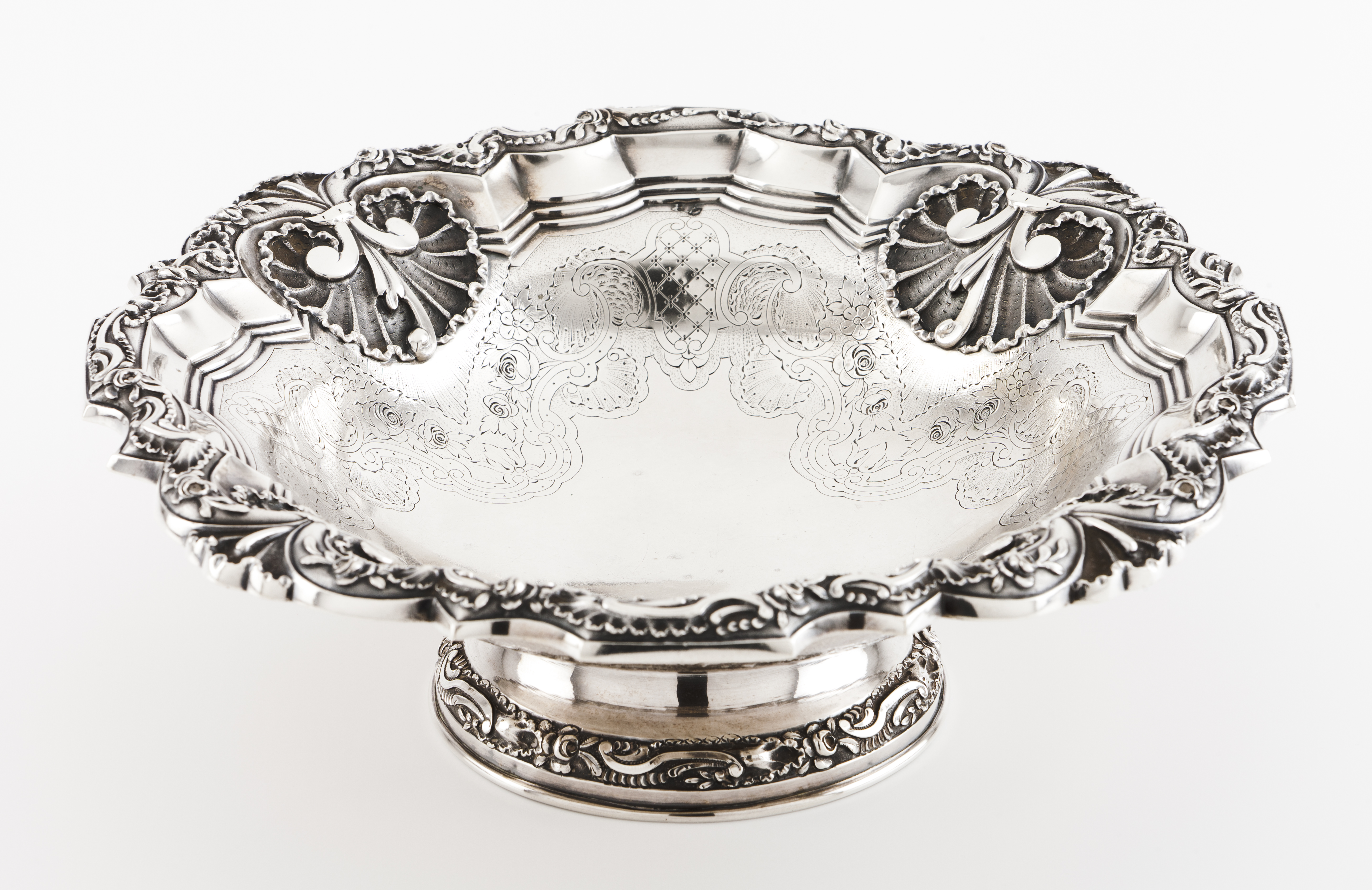 Aba e bordo com decoração relevada de concheados, aletas, flores e ramagens