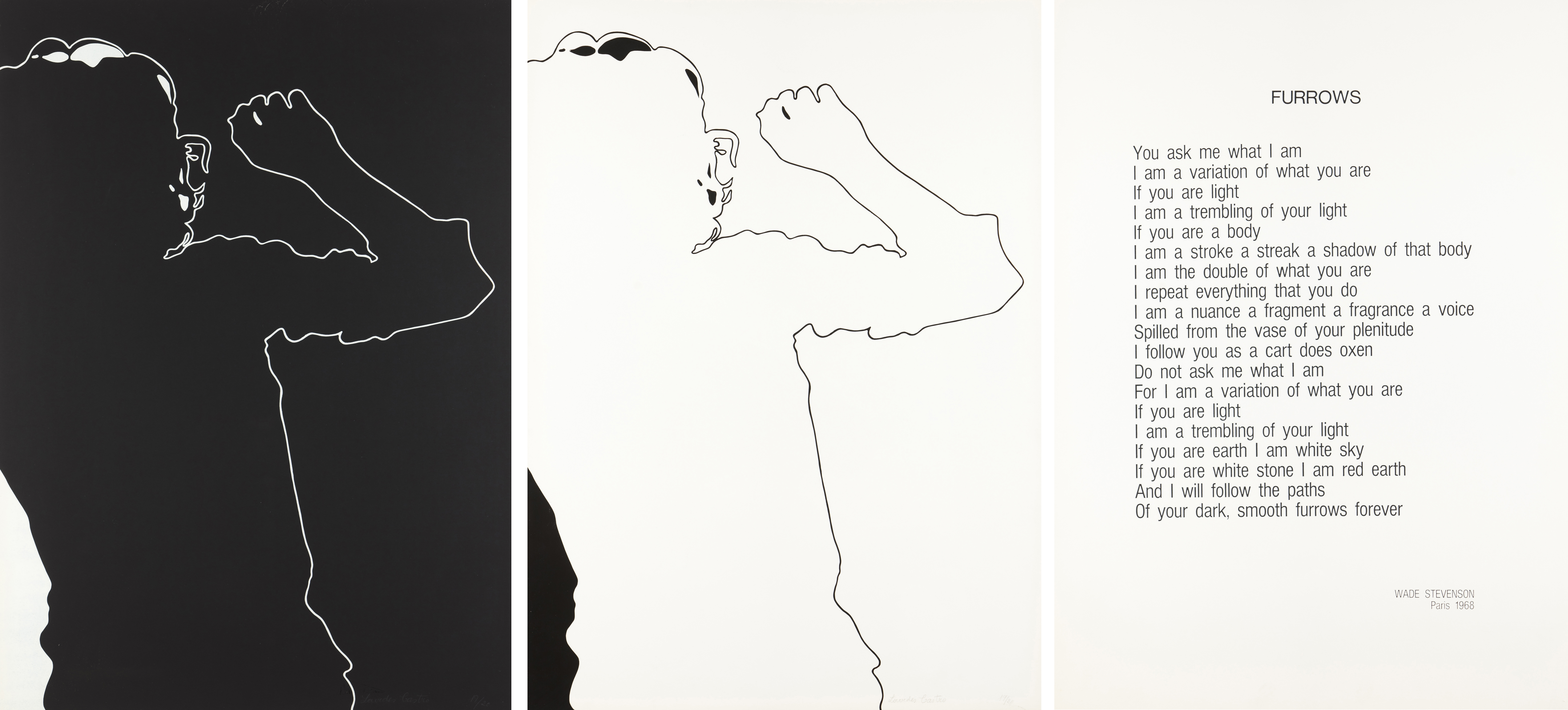 Três serigrafias sobre cartão, uma com o poema "Furrows" de Wade Stevenson