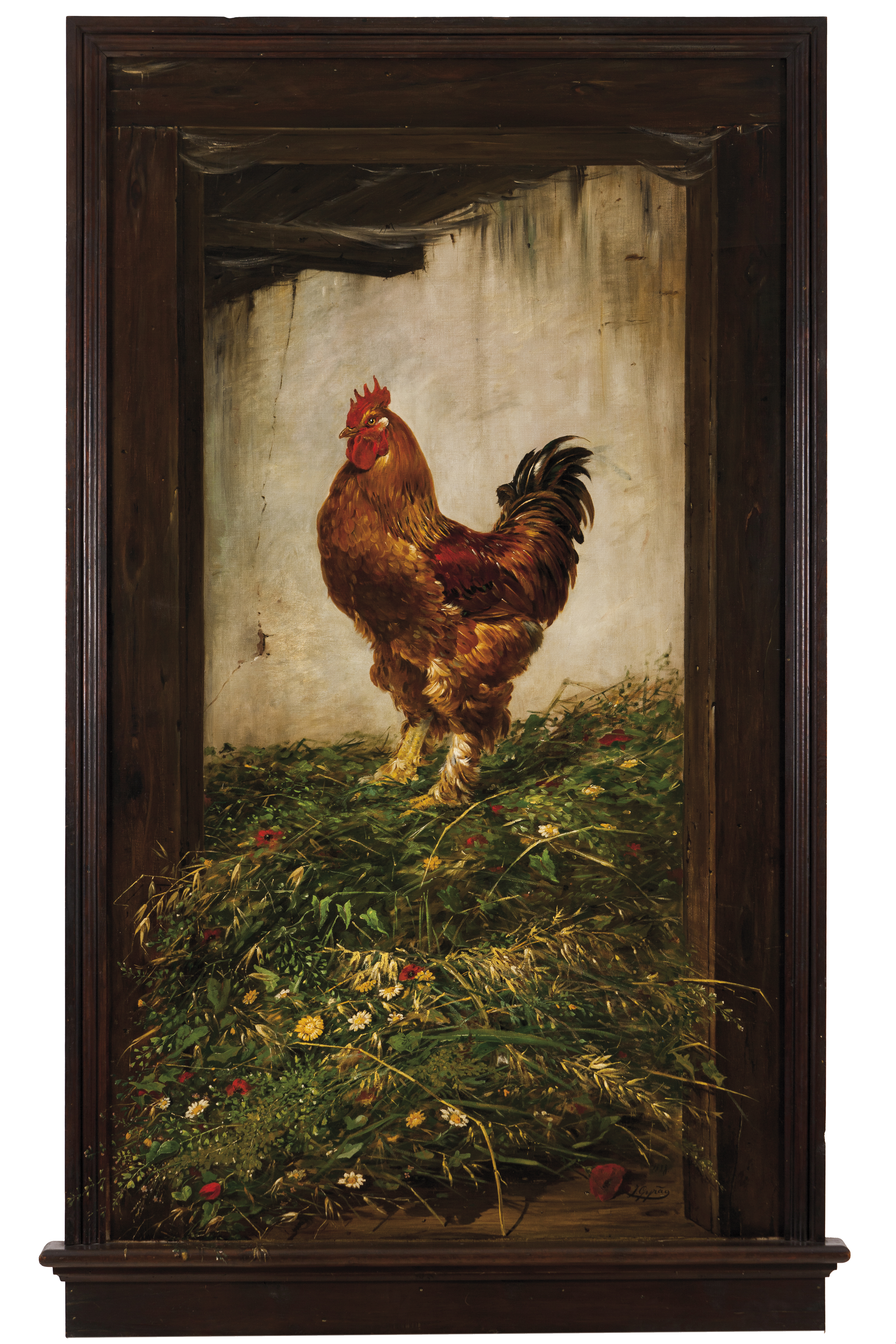 Esta pintura surge reproduzida no catálogo raisonné, datado de 1983, da autoria de Manuel Nunes Correia, onde é descrito da seguinte maneira "Tema: um possante galo ao centro da capoeira, juncada de ervas, flores silvestres, como malmequeres, papoilas, folhas de jero, e hastes de palaco. A pintura está emoldurada pelo aro de uma porta de madeira, transbordando deste uma parte da verdura mencionada"
