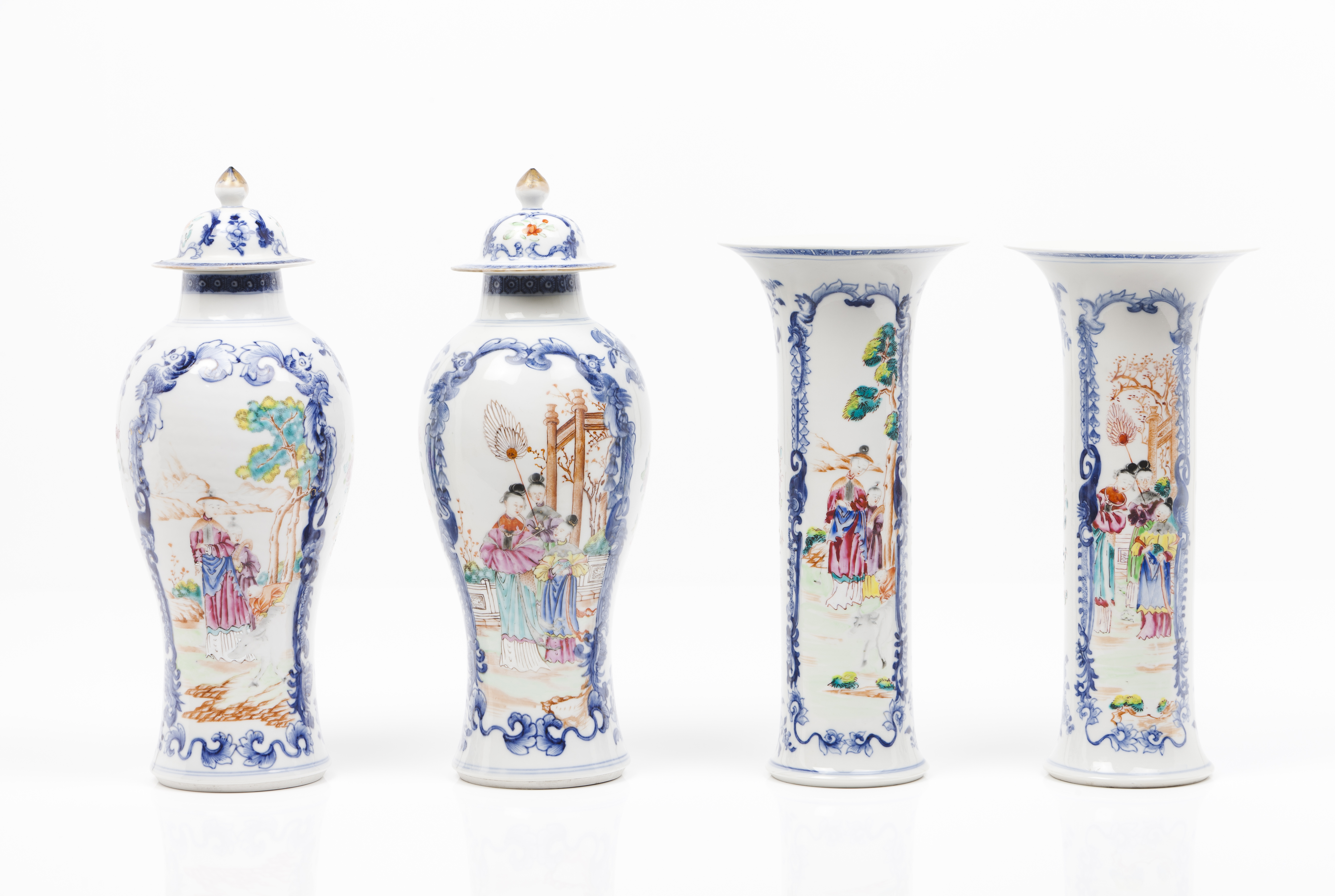 Decorada a azul sob vidrado e com esmaltes da Família Rosa representando paisagens com figuras e motivos florais