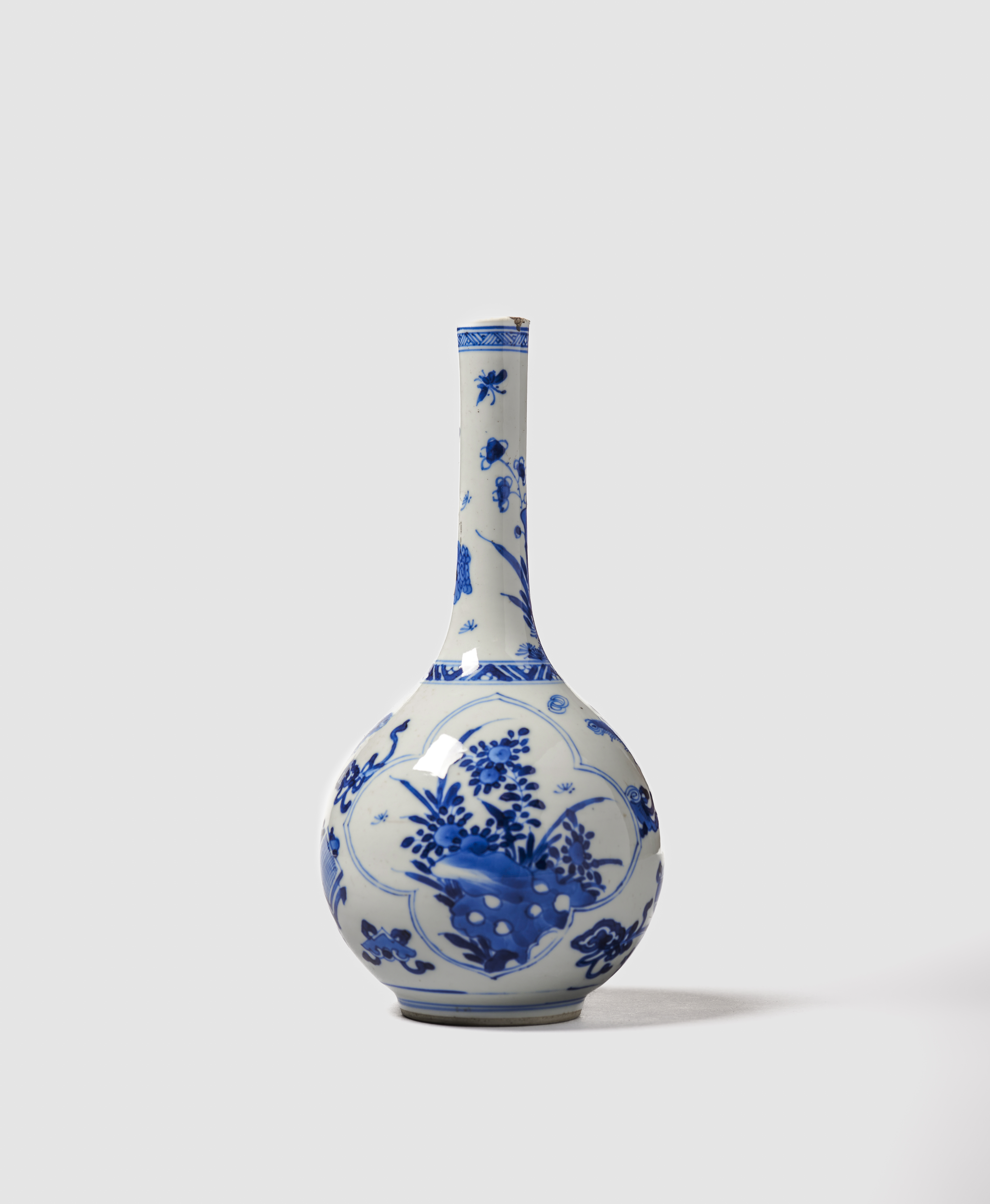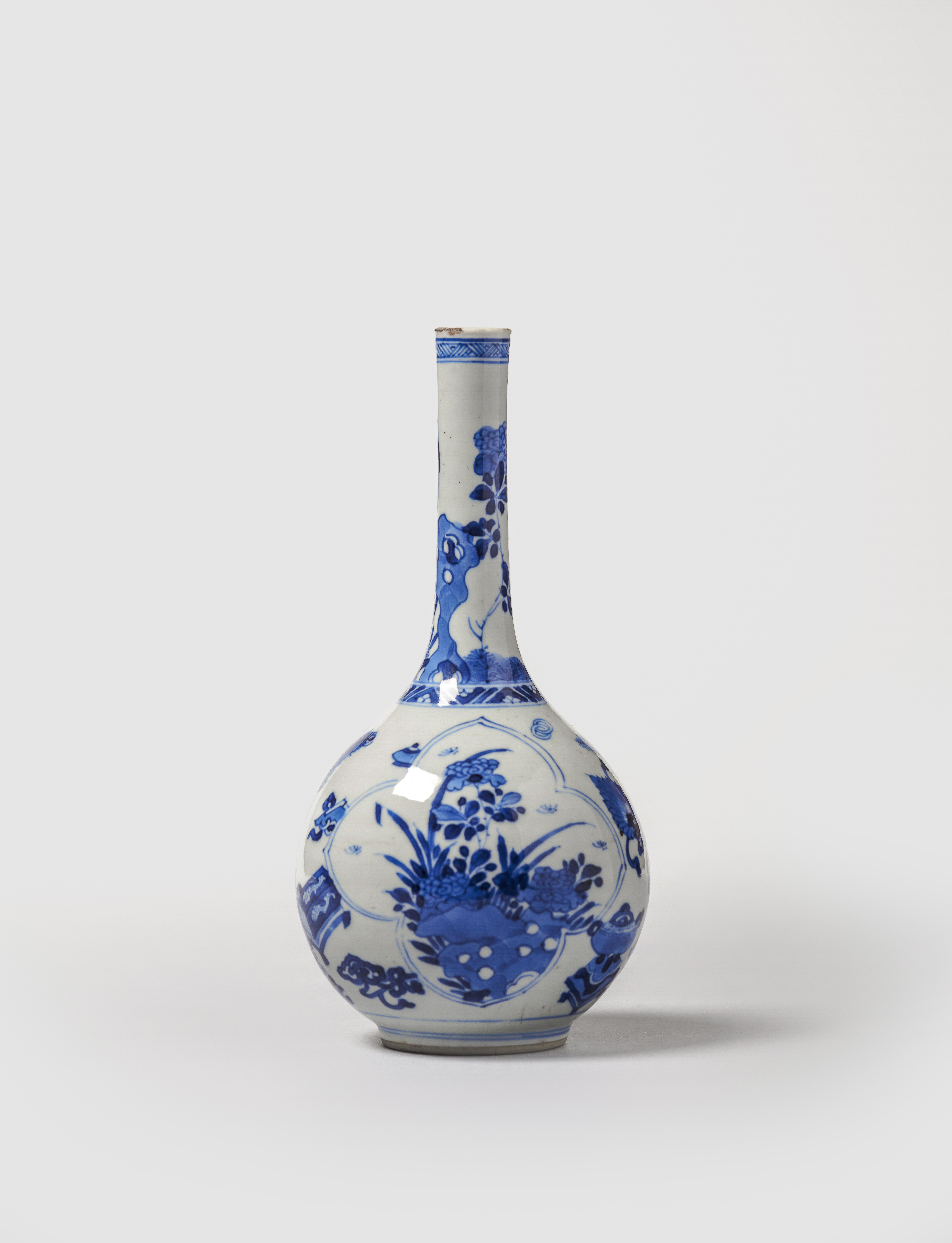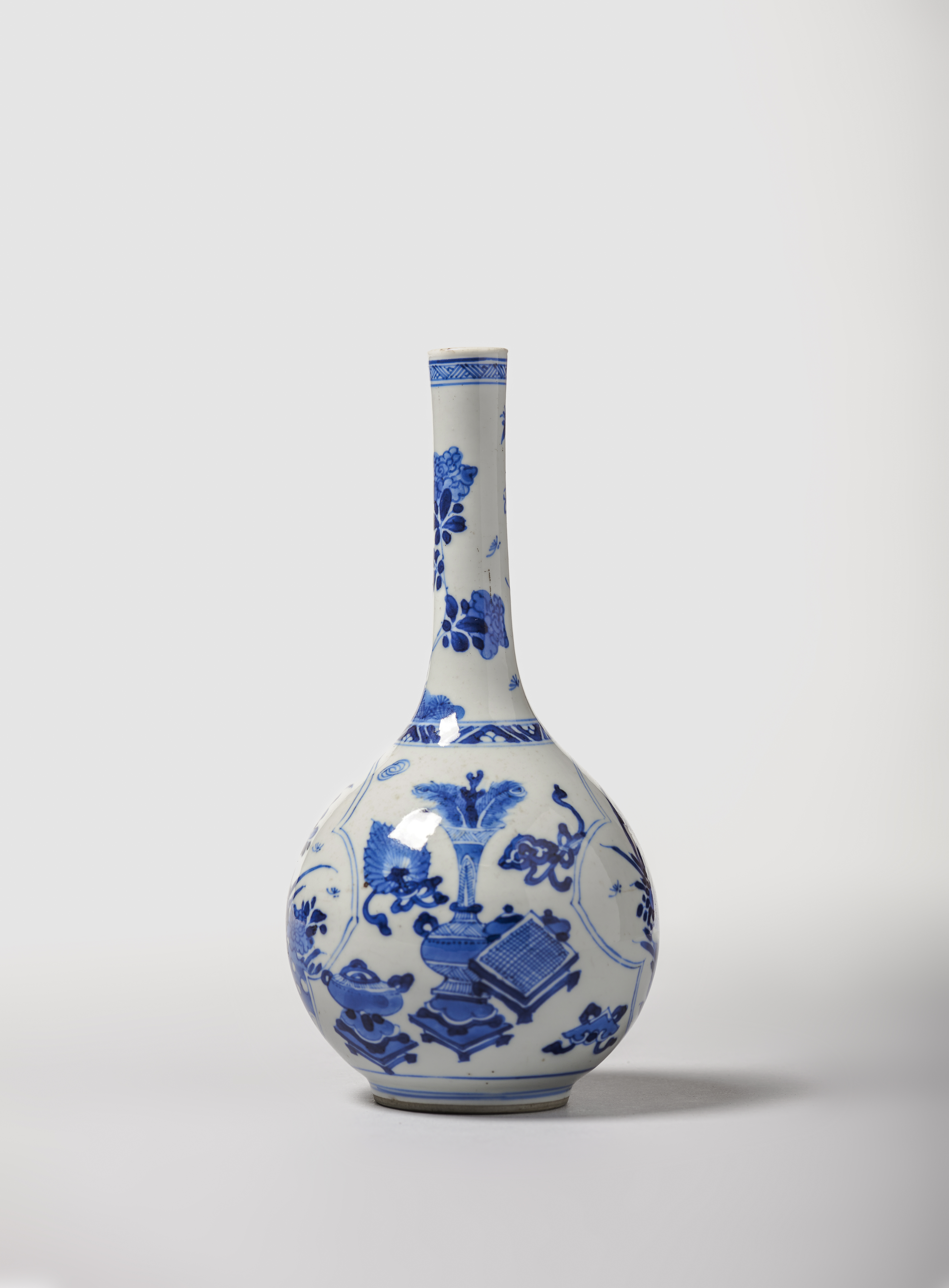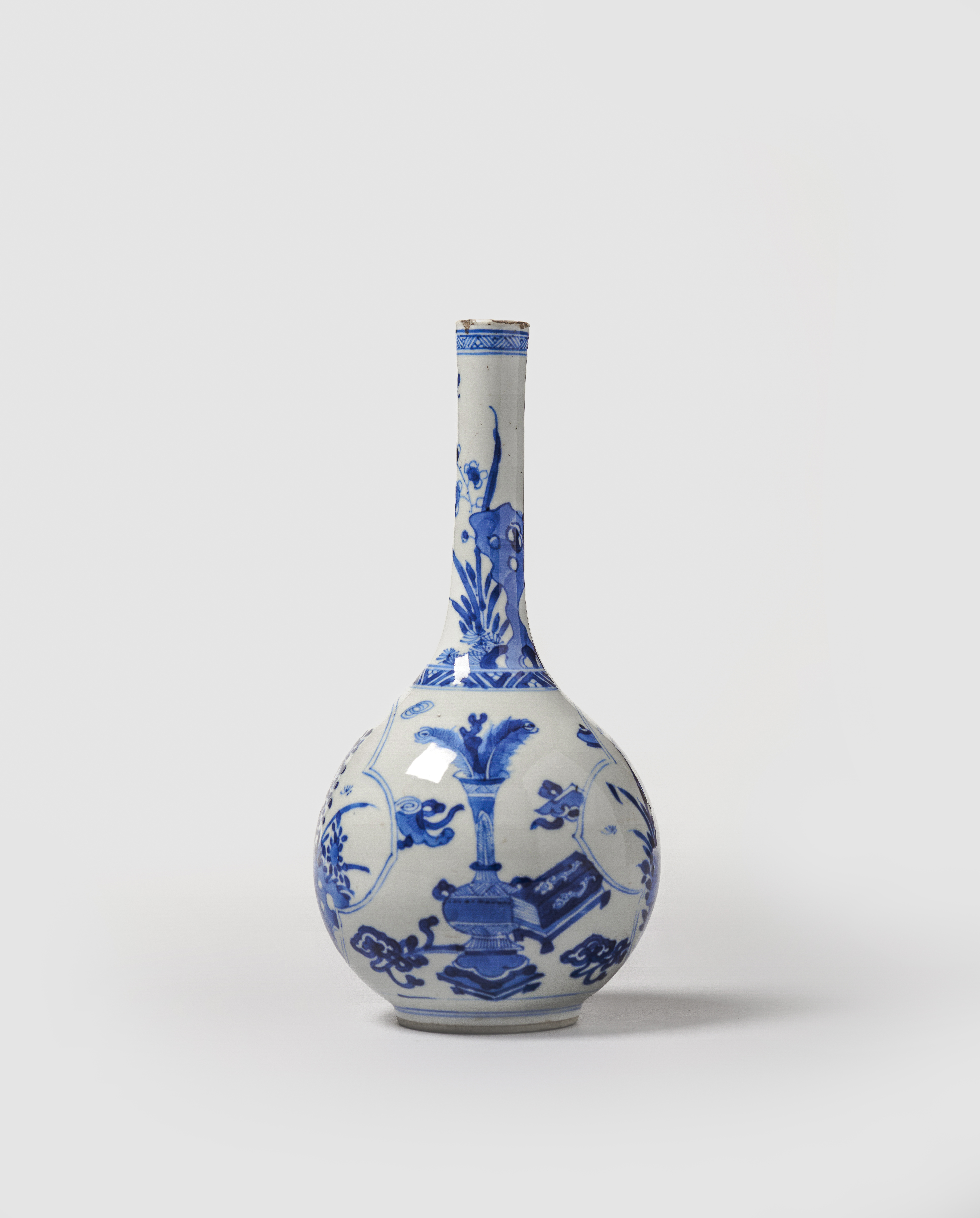Em porcelana, com corpo periforme e pescoço longo e estreito. Decorada em tons de azul cobalto representando no bojo objectos preciosos e dois painéis recortados, preenchidos com composições de flores e rochedos. Pecoço com frisos geométricos junto ao ombro e bordo decorado com flores e rochedos.