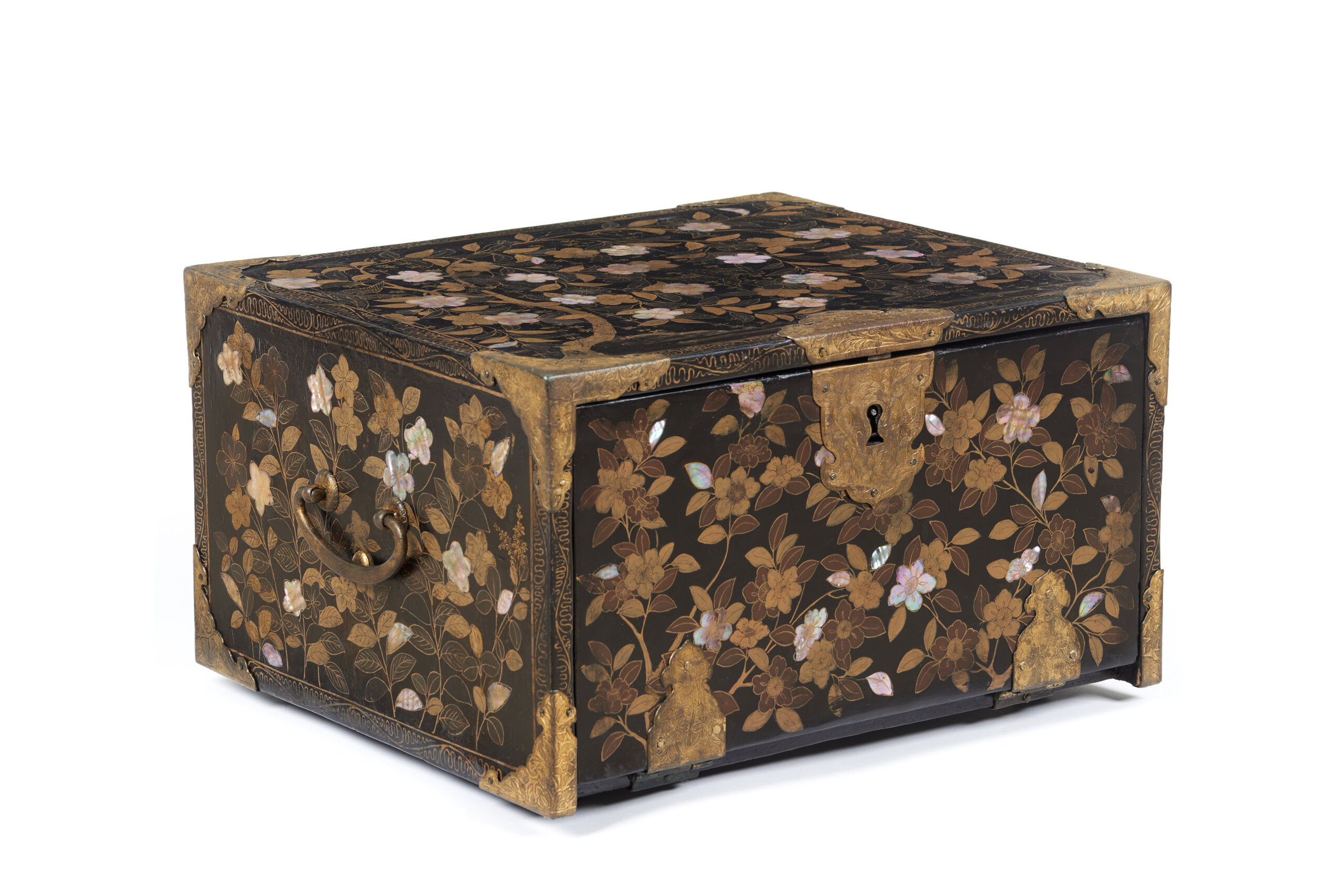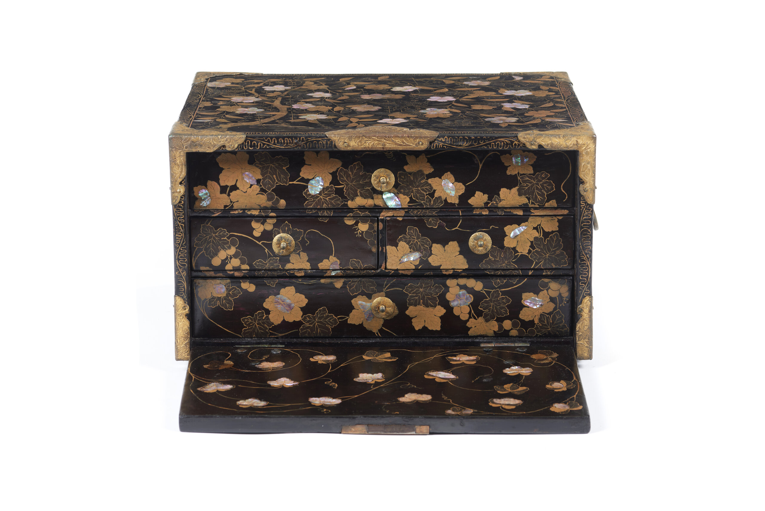 Em madeira lacada com decoração a dourado e madrepérola representando motivos vegetalistas