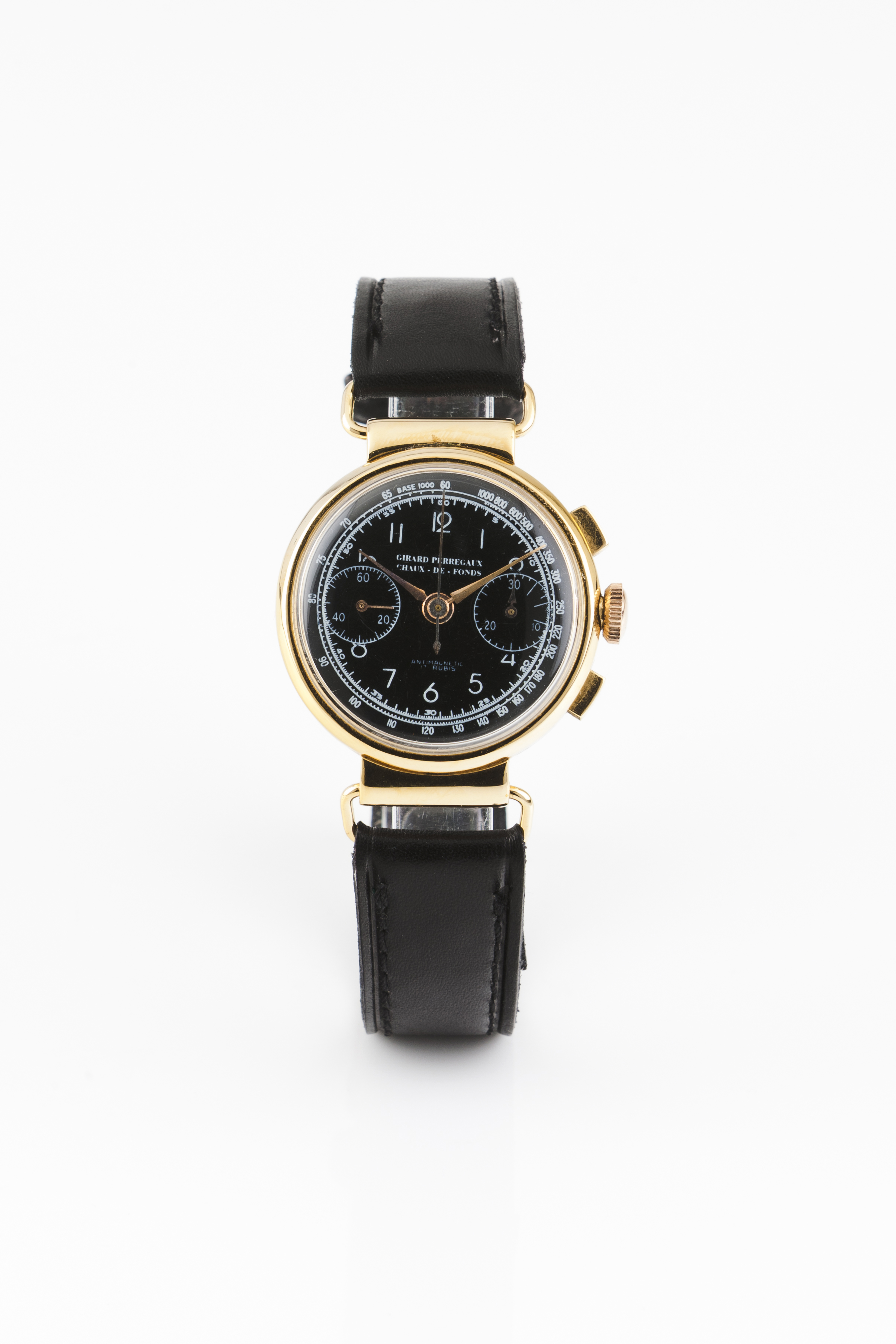 Relógio de marca Girard Perregauz. Movimento mecânico de corda manual com função cronógrafo (Landeron 48). Caixa em plaqué com tampa em aço. Razoável estado de conservação.