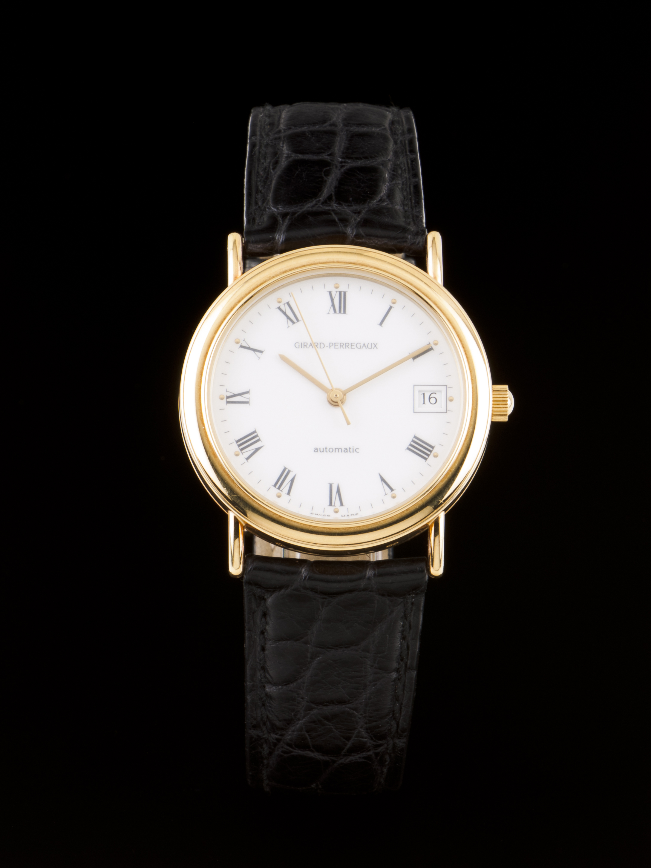 Relógio Girard Perregaux de homem, modelo Jubilaire, com caixa em ouro (750/000) de 33,5mm, referência 4799. Movimento mecânico automático com data. Mostrador de esmalte. Com caixa/estojo original. A funcionar ao momento da avaliação.