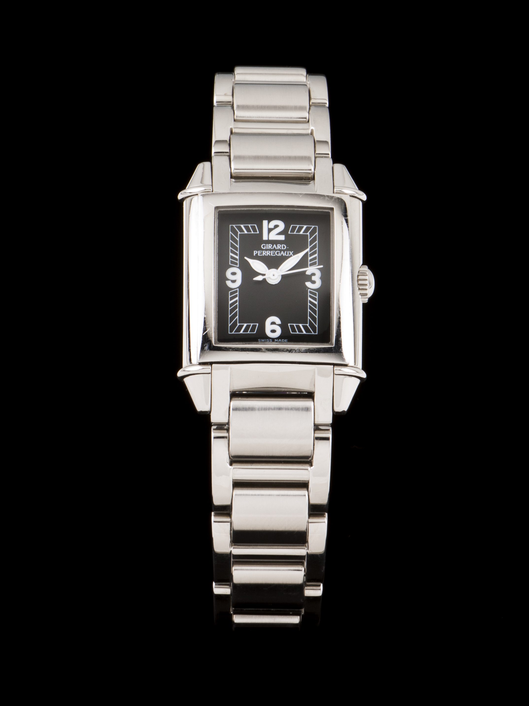 Relógio Girard Perregaux modelo Vintage com referência 2591, de Senhora, com caixa e bracelete em aço. Caixa com 23mm x 35mm. Movimento de quartzo. Acompanha caixa (incompleta) e documentos. Relógio em bom estado com ligeiros sinais de uso.
