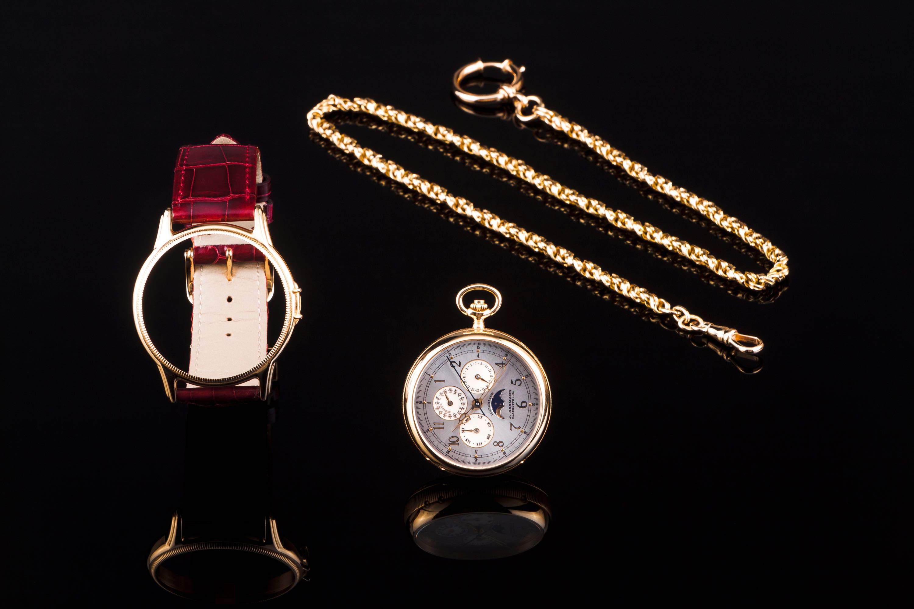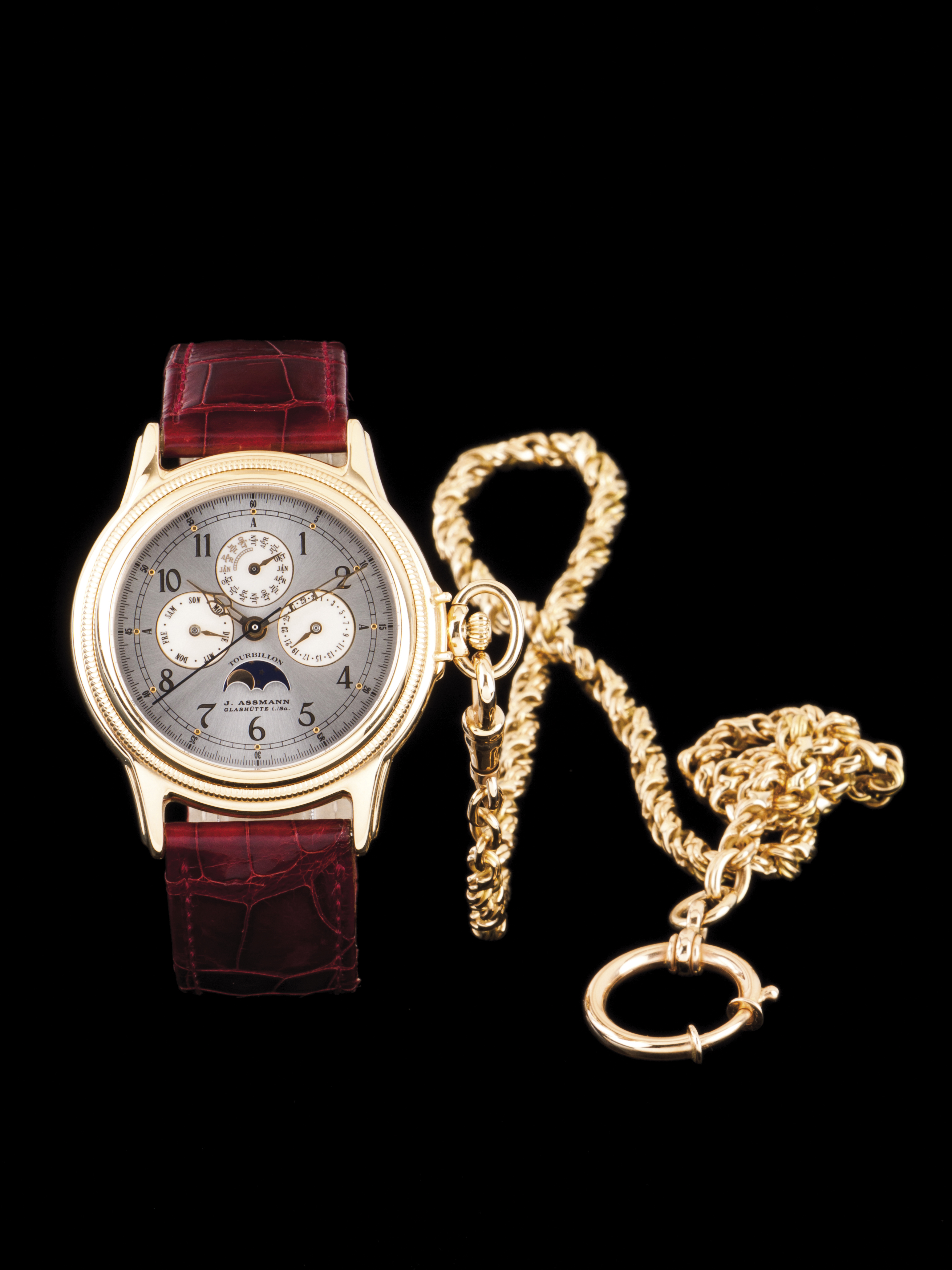 Julius Assmann - Glashütte - Edição limitada produzida em 2001 com apenas 25 relógios sendo este o exemplar nº 12. Esta peça pode ser usada como relógio de pulso ou como relógio de bolso, para o efeito é acompanhada de um cordão em ouro (750/000) com 44cm e 37,4gr de peso. O movimento desta peça é de extrema precisão.