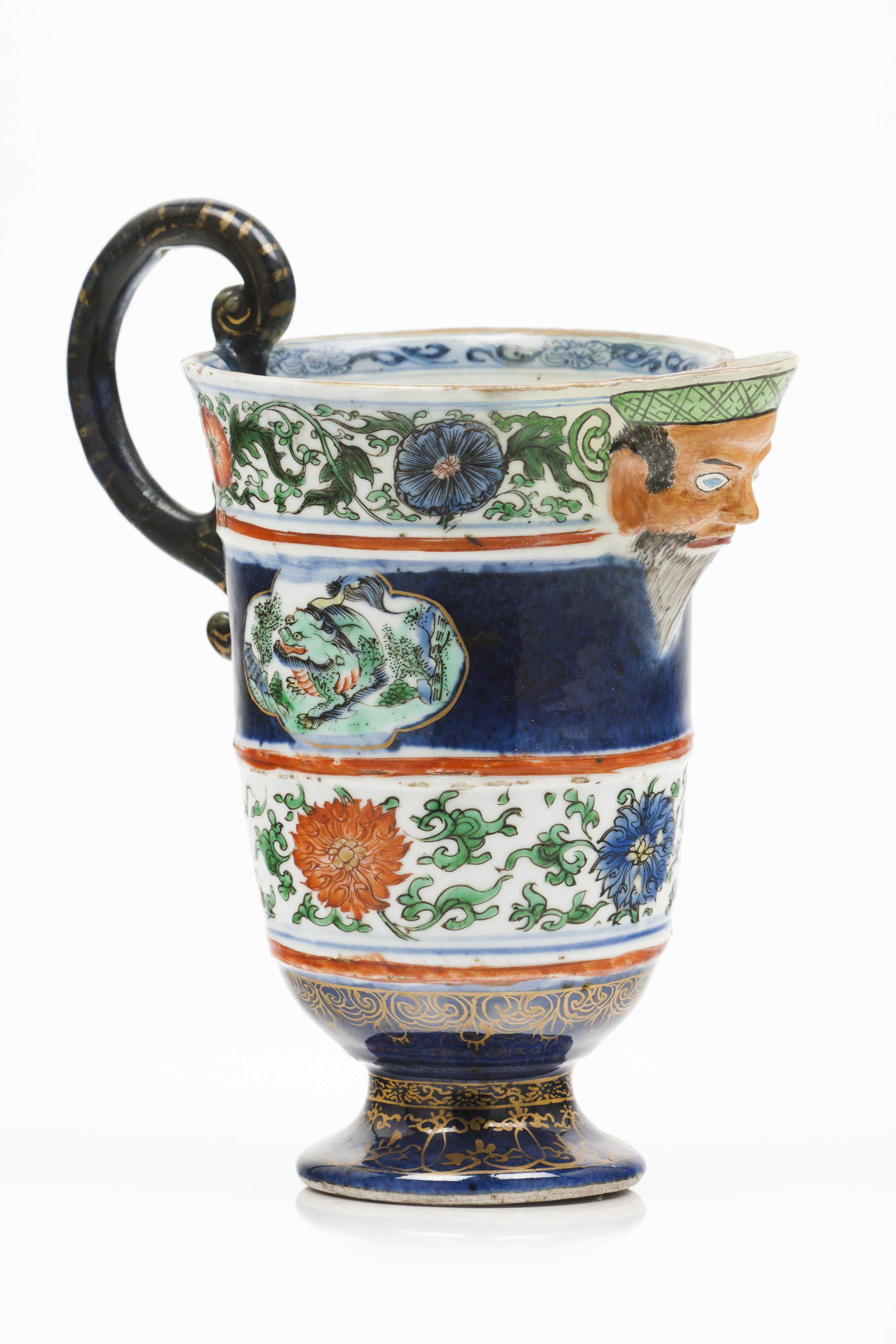 Bico do gomil em forma de cabeça de homem e pega em blue pondré