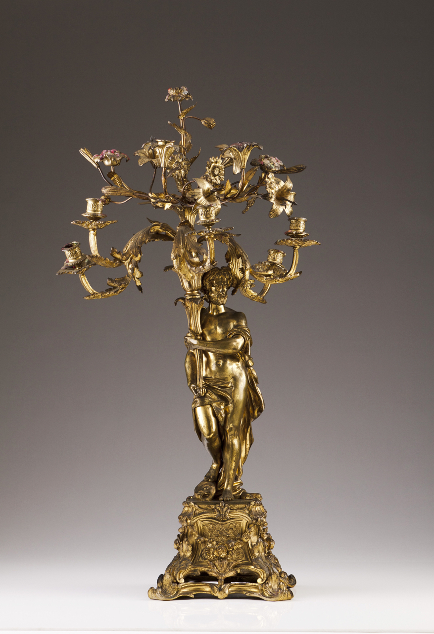 Com fuste em forma de figura masculina e peixe, sobre base decorada com motivos vegetalistas