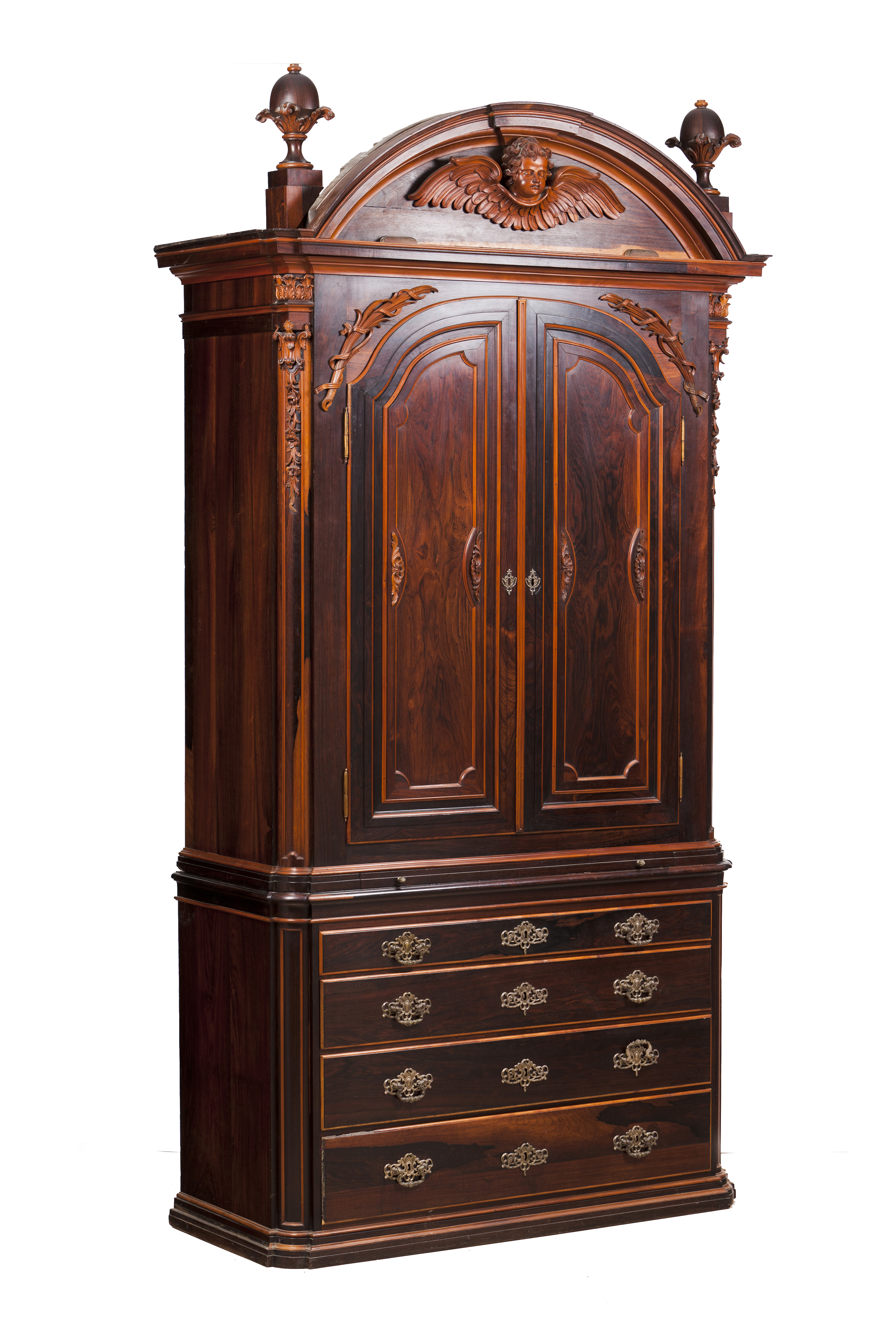Cimalha semicircular, decorada com cabeça de anjo entalhada e ladeada por dois pináculos