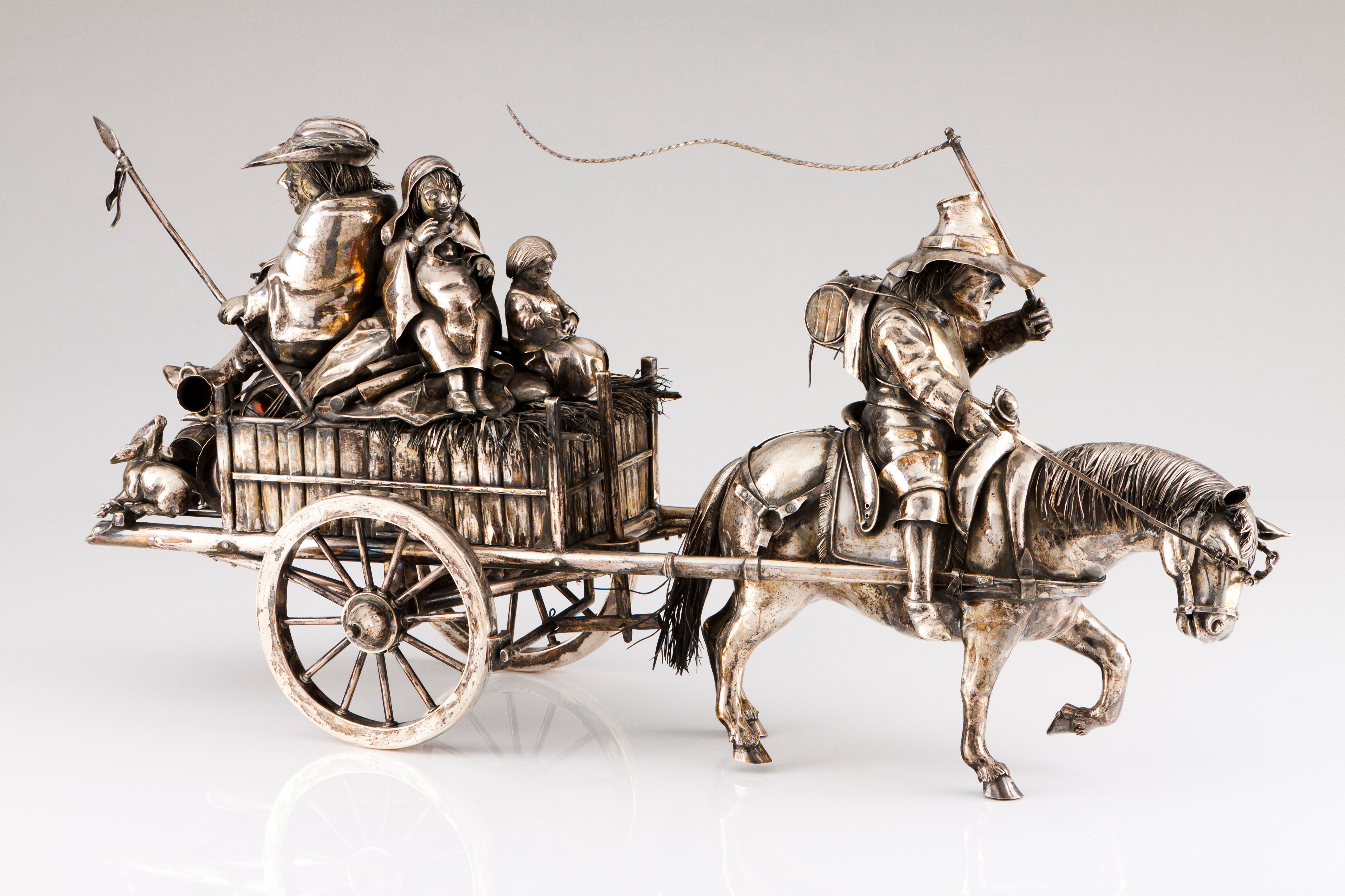 Representando carroça puxada por cavalo e carregando família de camponeses
