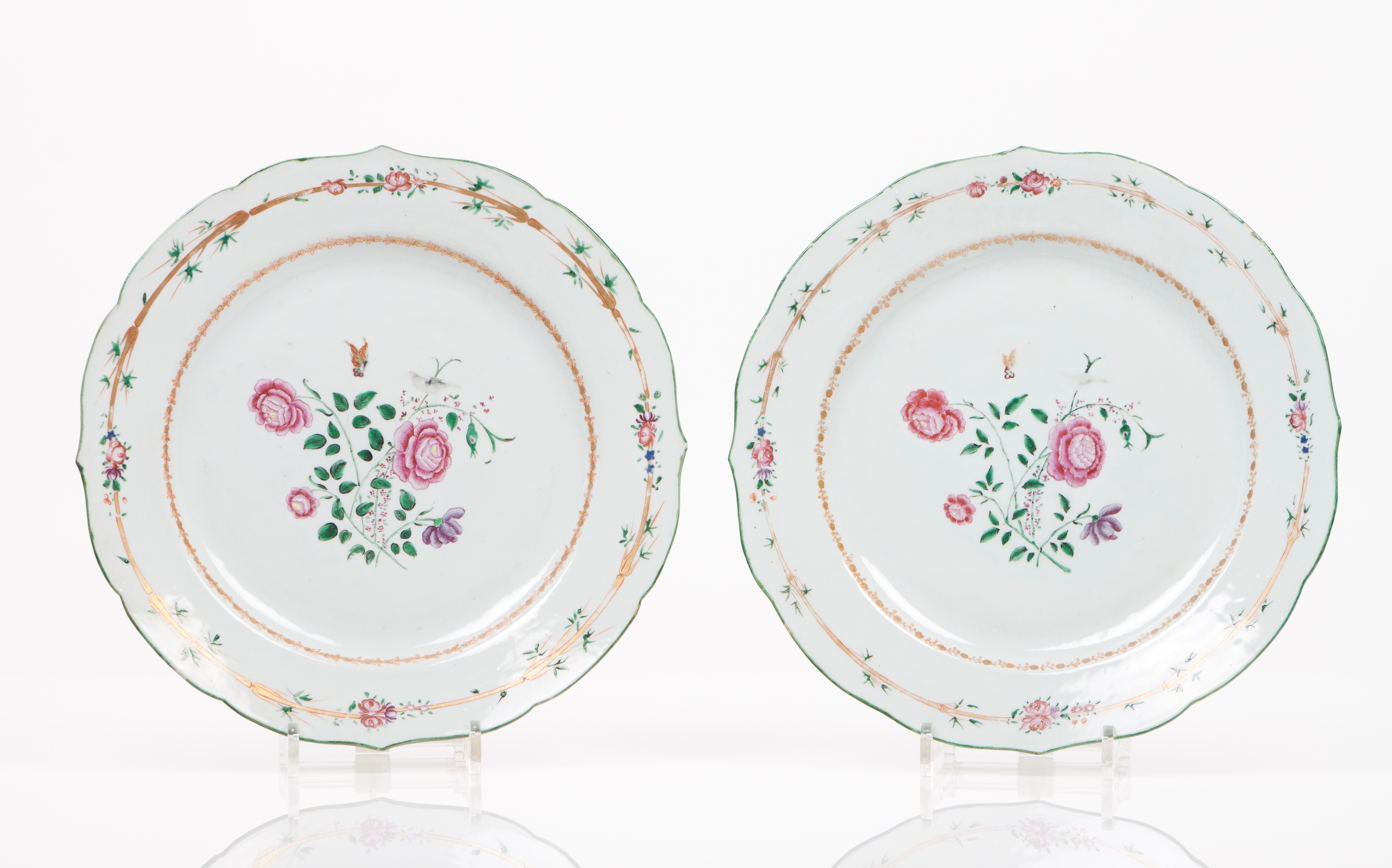 Decoração policromada e dourada com esmaltes da Família Rosa representando flores
