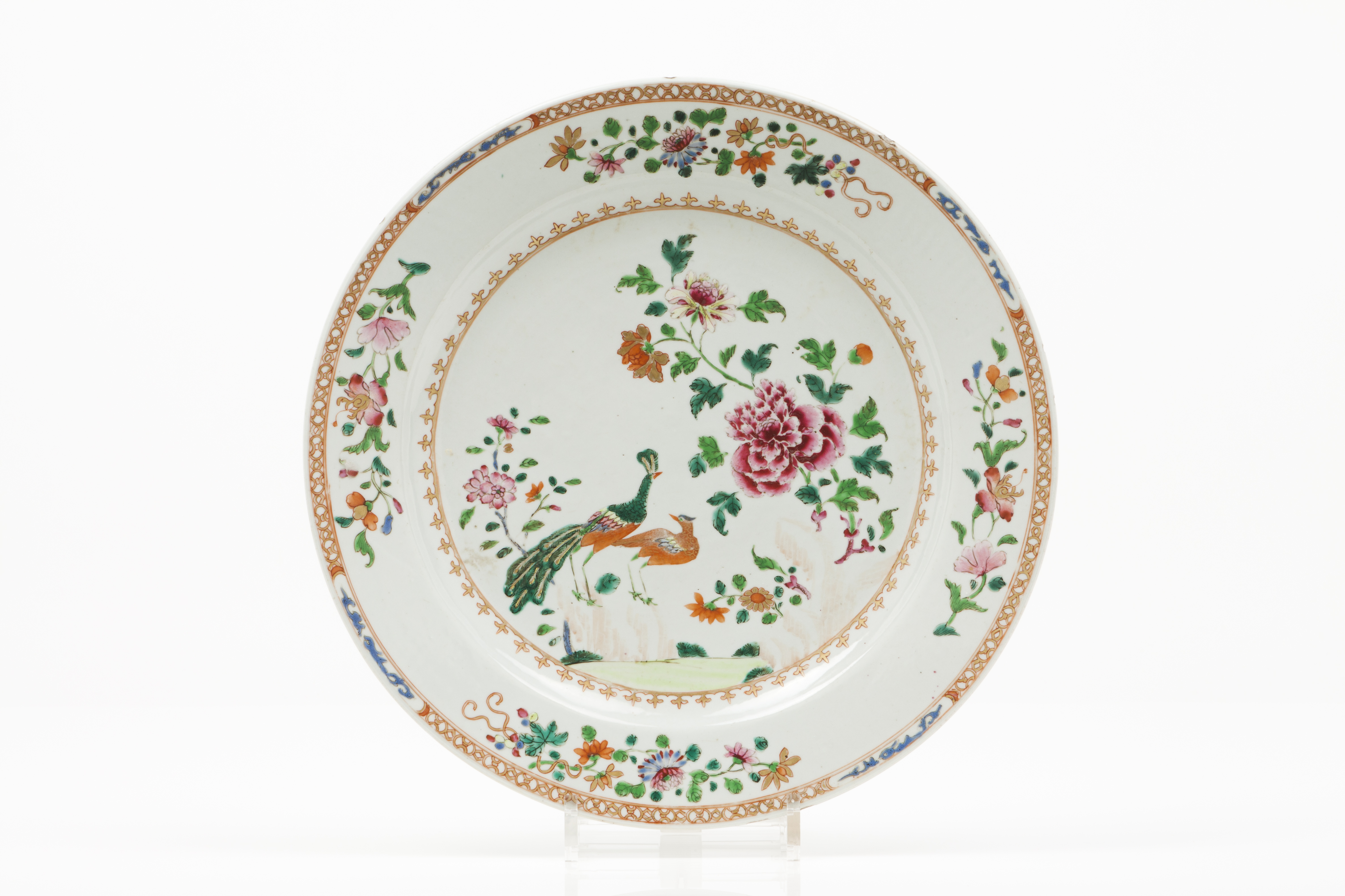 Decoração policromada com esmaltes da Família Rosa representando vista de jardim com pavões