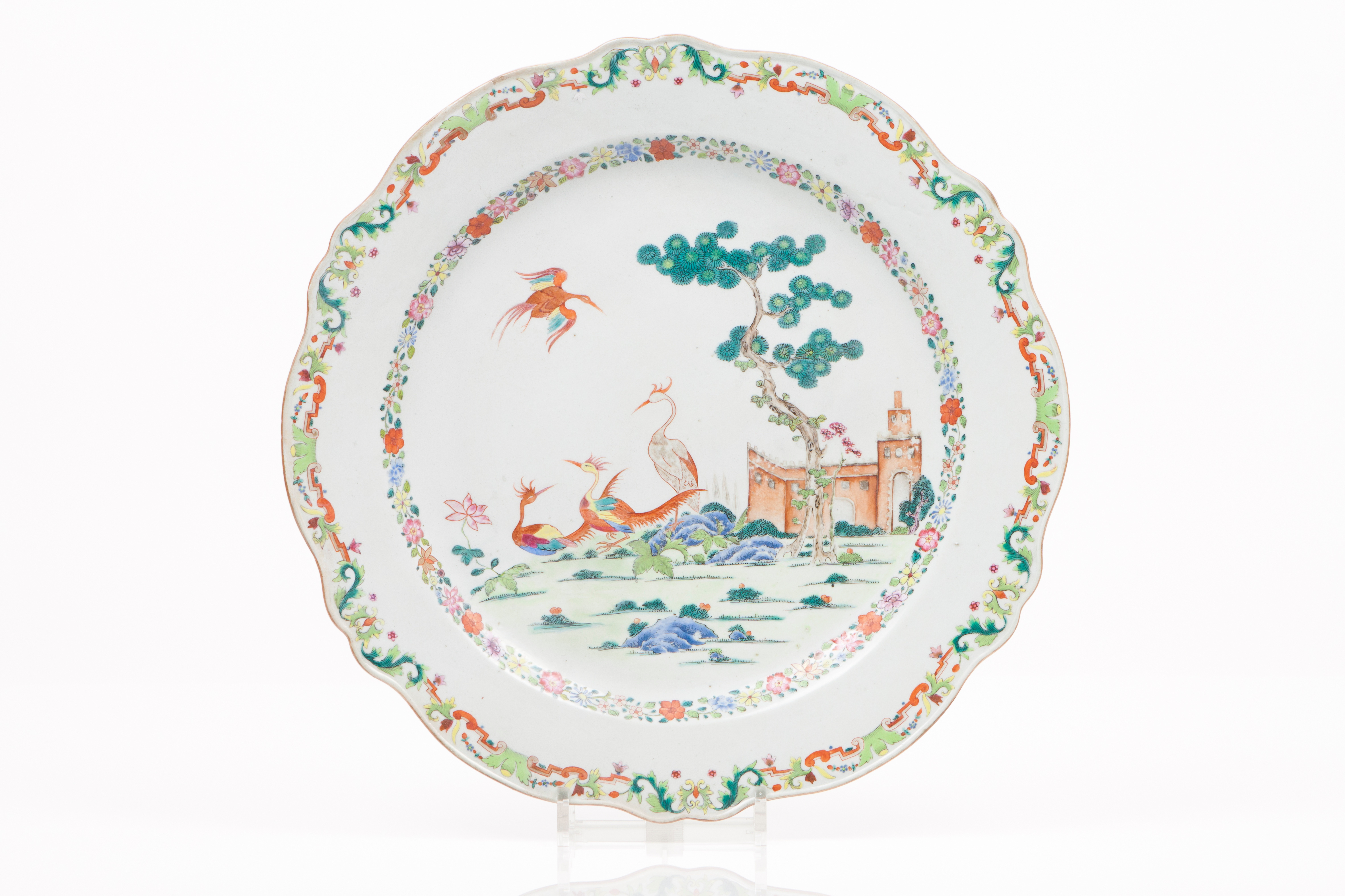 Decoração policromada com esmaltes da Família Rosa representando paisagem com pássaros e fortificação