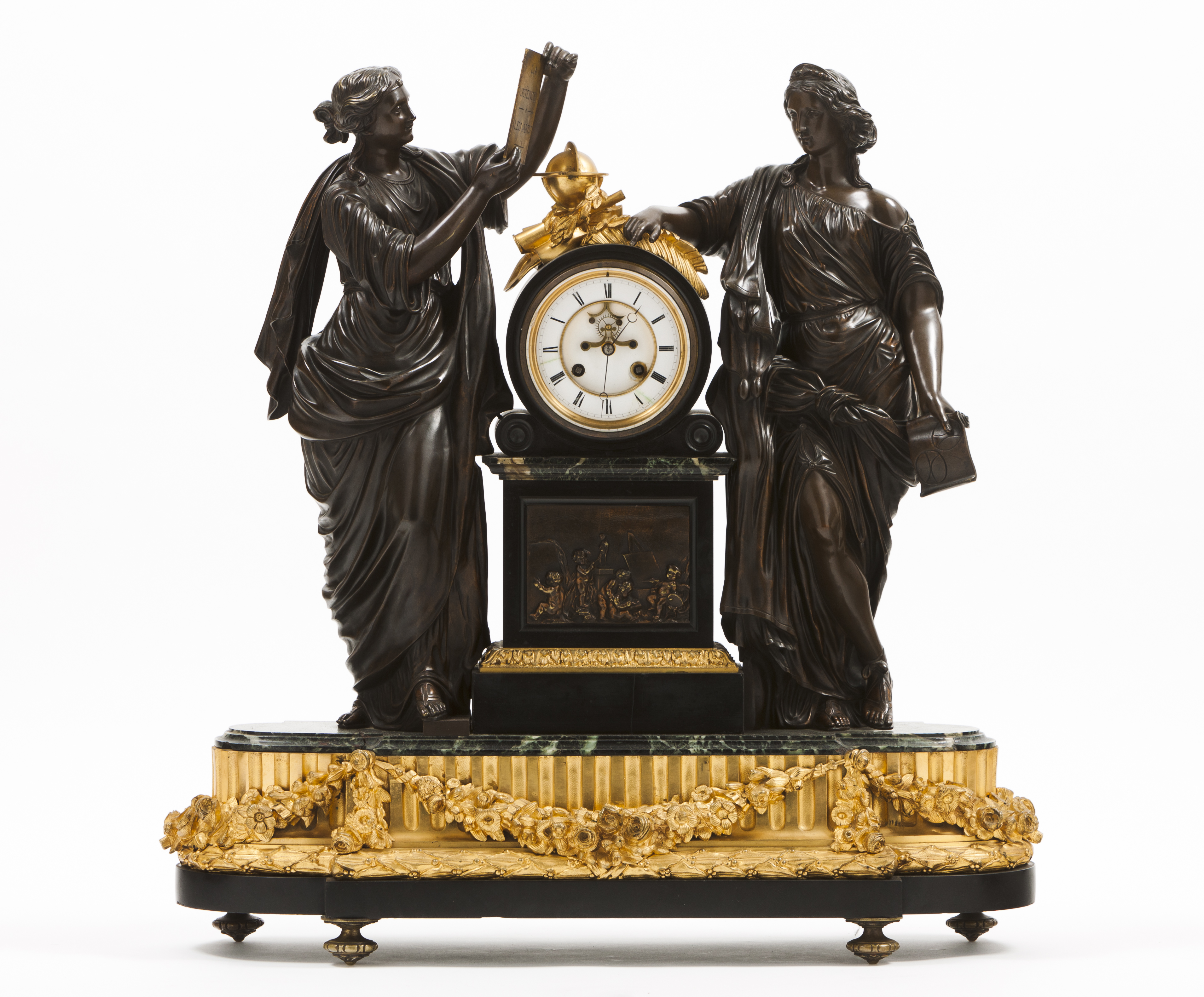 Mostrador em esmalte, com numeração romana, enquadrado por duas figuras alusivas à ciência e às artes, possivelmente Clio e Caliope, e encimado por troféu