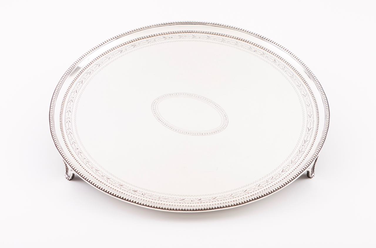 Decoração perlada e com frisos neoclássicos gravados, assente sobre três pés perlados