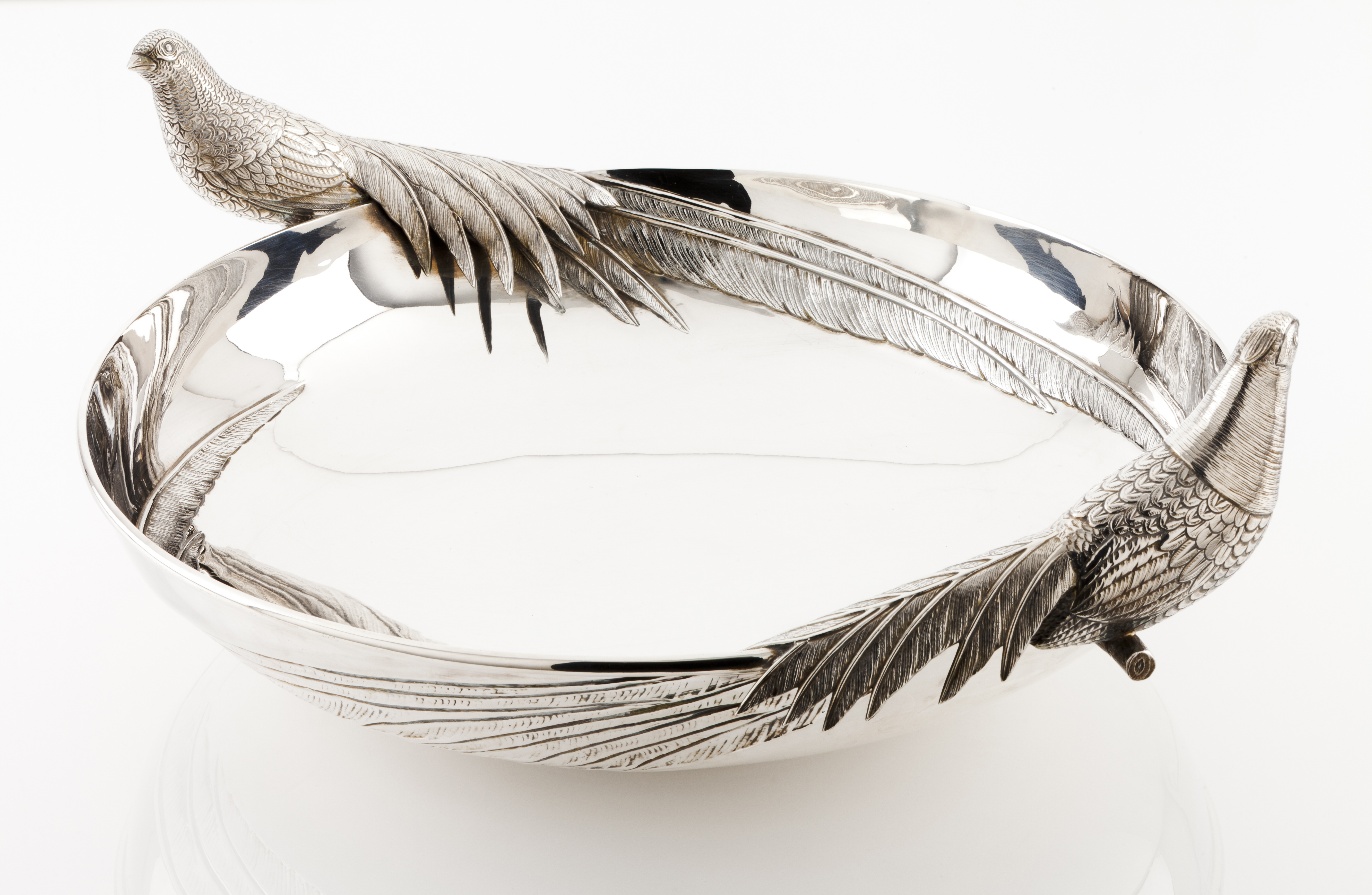 Decorado com casal de pavões em vulto perfeito assentes no bordo e cujas caudas se prolongam para o interior da taça em trabalho gravado e cinzelado