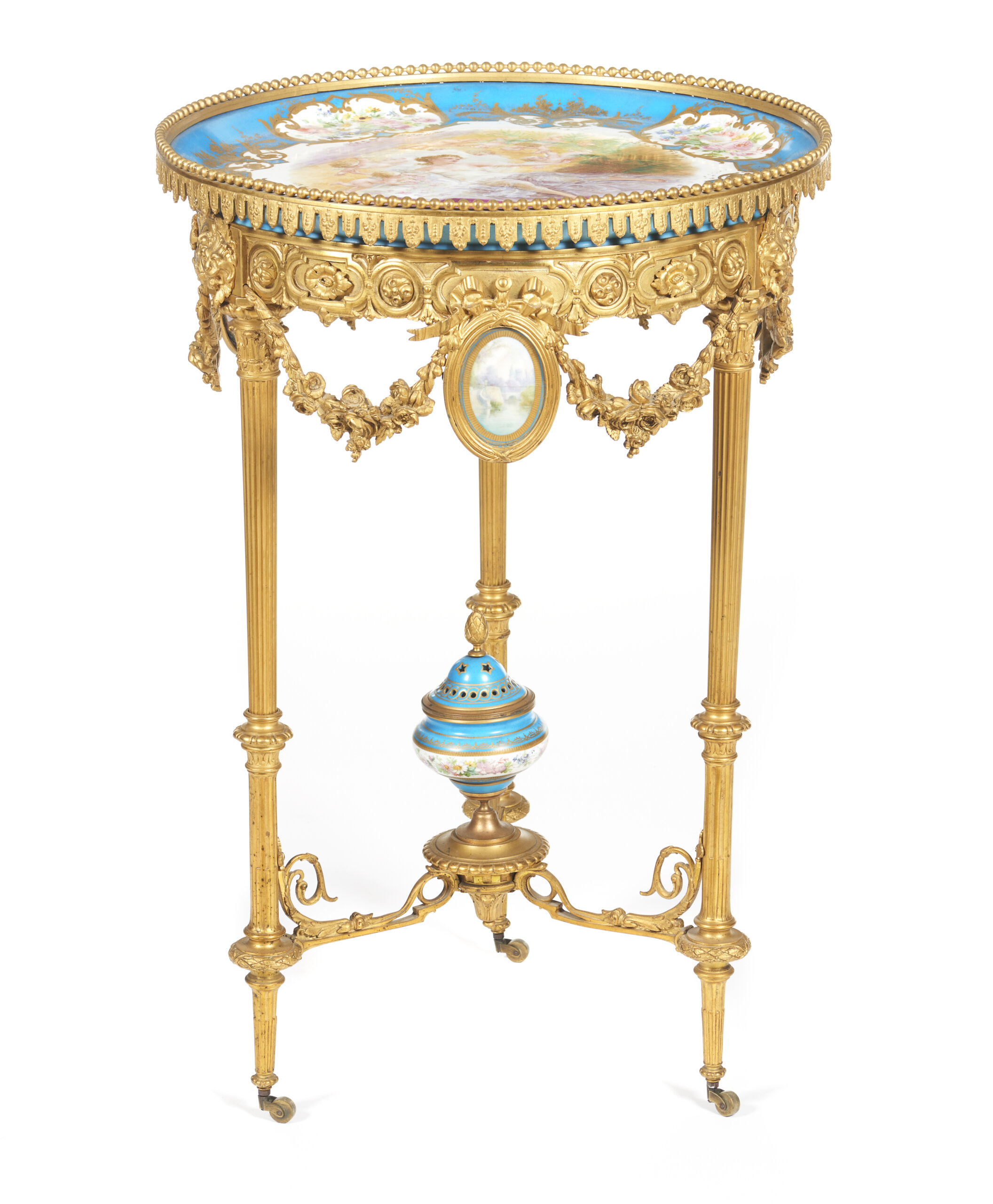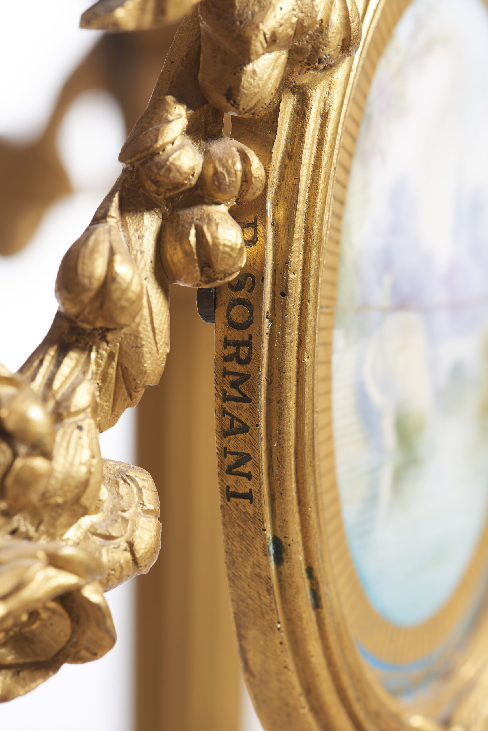 Em bronze dourado e relevado e porcelana
