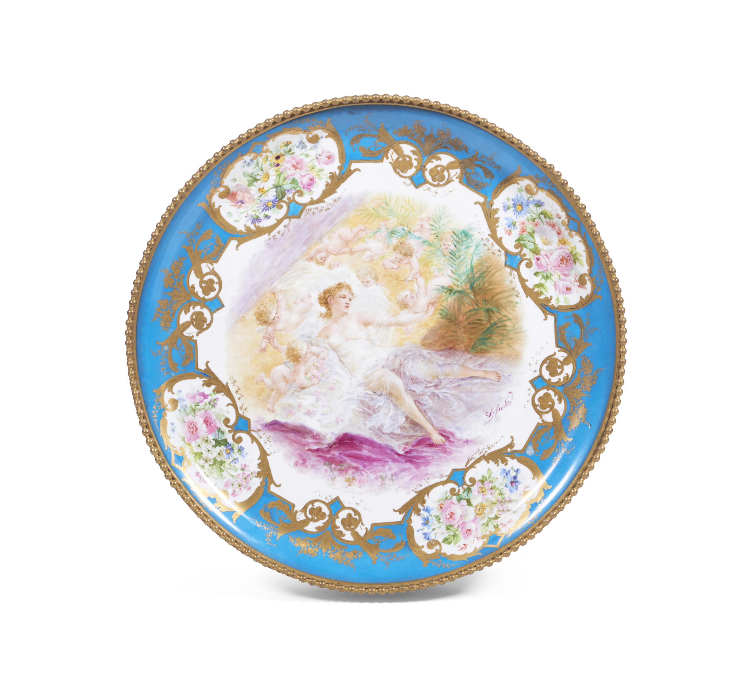 Tampo em porcelana, com decoração policromada e dourada representando "O Nascimento de Vénus" enquadrado por quatro medalhões florais com fundo em azul-celeste