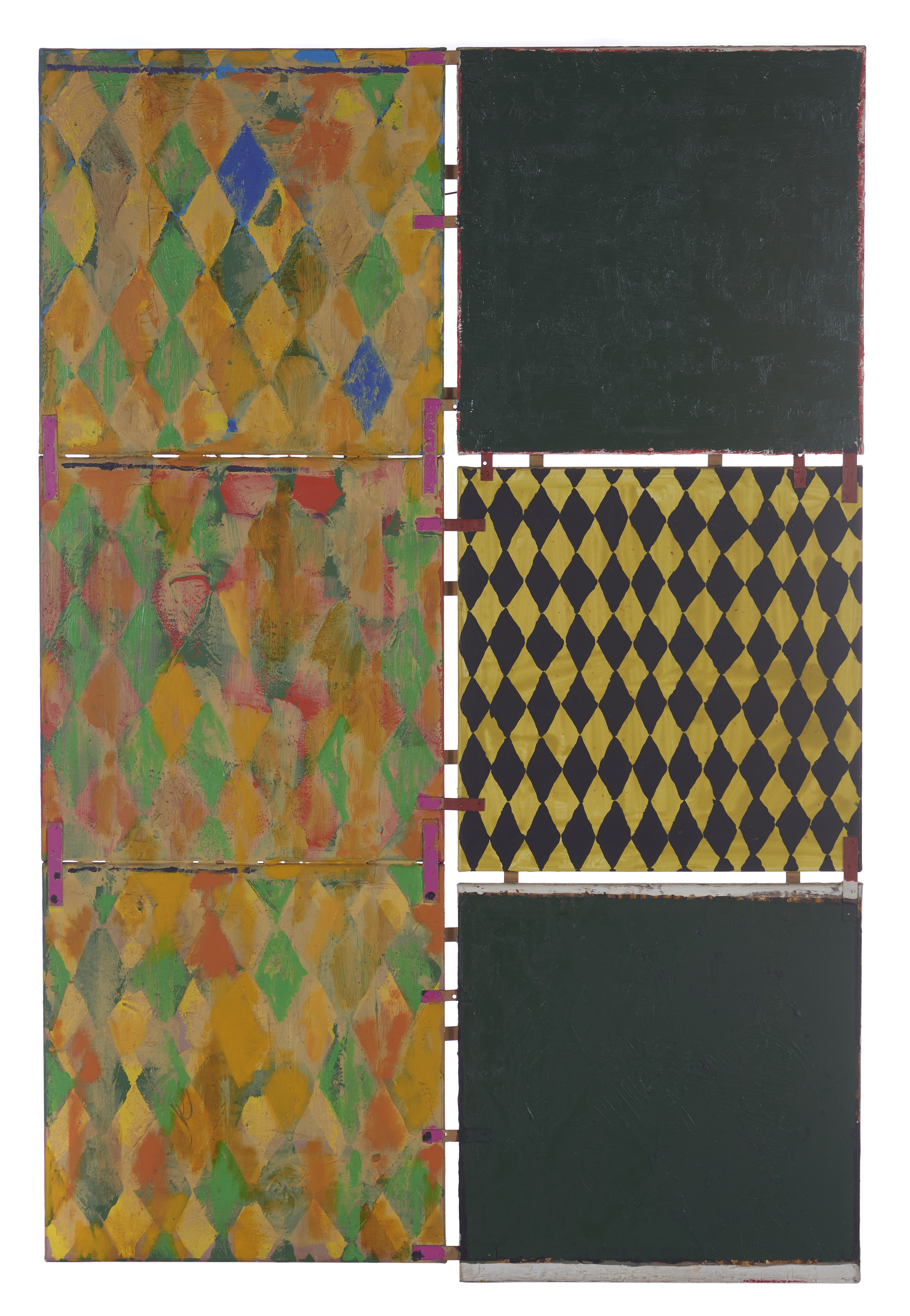 Acrílico e óleo sobre tela, barras de aço, pó de pedra pomos e pó de mármore