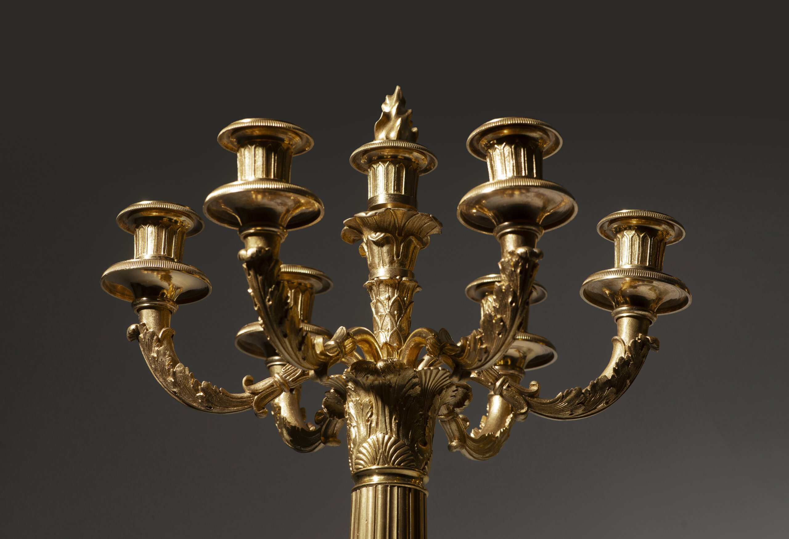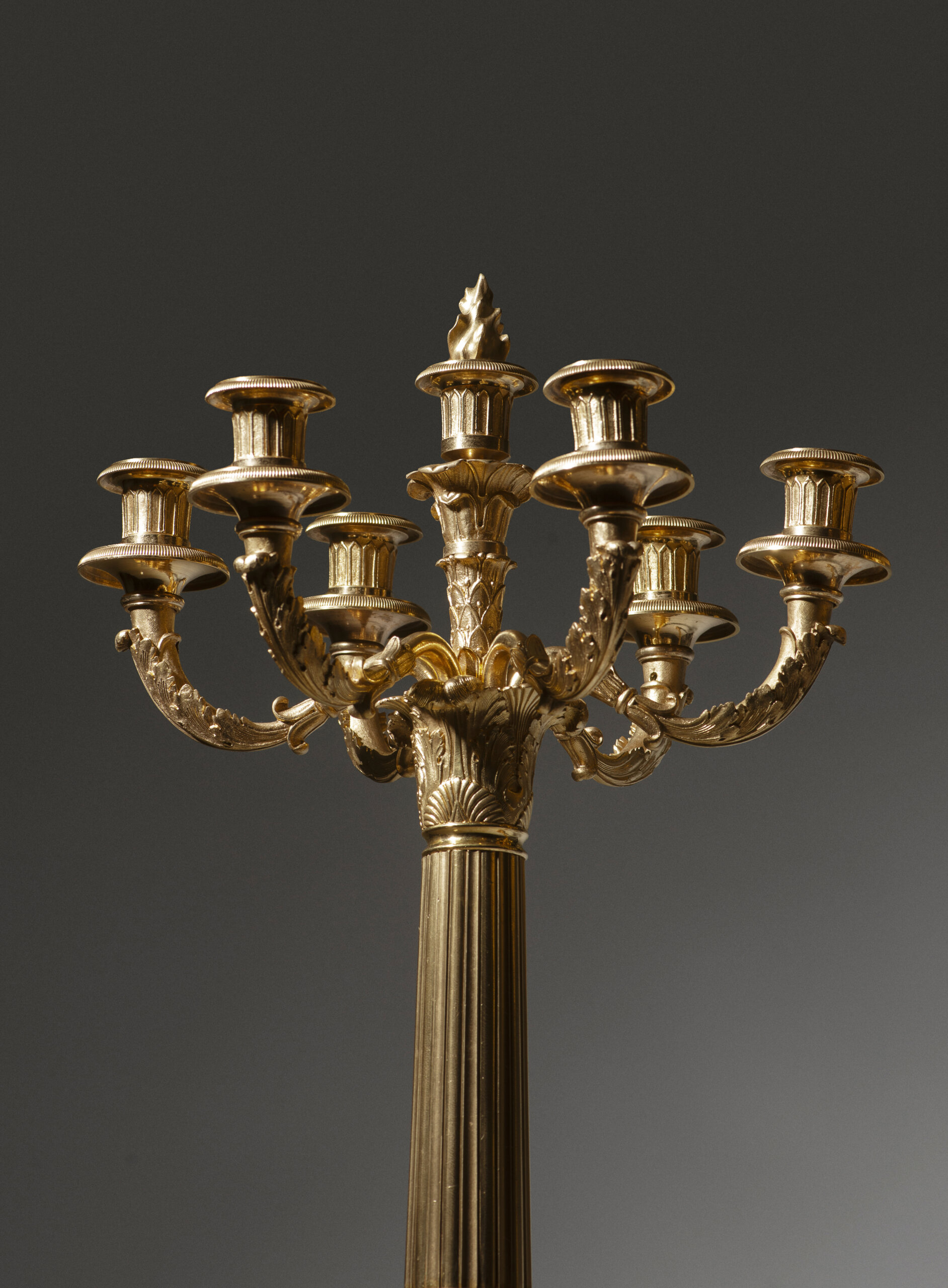 Cada candelabro com seis braços curvos, decorados com folhas de acanto e encimados por binets canelados, com bobeches amovíveis