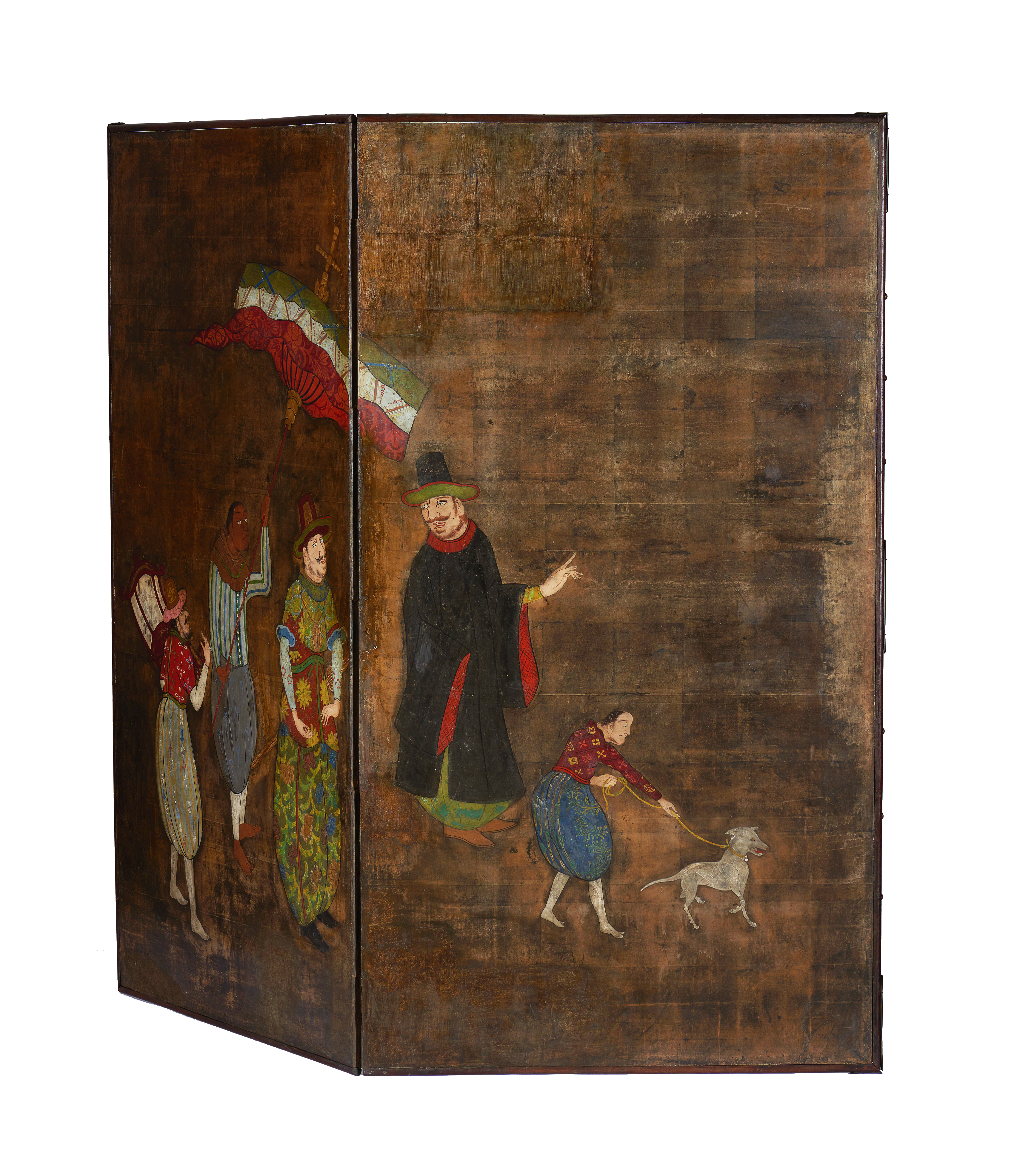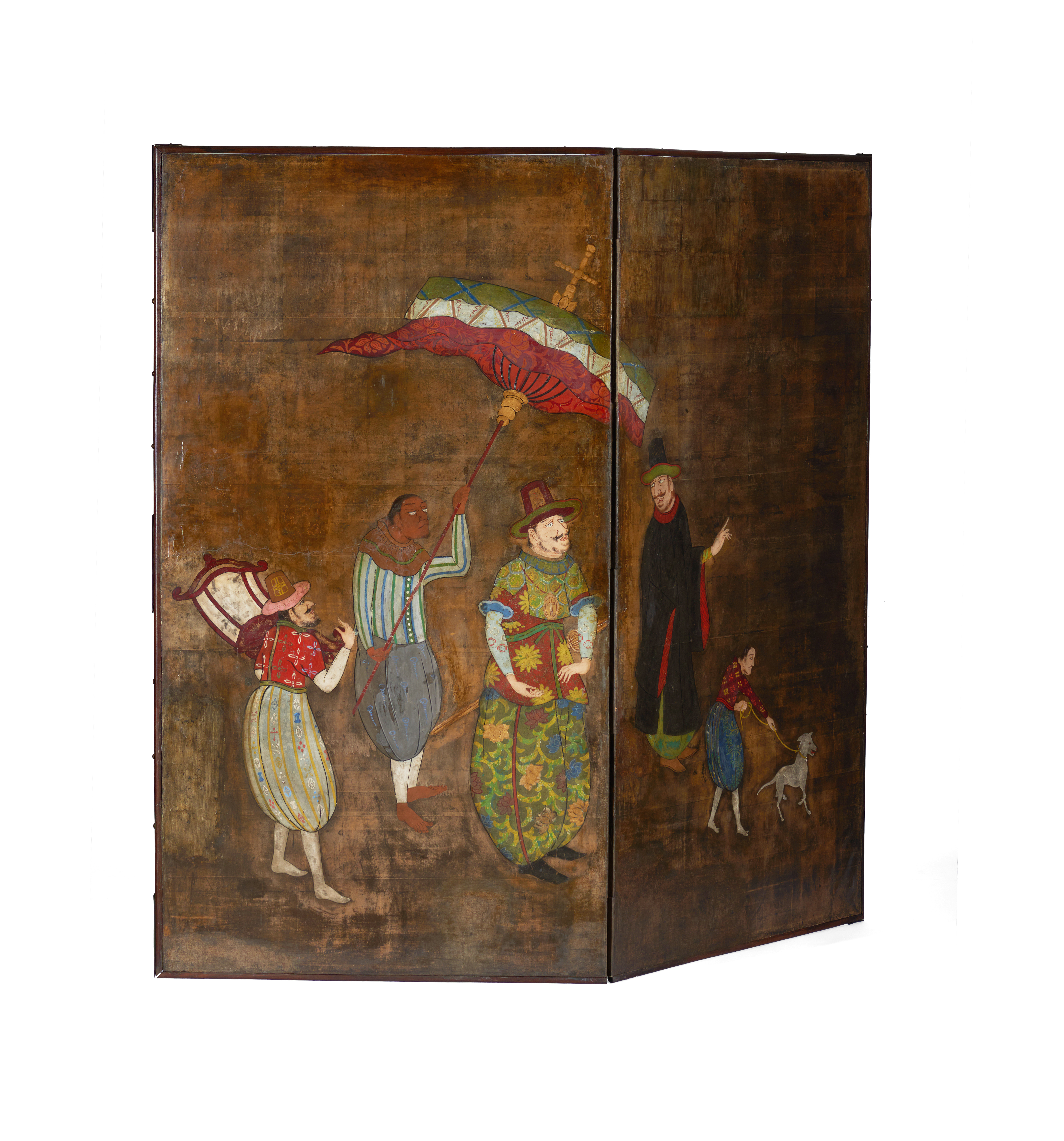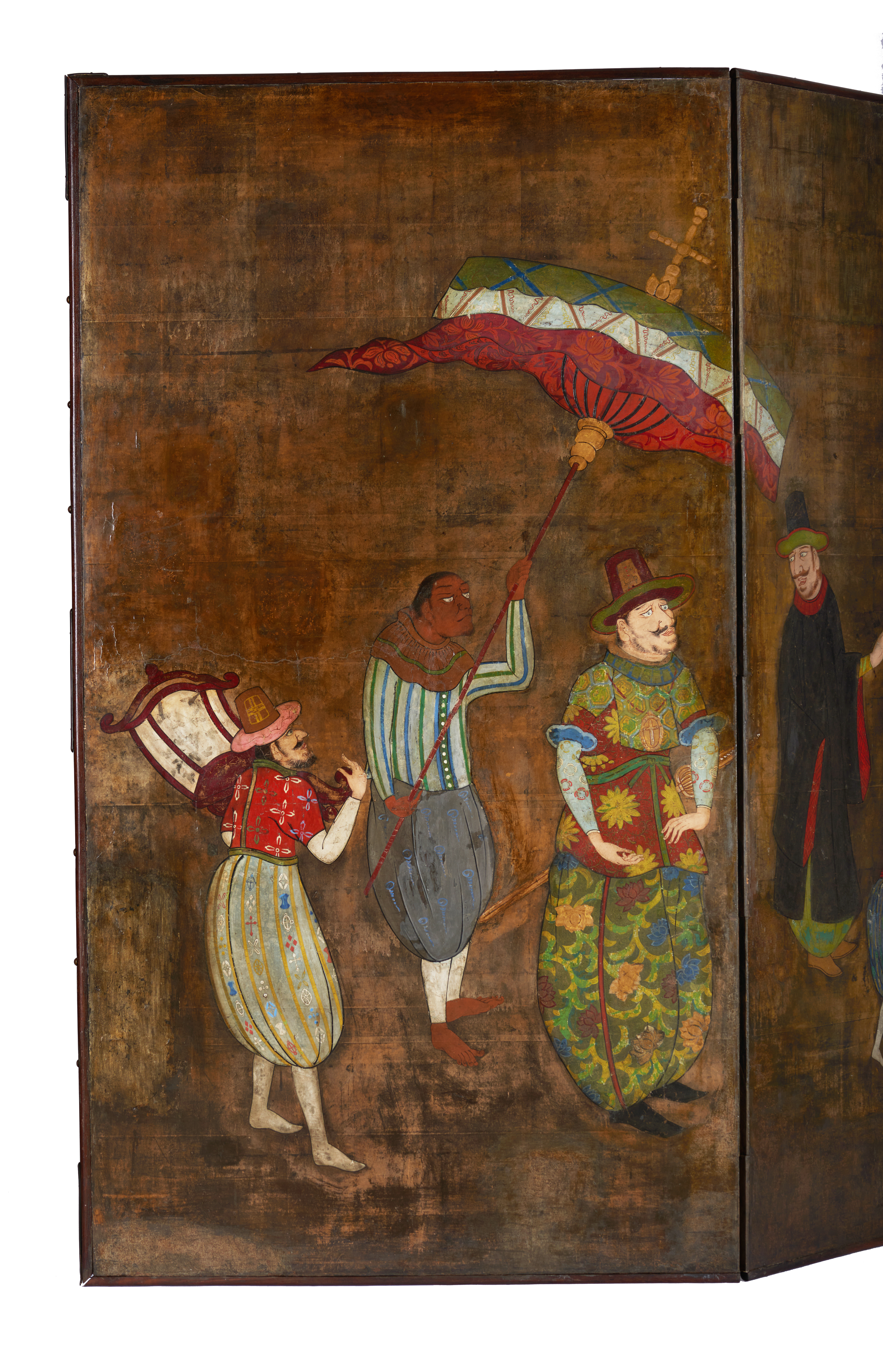 O episódio representado neste biombo (byobu) de duas folhas, retrata cinco personagens de pé, quatro adultos e um rapaz segurando um cão pela trela, que caminham encabeçando um cortejo. O primeiro, à esquerda, transporta uma cadeira, o segundo segura um grande para- sol com que sombreia o que caminha à sua frente, o qual, por sua vez, é precedido por outro que o olha atentamente. À exceção da figura segurando o para-sol, cujas feições são características do sudoeste asiático, todas as outras representam portugueses que, vestidos com bombachas, camisas justas e chapéus de formato cónico, partilham também características fisionómicas, tais como grandes narizes, olhos salientes, cabelos rebeldes e espessos bigodes.