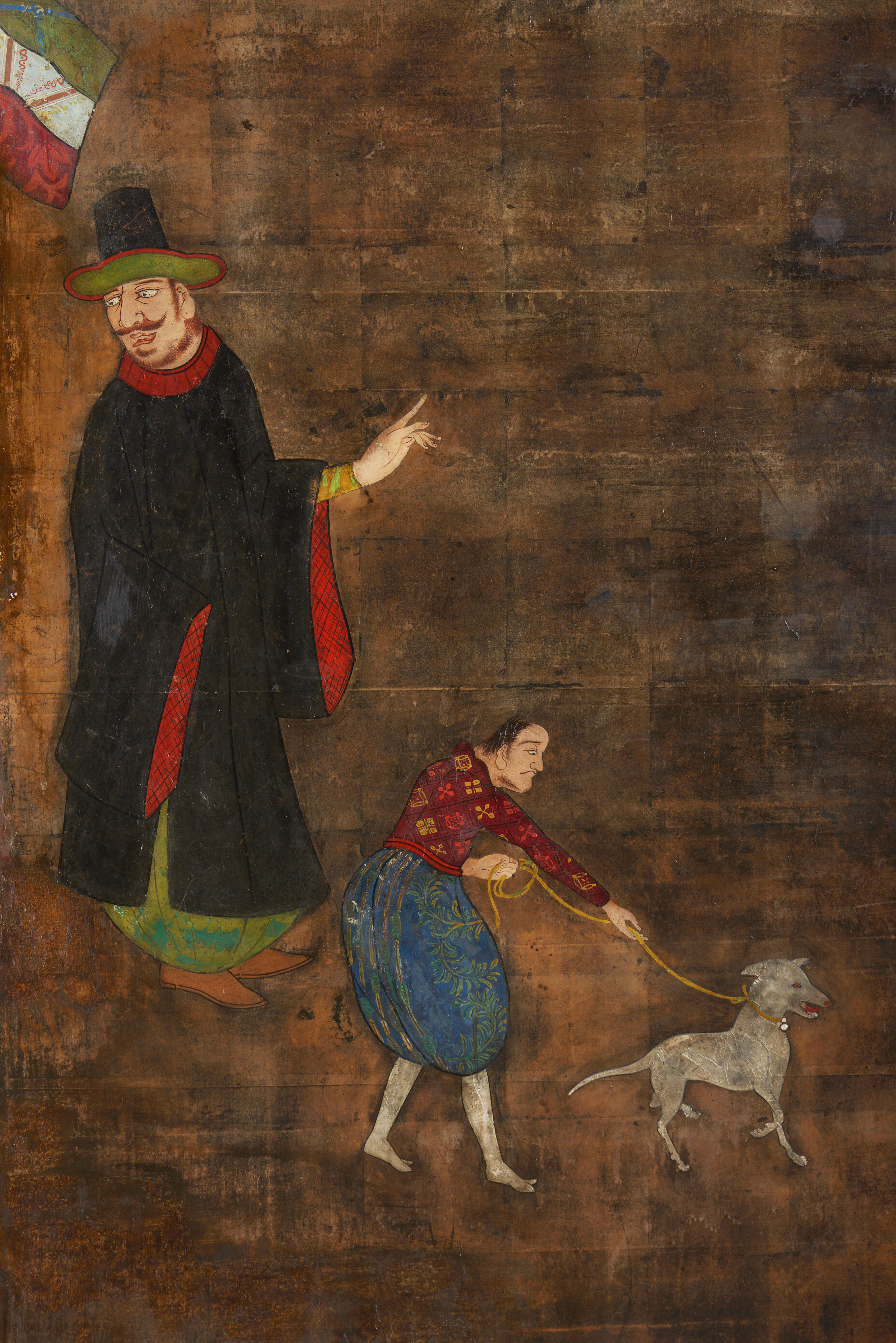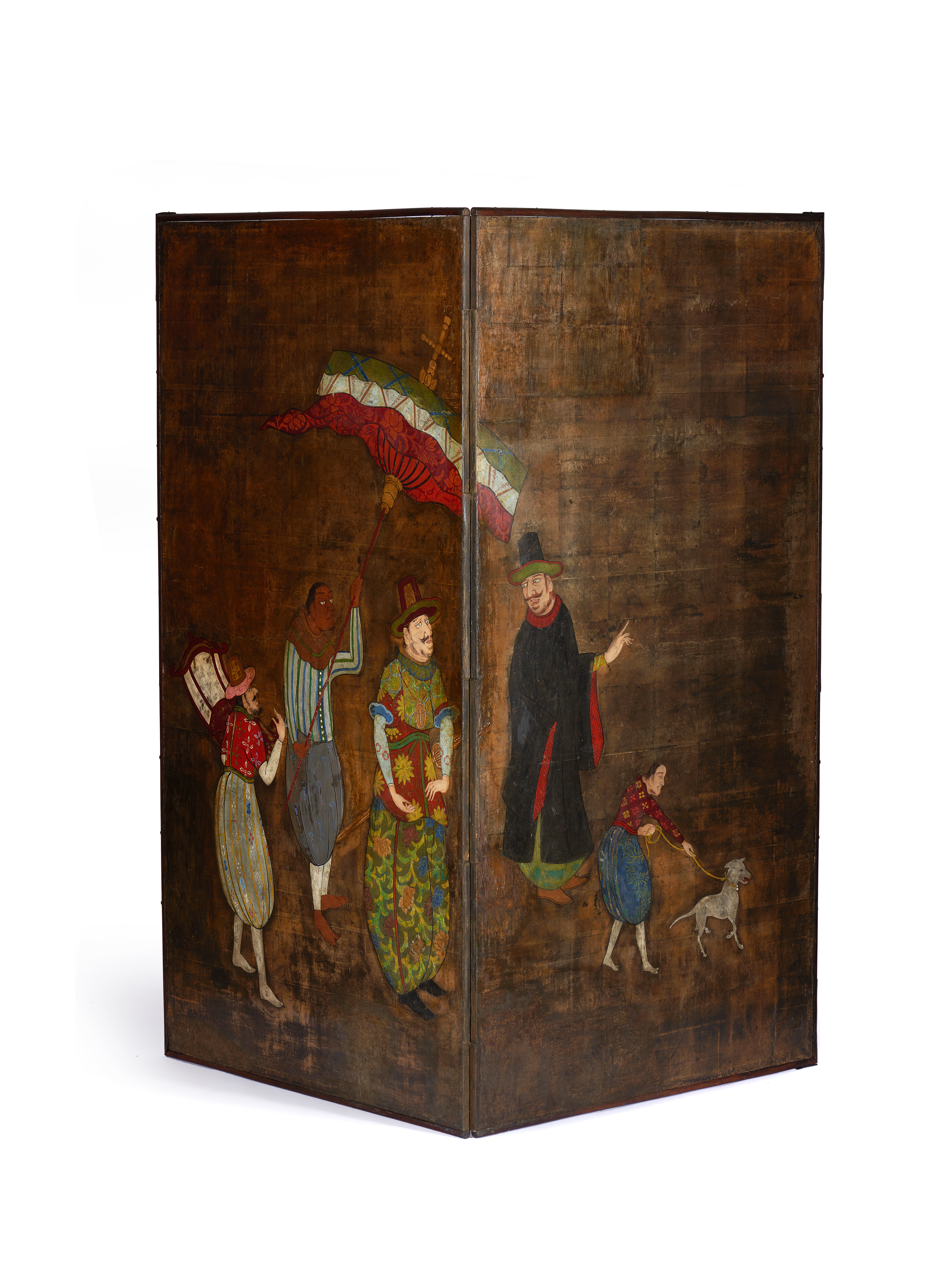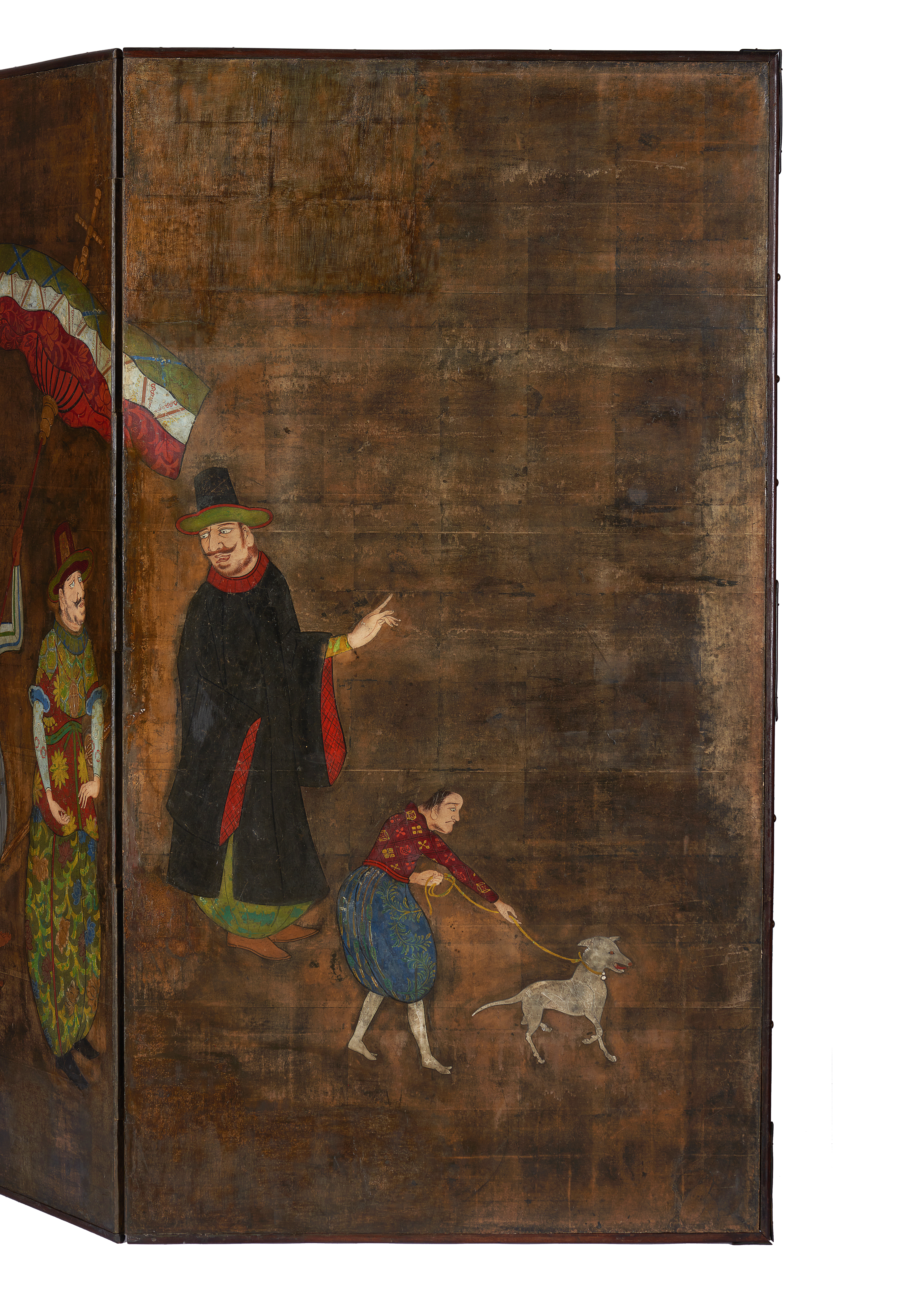 O episódio representado neste biombo (byobu) de duas folhas, retrata cinco personagens de pé, quatro adultos e um rapaz segurando um cão pela trela, que caminham encabeçando um cortejo. O primeiro, à esquerda, transporta uma cadeira, o segundo segura um grande para- sol com que sombreia o que caminha à sua frente, o qual, por sua vez, é precedido por outro que o olha atentamente. À exceção da figura segurando o para-sol, cujas feições são características do sudoeste asiático, todas as outras representam portugueses que, vestidos com bombachas, camisas justas e chapéus de formato cónico, partilham também características fisionómicas, tais como grandes narizes, olhos salientes, cabelos rebeldes e espessos bigodes.