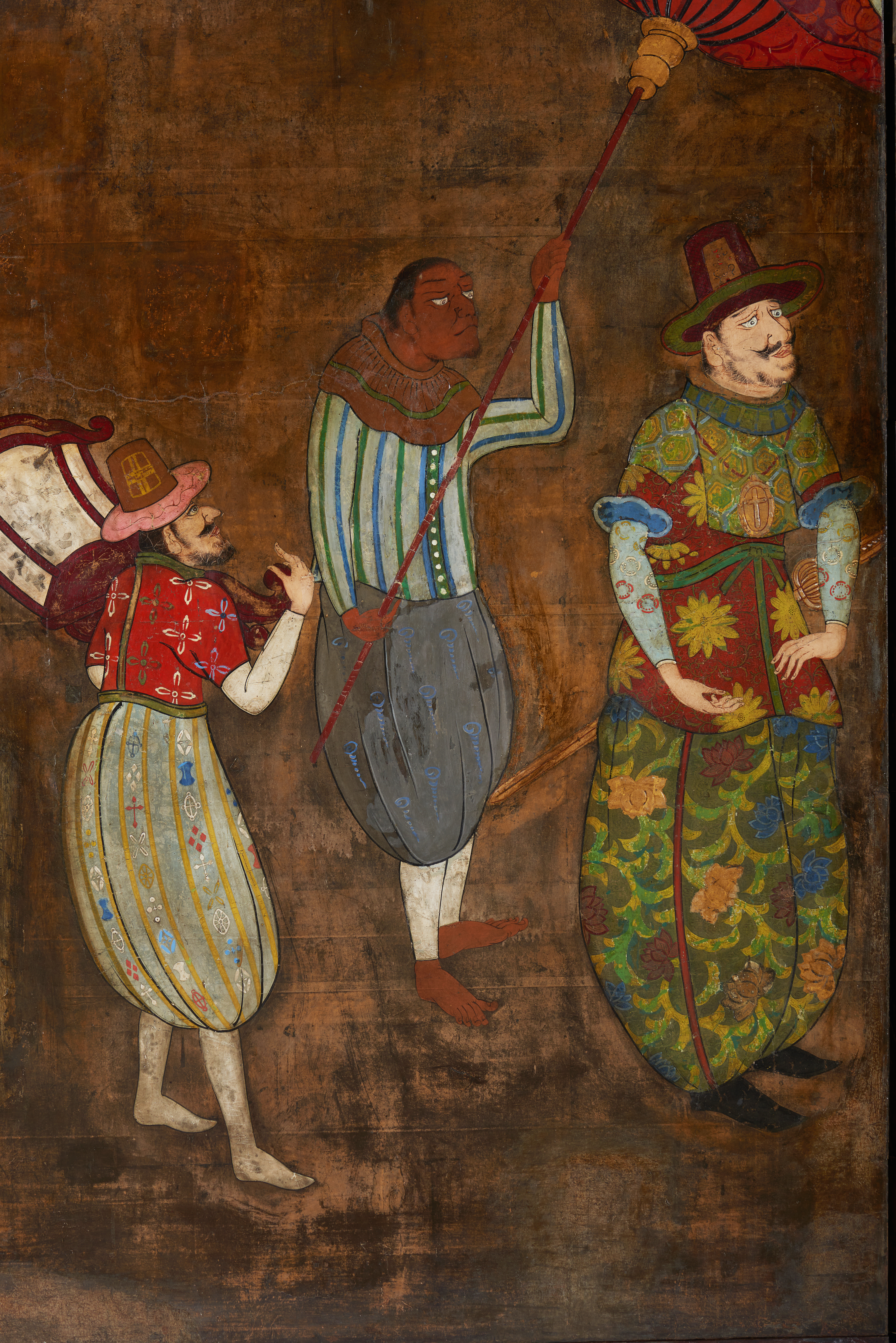 para as suas expressões extrovertidas. Os padrões do vestuário são representados em policromia com grande mestria, e os trajes dos dignitários são enriquecidos a ouro em relevo acentuado, uma solução adotada para enfatizar o seu estatuto social. A variedade de padrões, e as suas características vagamente ocidentais, comprovam que os artistas tinham algum conhecimento do trajar europeu. A decisão de introduzir uma figura com capa, a típica capa negra portuguesa, é coerente com este conhecimento. Um outro motivo recorrente é a cruz Cristã, que aparece nas bombachas e casaco da figura que transporta a cadeira, na camisa do jovem, no notável para-sol e, principalmente, no centro do grande medalhão suspenso ao pescoço do dignitário.