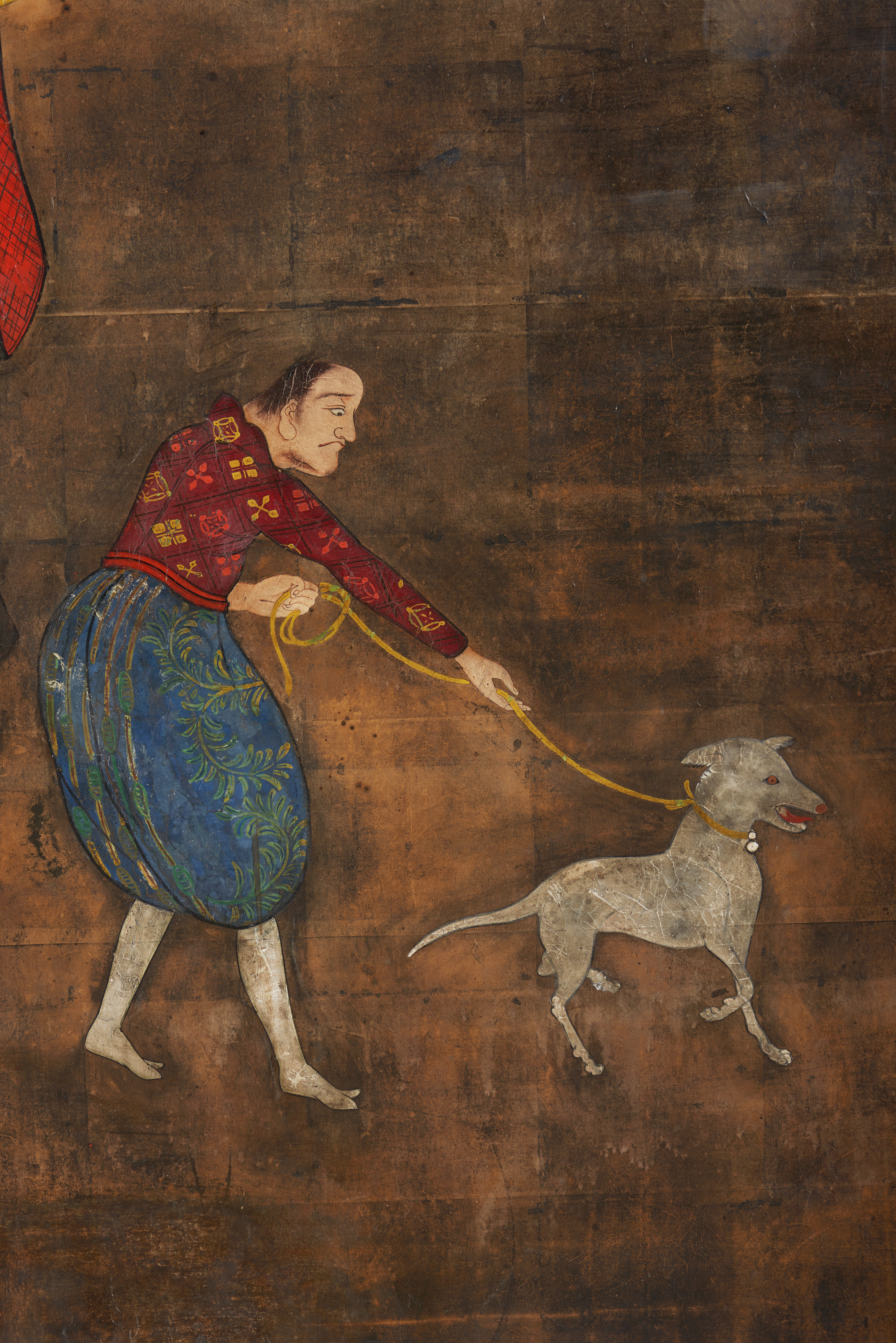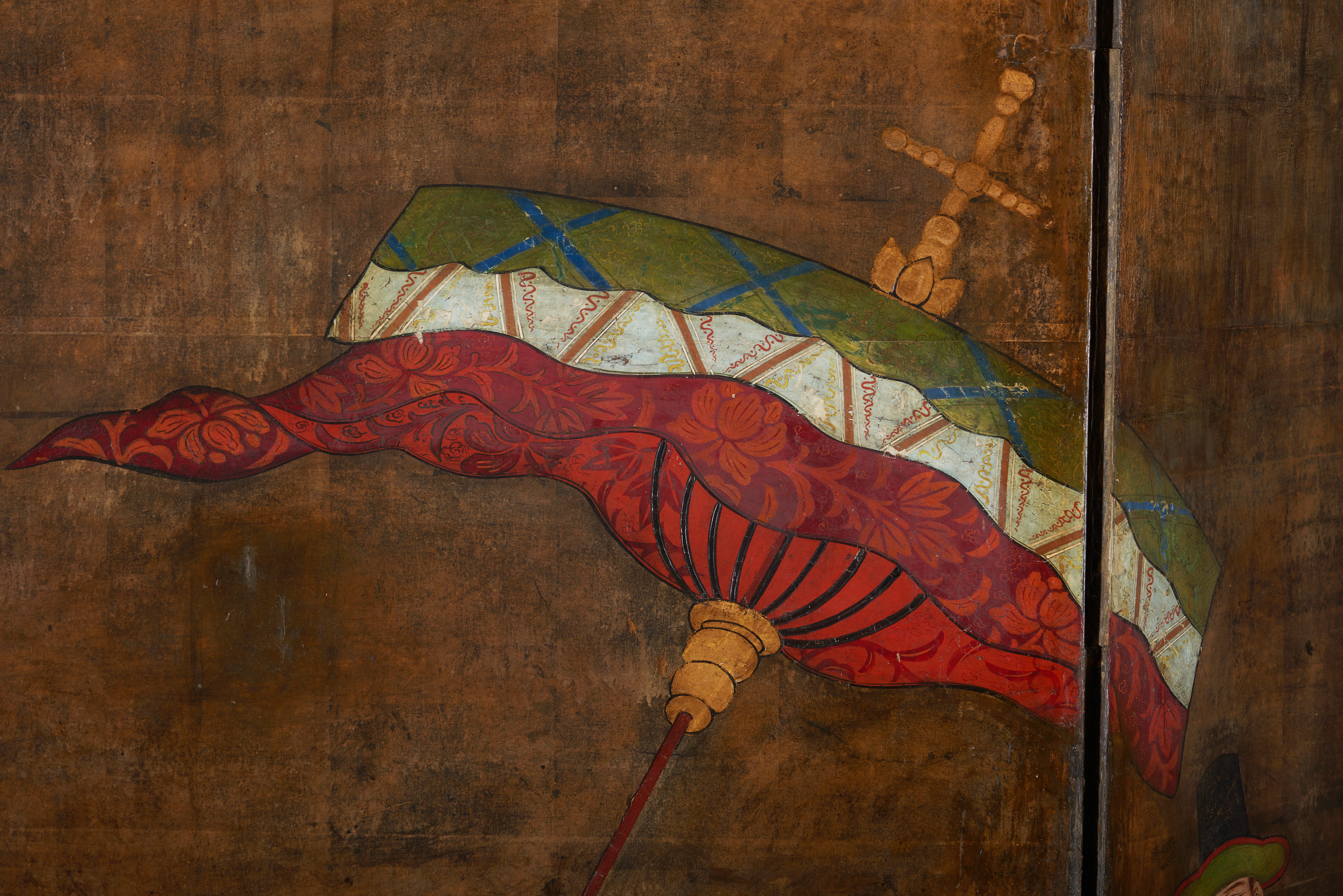A cena ilustrada no exemplar que apresentamos encaixa perfeitamente na descrição que acabamos de fazer, diferenciando-se exclusivamente pelo facto de se focar na frente do cortejo, pela ausência de um contexto (originalmente poderia ter tido um cenário que foi, entretanto, ocultado), pela dimensão das figuras, consideravelmente maiores do que as habitualmente retratadas em outros biombos com maior número de figuras e composições de maior complexidade.
