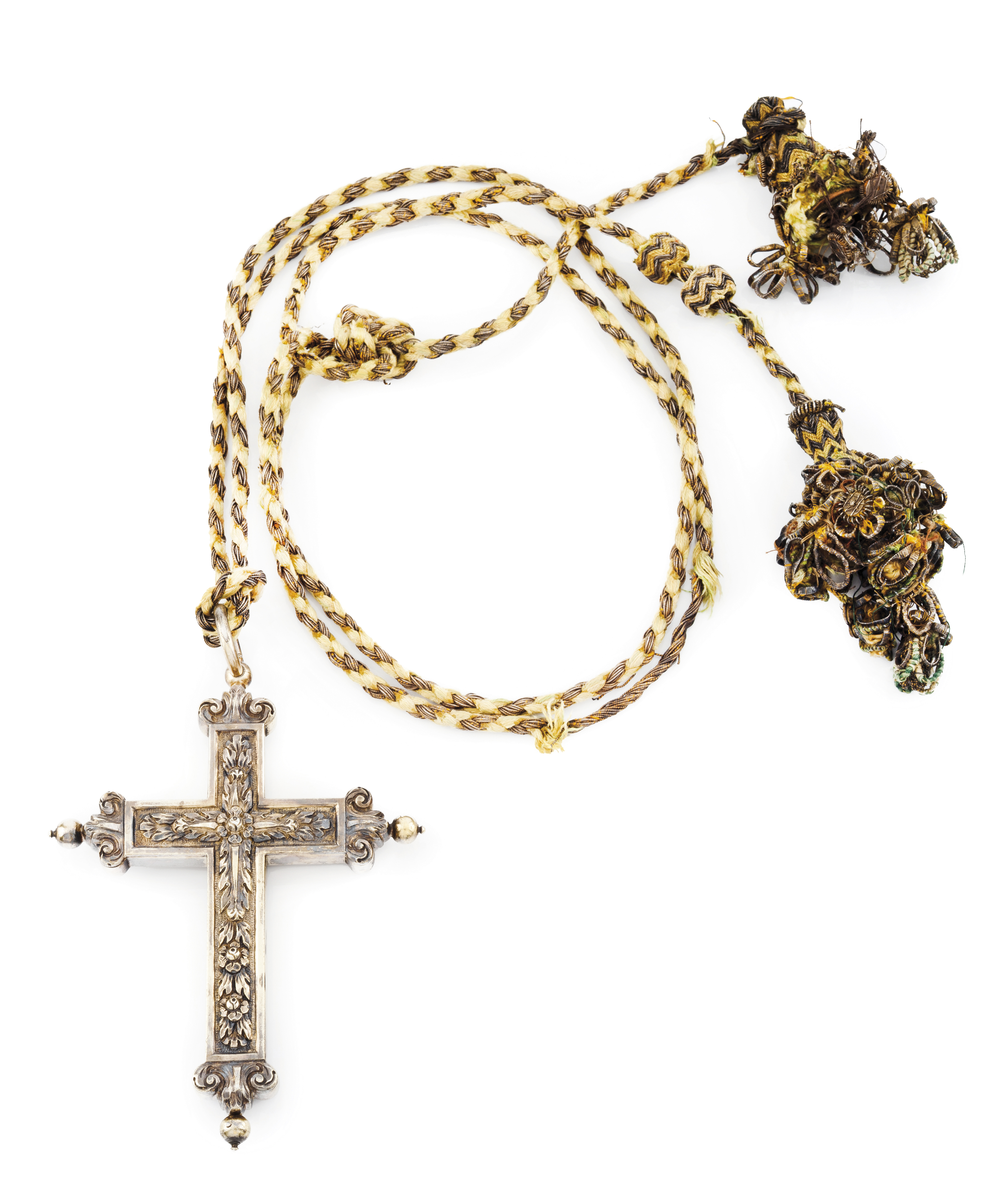 Cruz representada por elementos vegetalistas em ambas as faces com remates em enrolamentos com esferas que são a cabeça dos parafusos para abertura do relicário